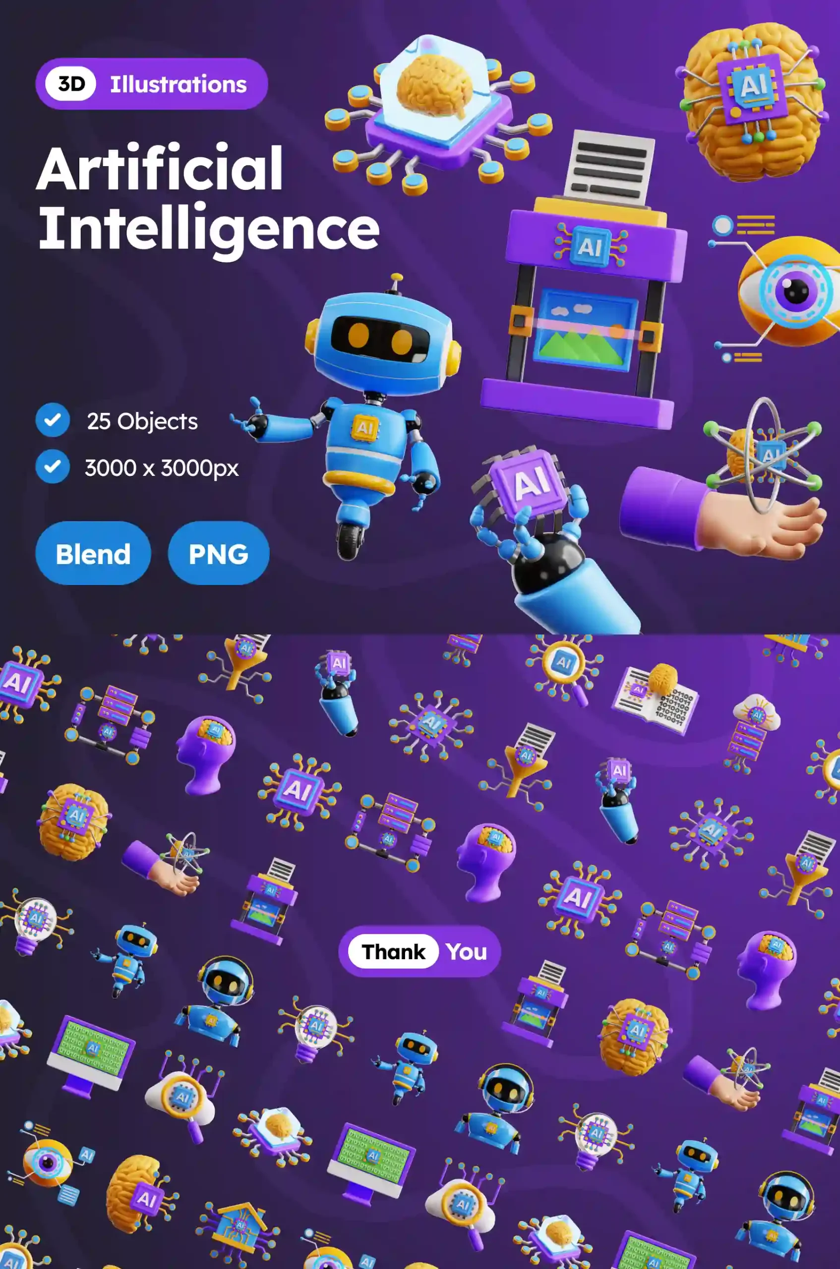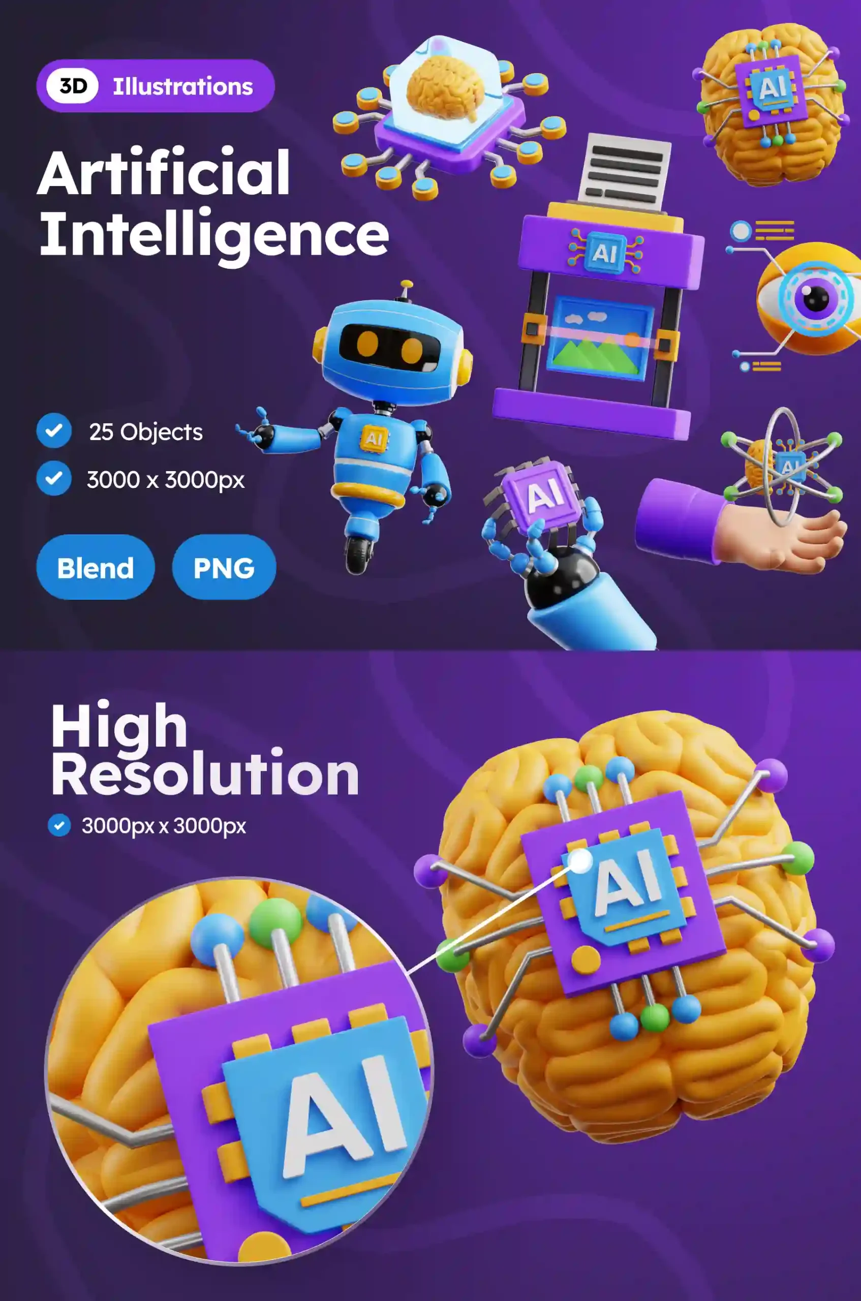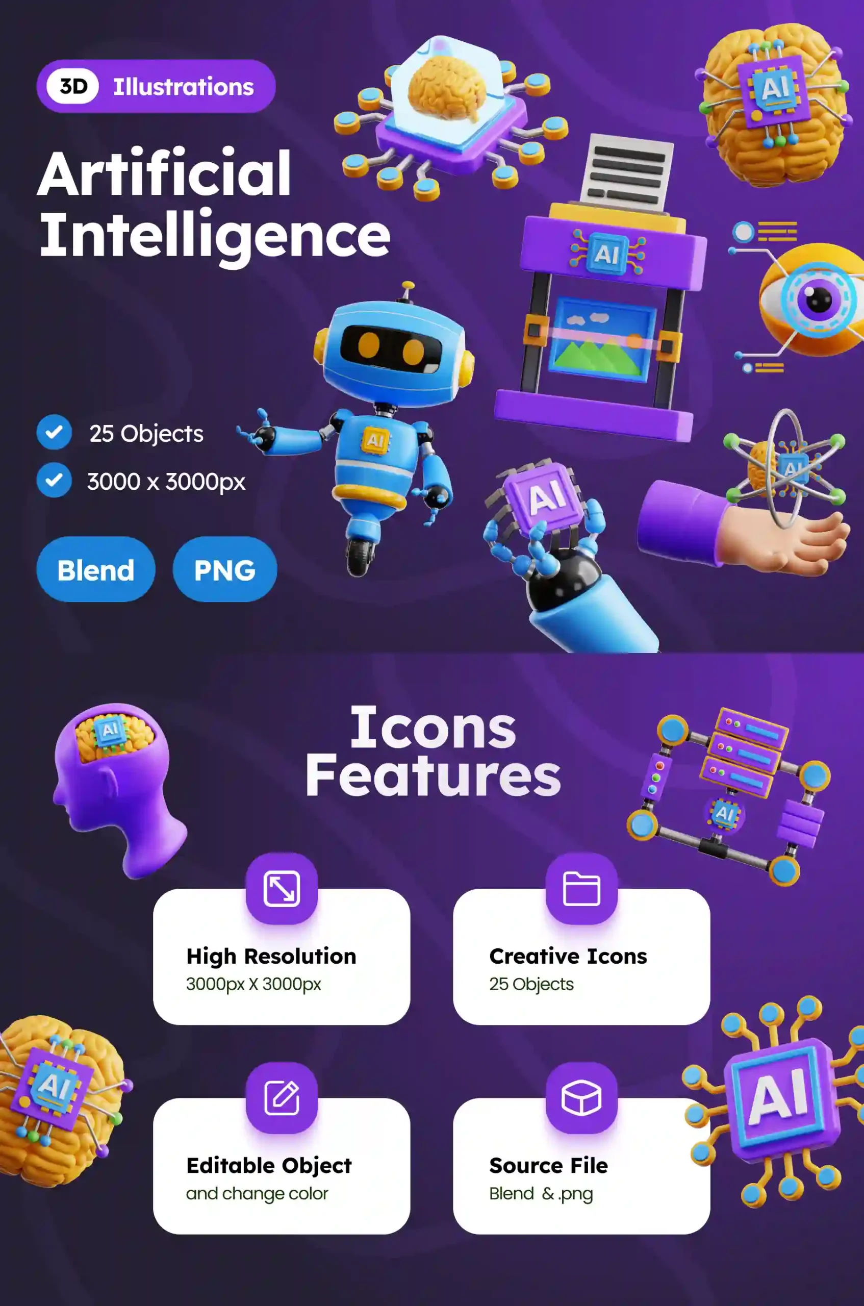 Artificial Intelligence 3D Icons can be used for design needs, animation,