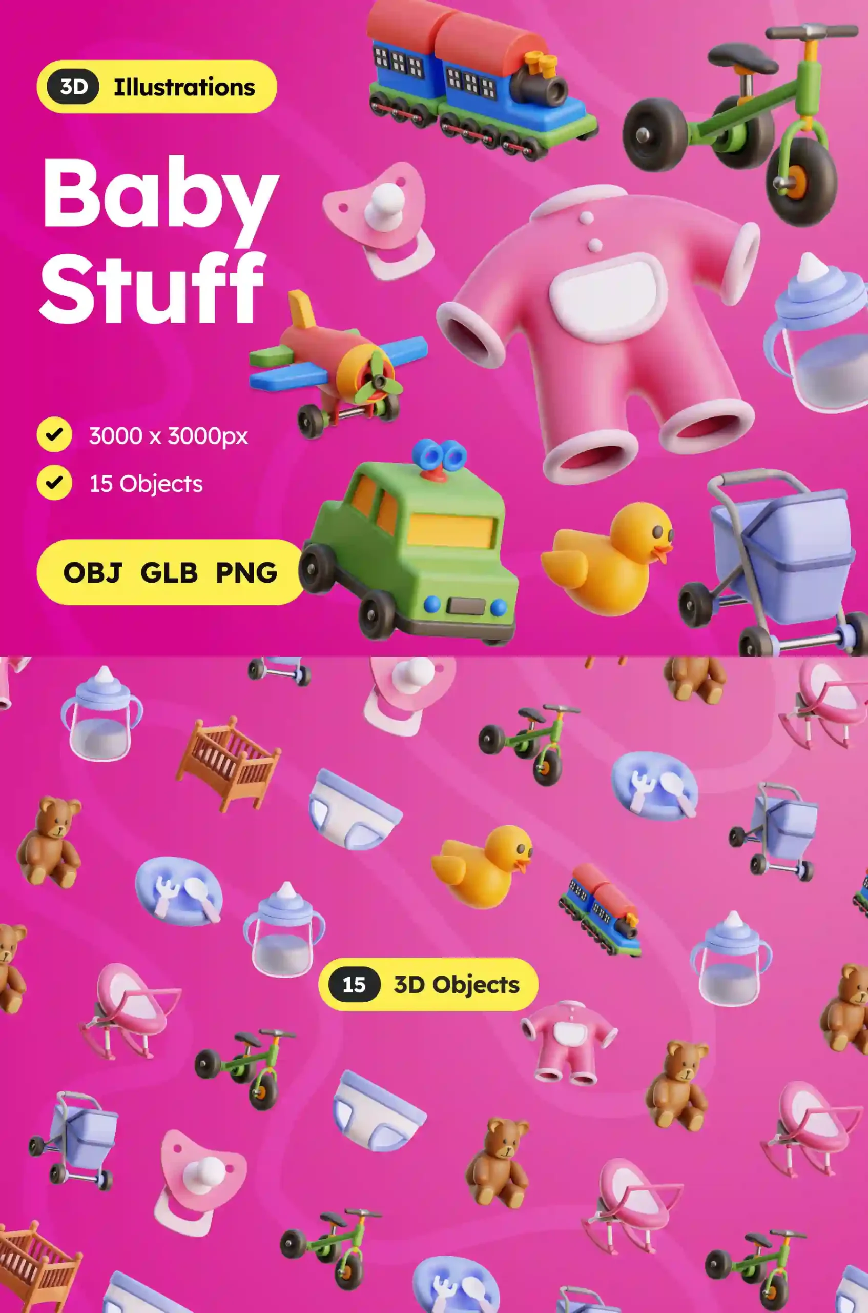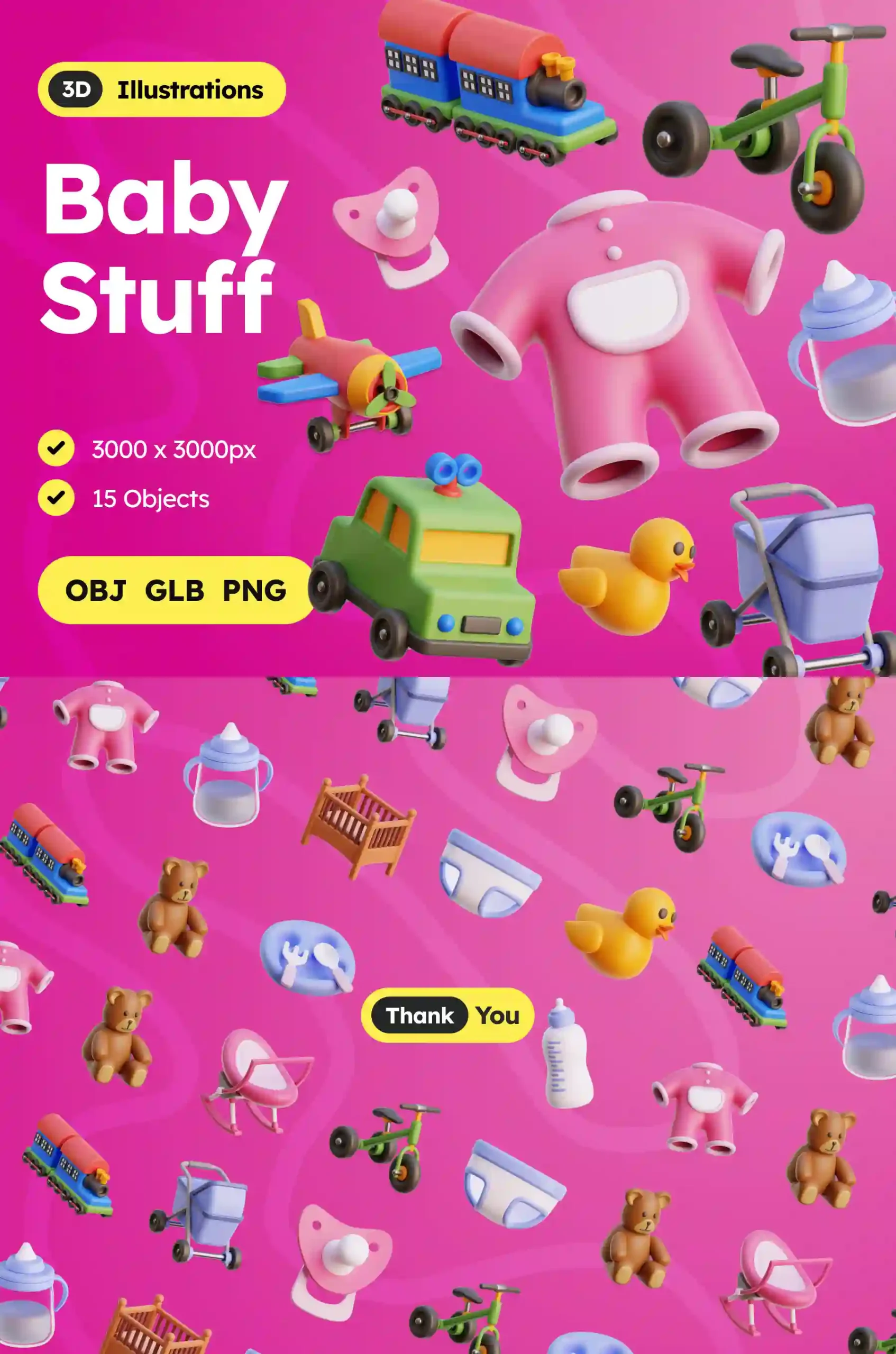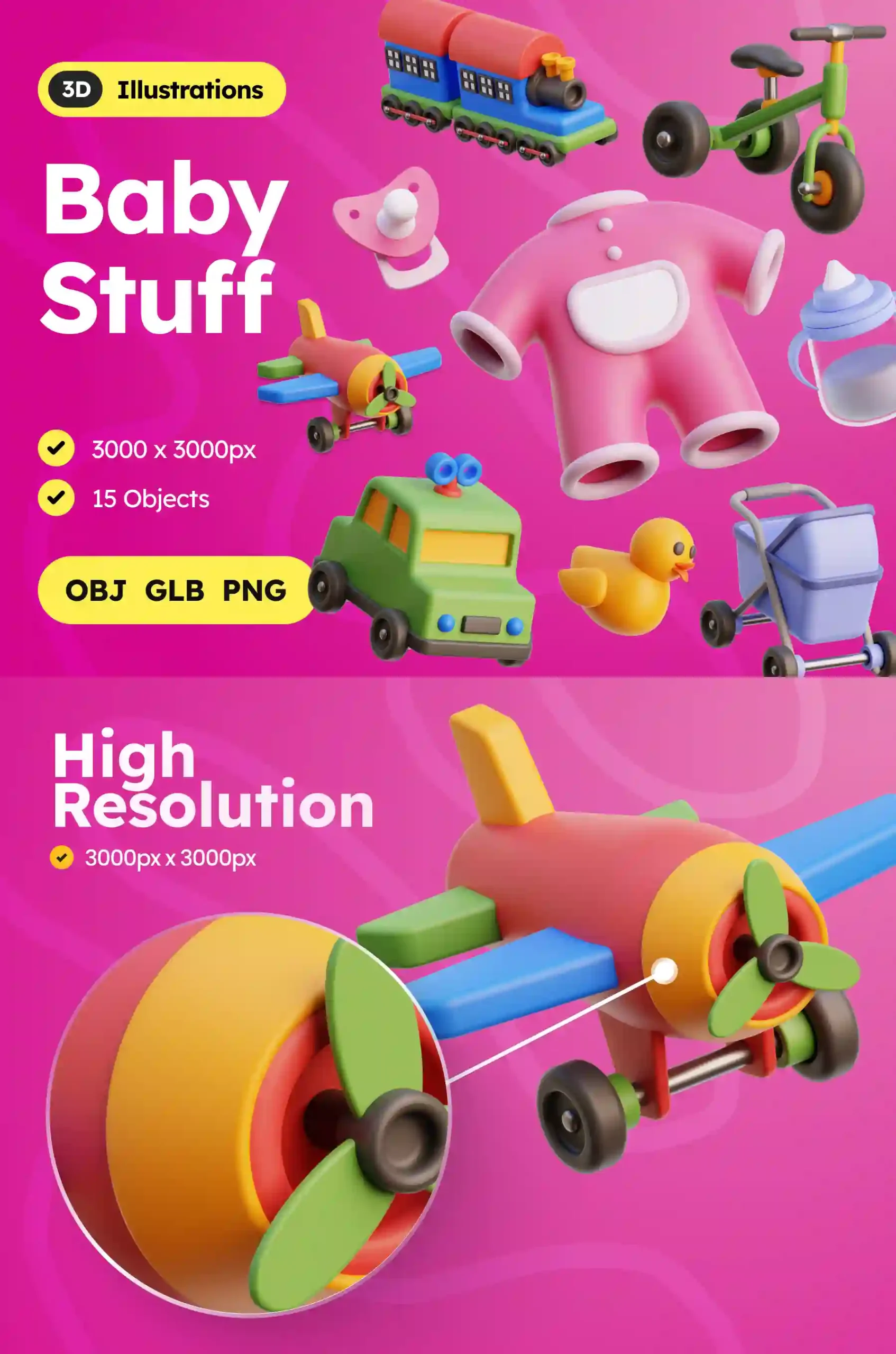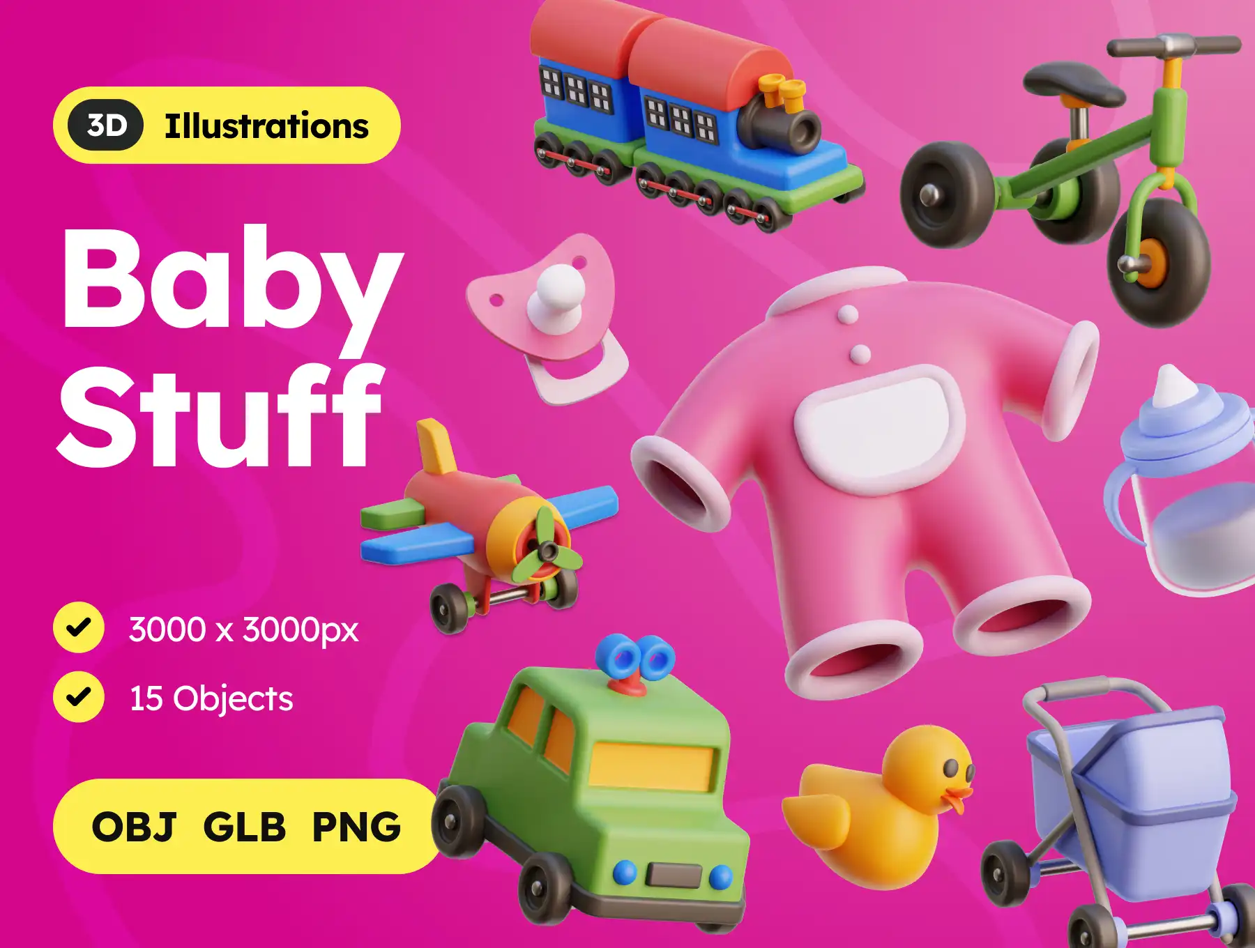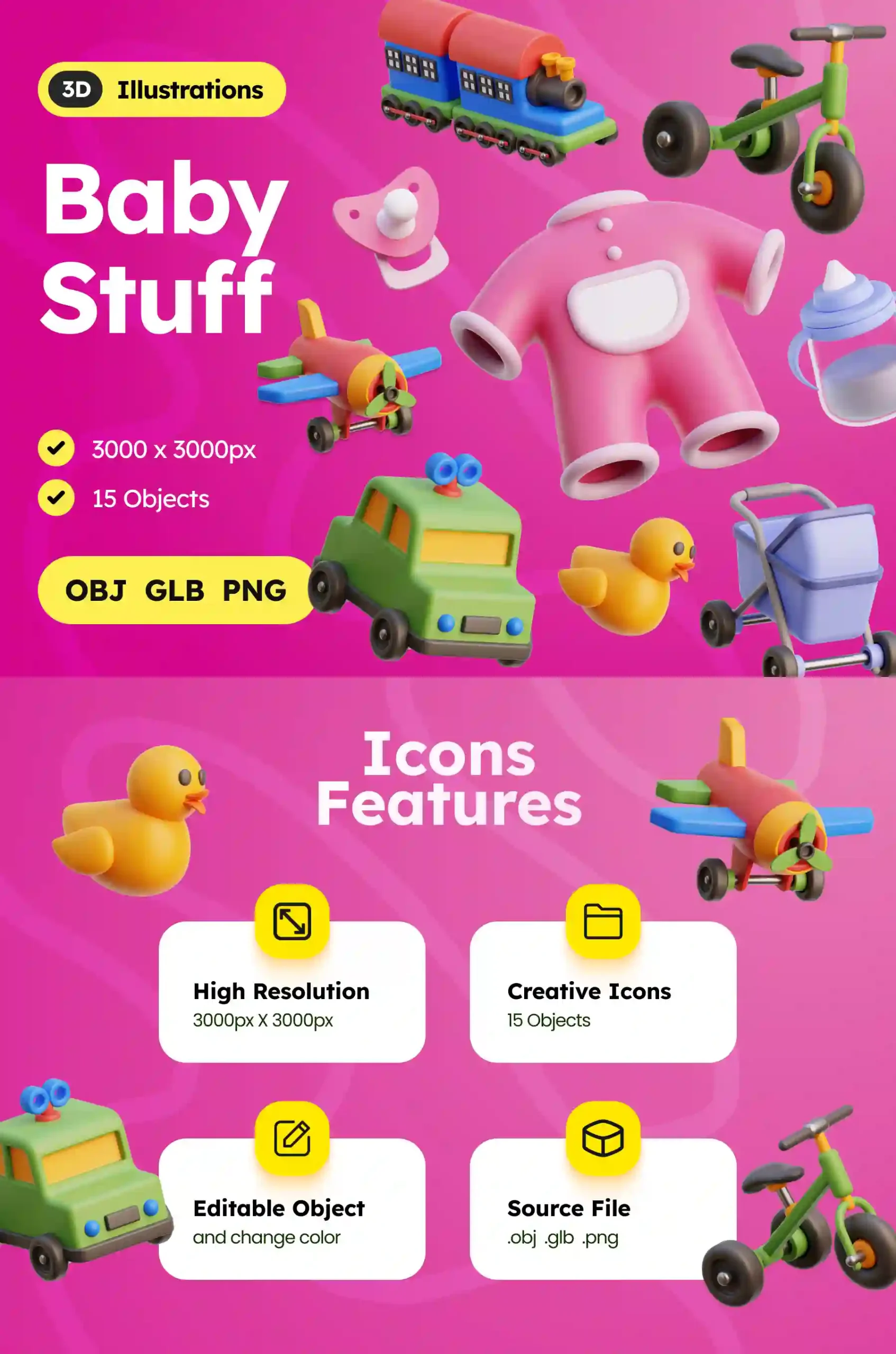 Baby Stuff 3D Icons can be used for design needs, animation, web design, UI
