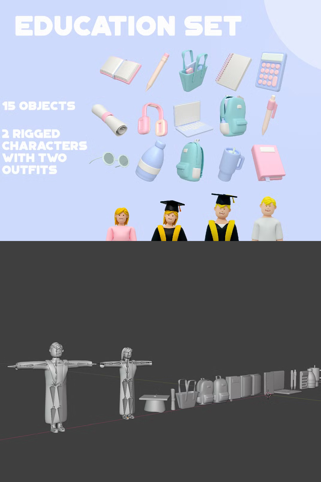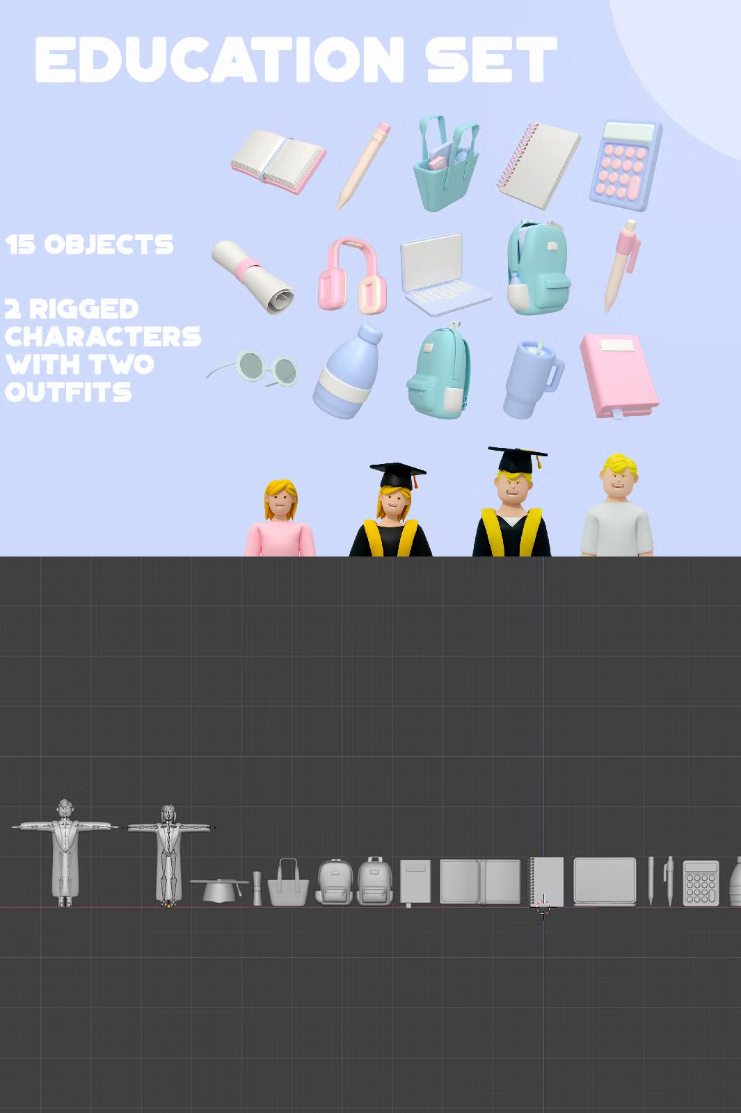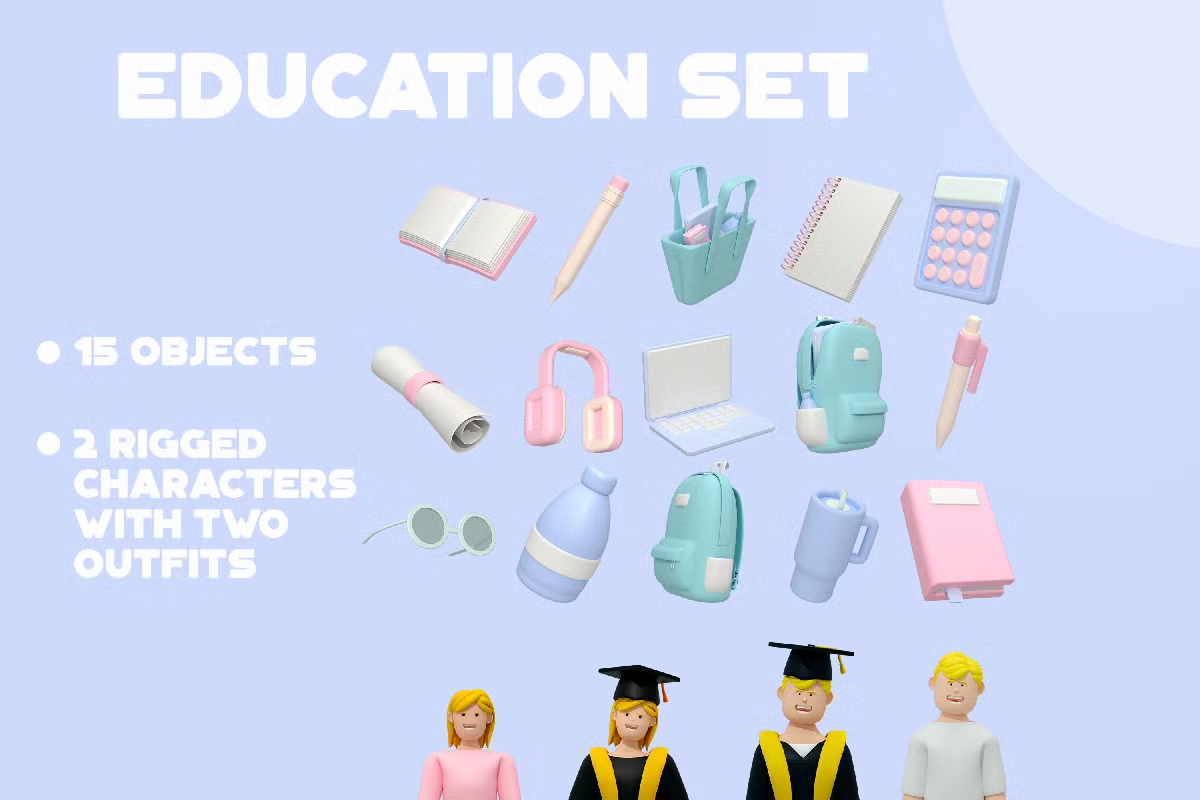Enhance your educational projects with this high-quality 3D Education Set. Featuring 15 meticulously designed objects and two fully rigged characters in both casual and graduation outfits, this collection is perfect for animations, presentations, gaming, and more.