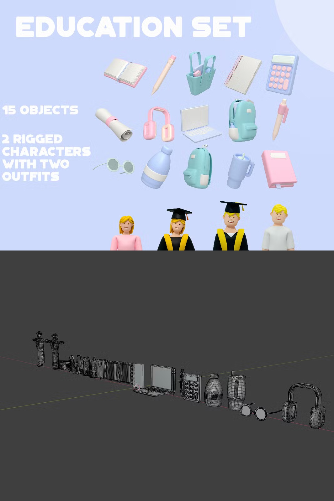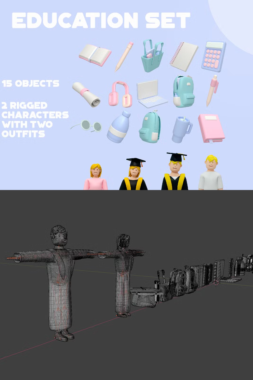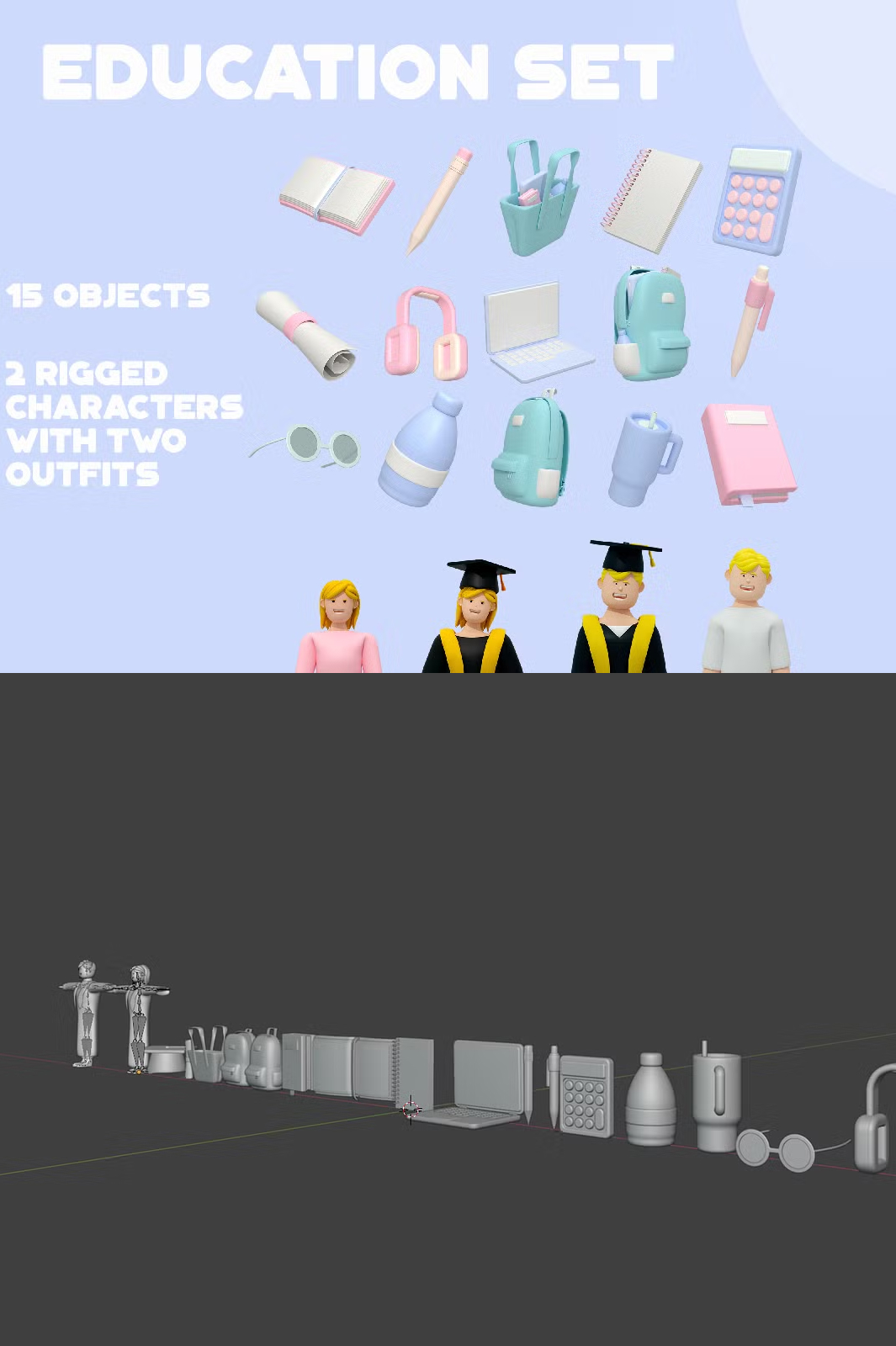 Enhance your educational projects with this high-quality 3D Education Set. Featuring 15 meticulously designed objects and two fully rigged characters in both casual and graduation outfits, this collection is perfect for animations, presentations, gaming, and more.