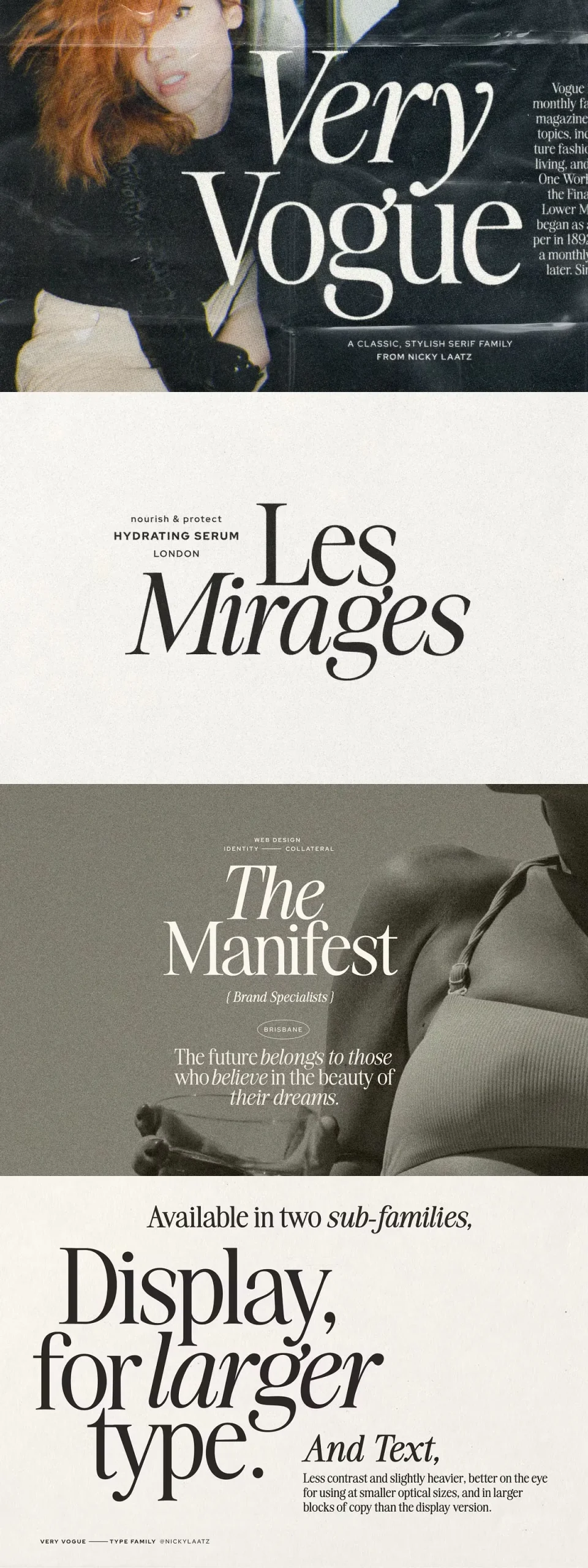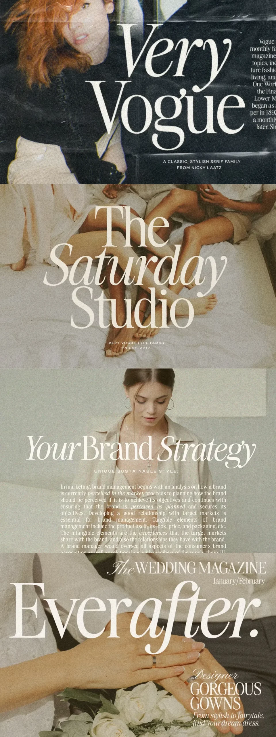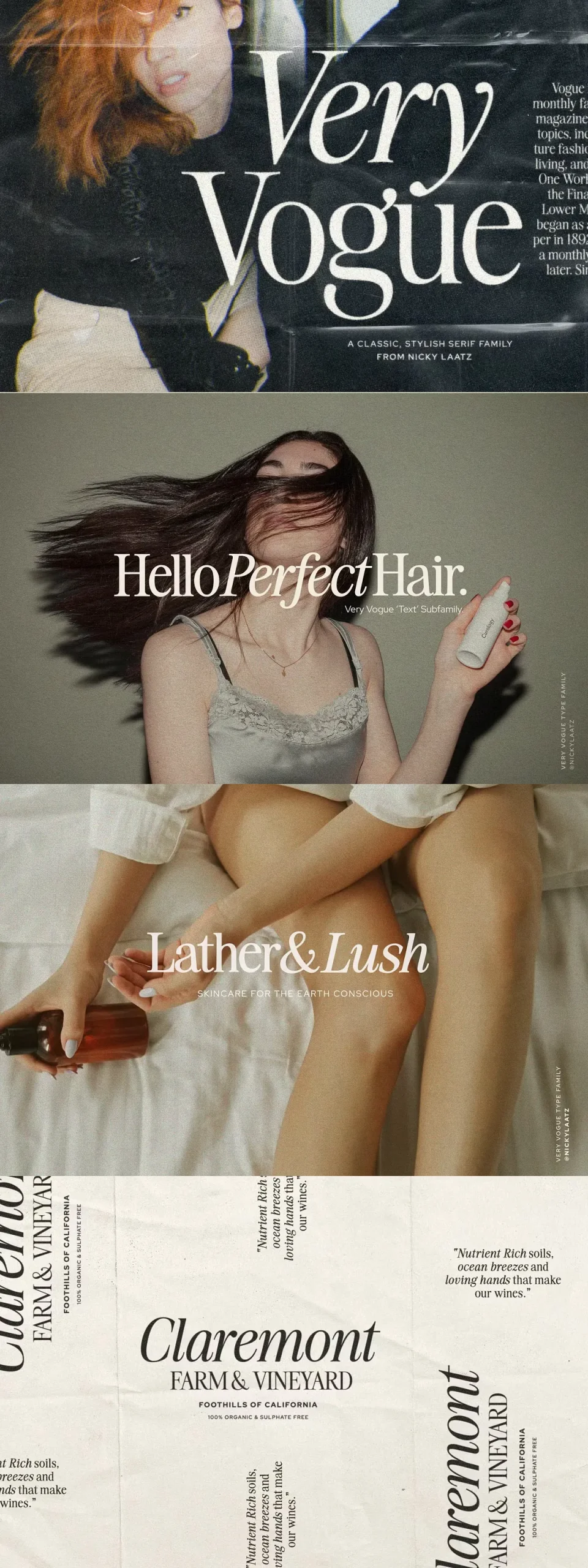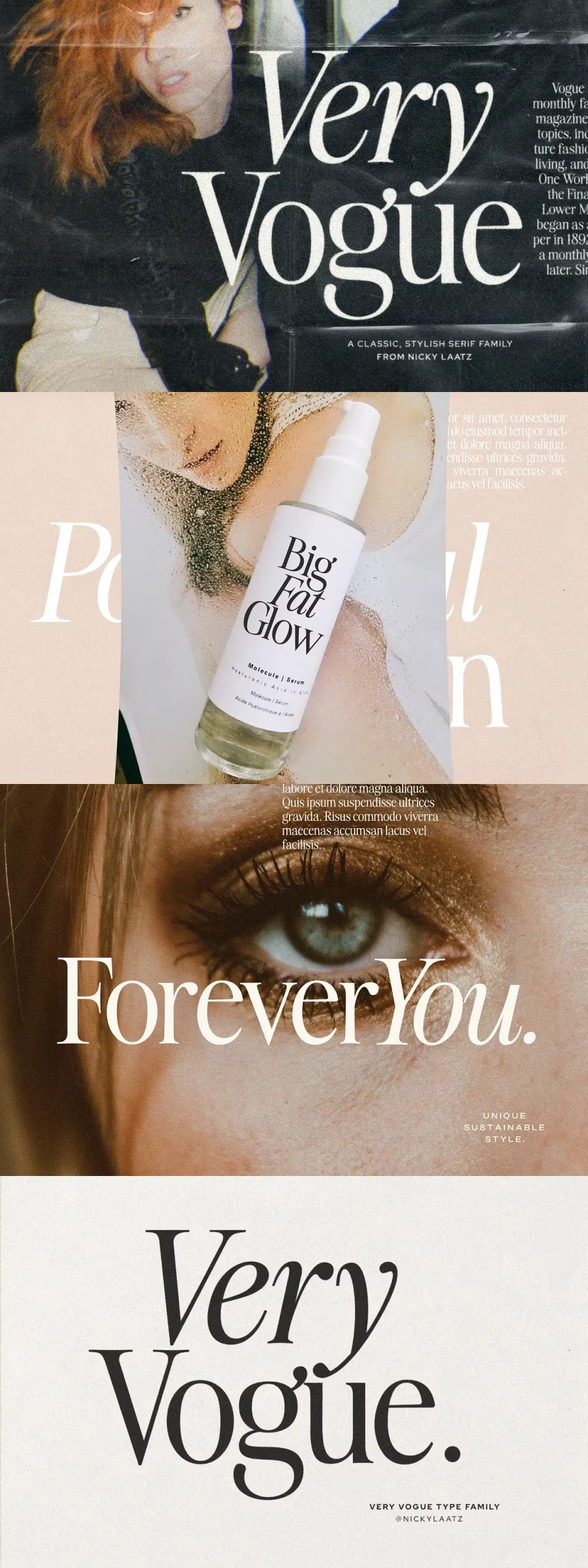 Classic and refined, and the epitome of style, Very Vogue Serif Family has soft curves and attention to detail make Very Vogue Display Serif a must for any projects requiring that upper level of class. Truly versatile – She also has a tomboy side – with her twin