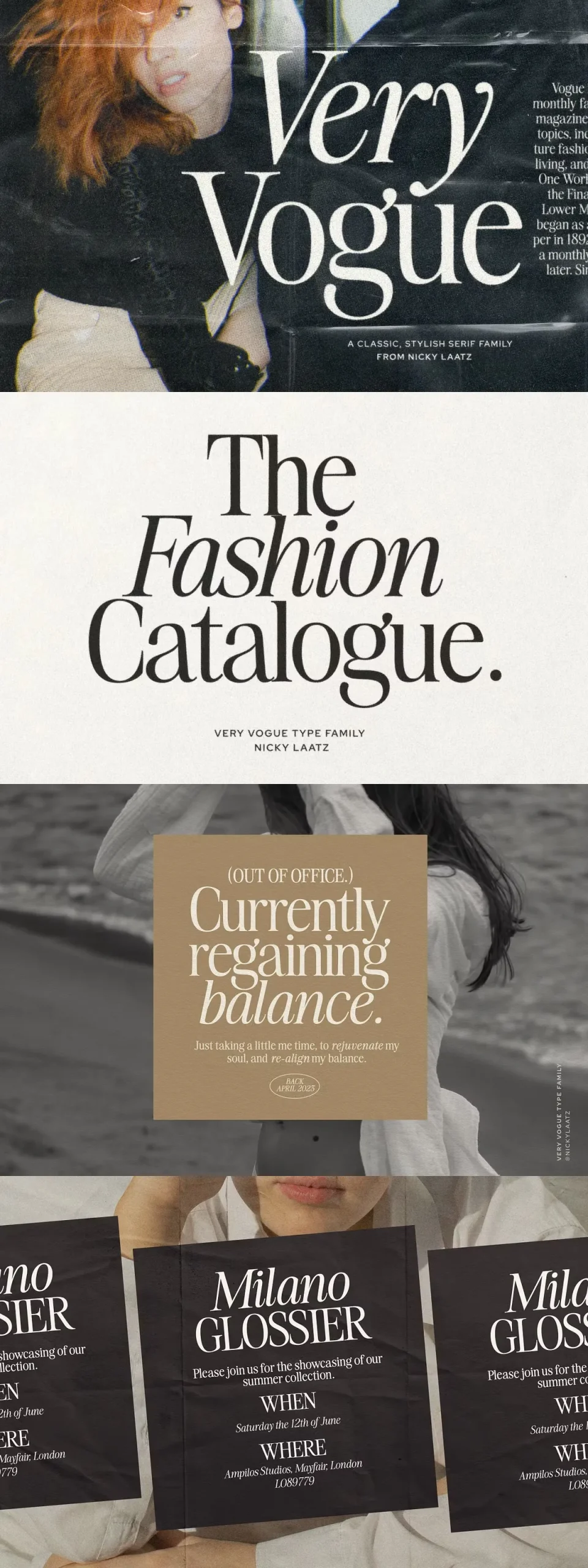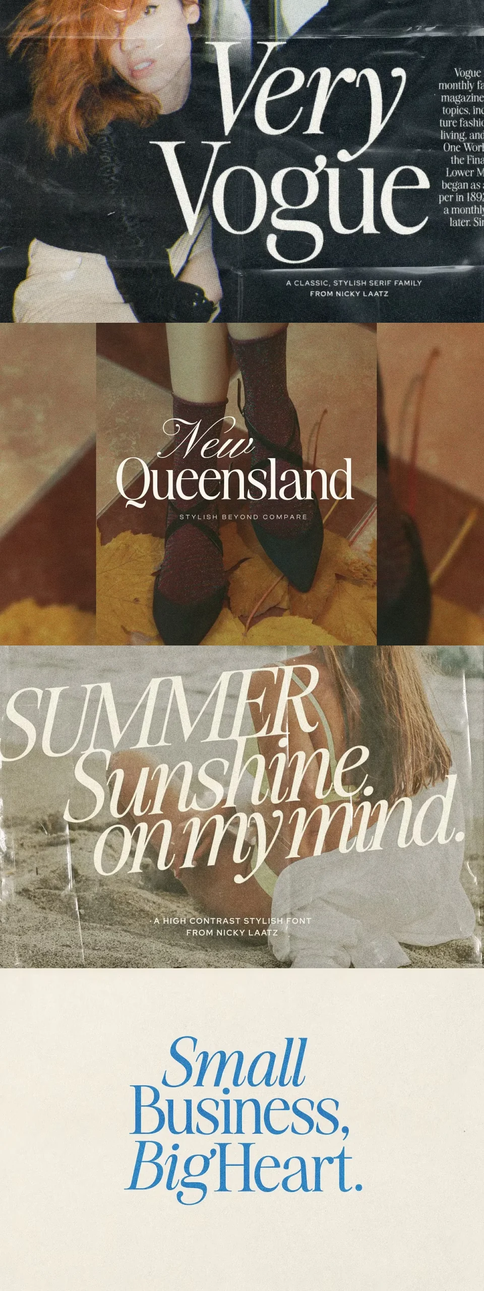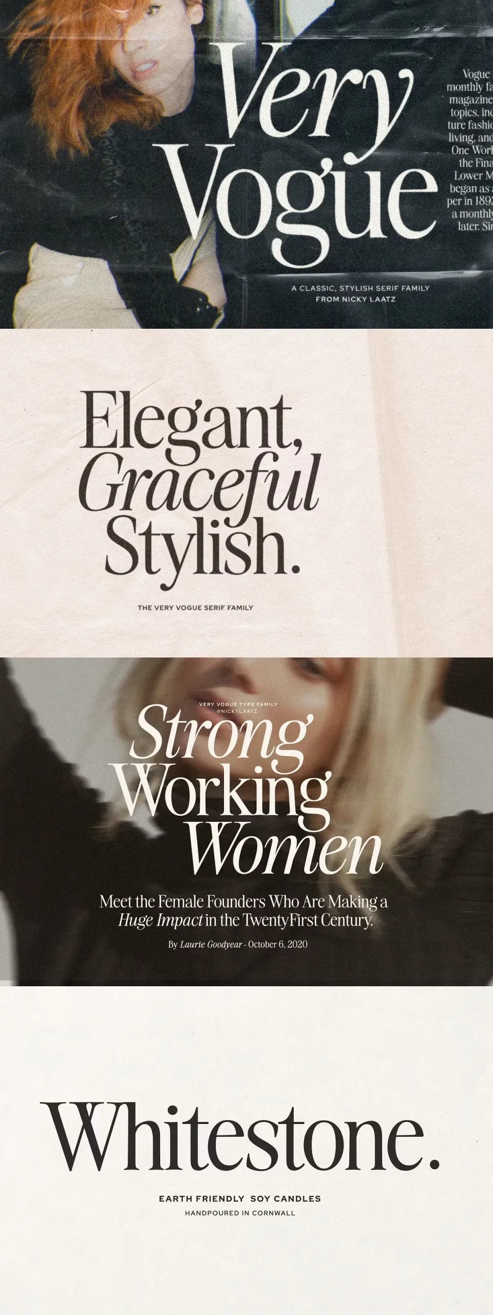 Classic and refined, and the epitome of style, Very Vogue Serif Family has soft curves and attention to detail make Very Vogue Display Serif a must for any projects requiring that upper level of class. Truly versatile – She also has a tomboy side – with her twin