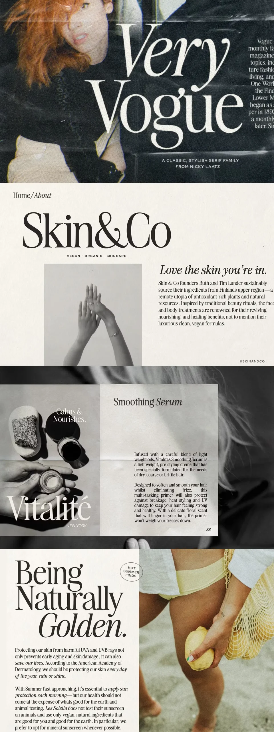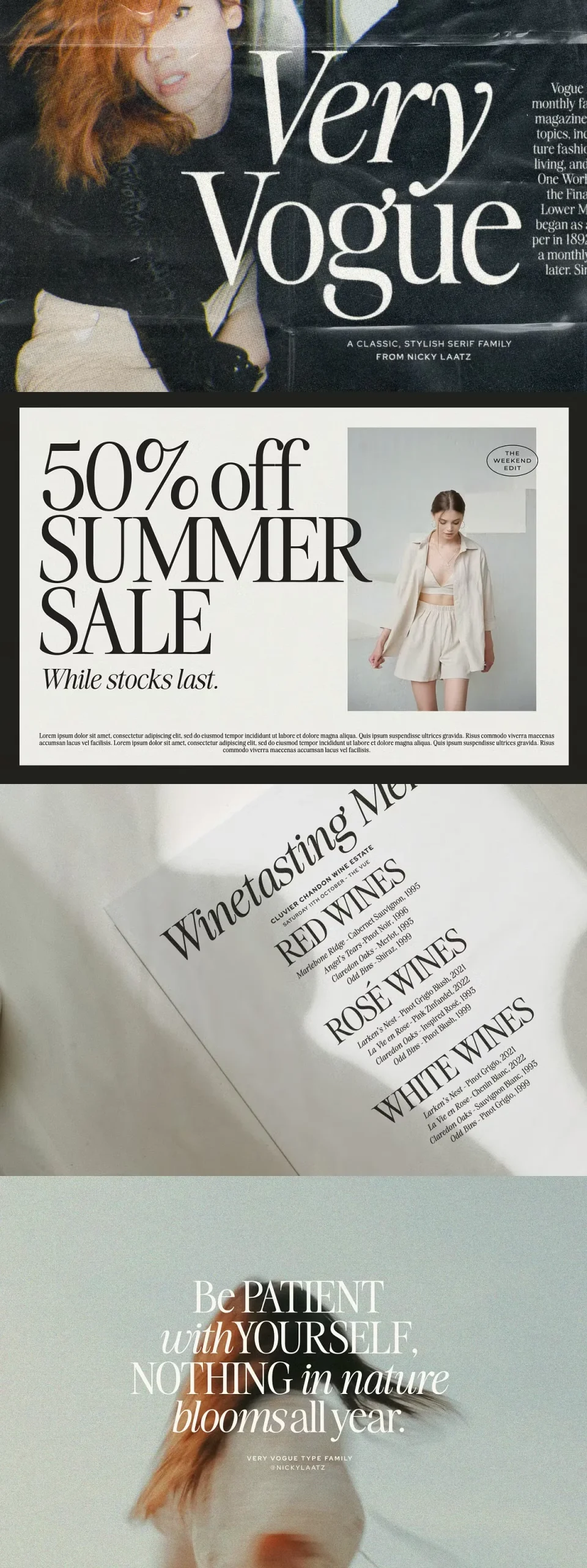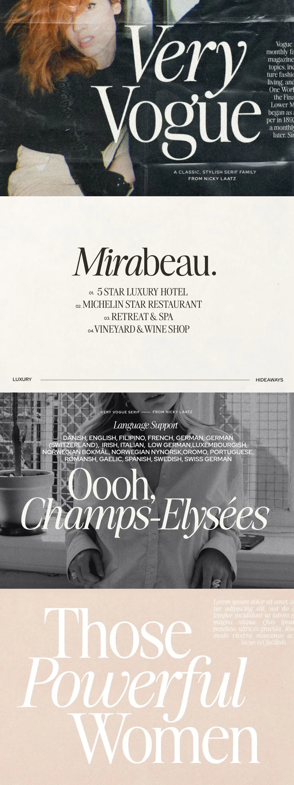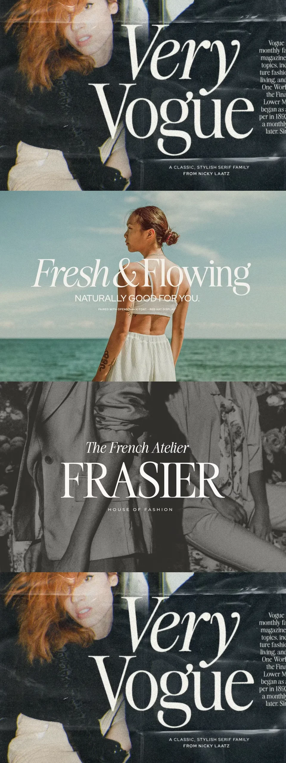 Classic and refined, and the epitome of style, Very Vogue Serif Family has soft curves and attention to detail make Very Vogue Display Serif a must for any projects requiring that upper level of class. Truly versatile – She also has a tomboy side – with her twin