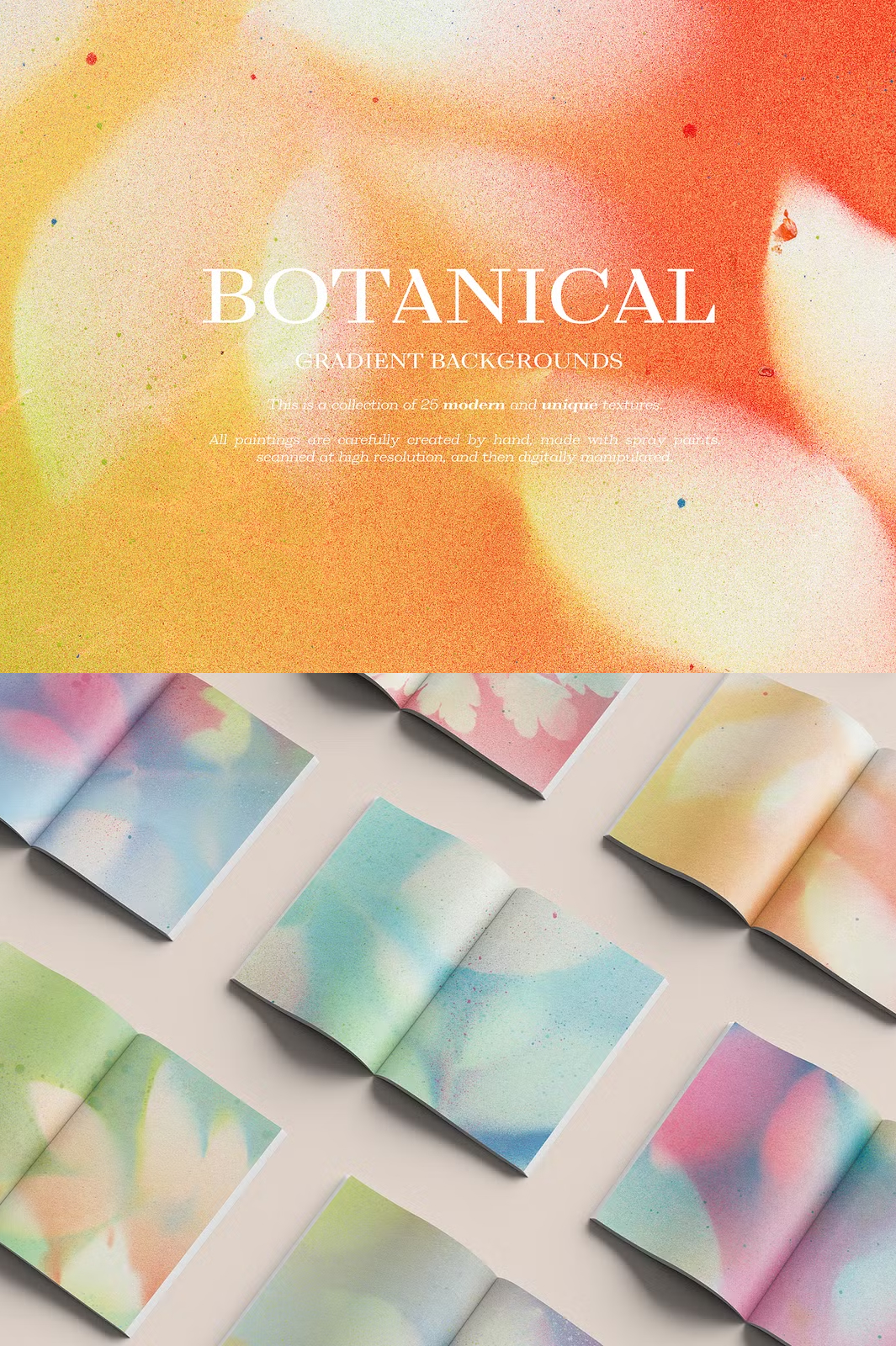 Discover the beauty of Botanical Gradient Textures, a collection of 25 modern and one-of-a-kind textures designed to bring a touch of nature-inspired artistry to your projects. Each texture in this set is hand-painted with spray paints, scanned at high resolution, and digitally enhanced to create stunning visuals with a contemporary edge.