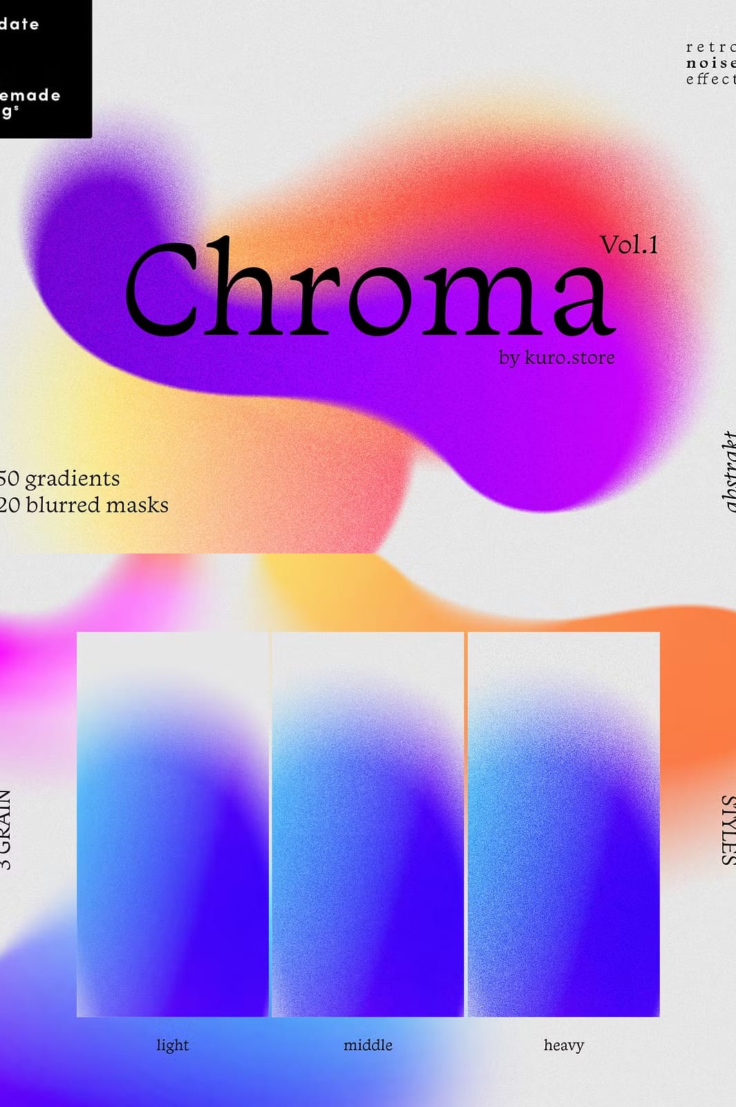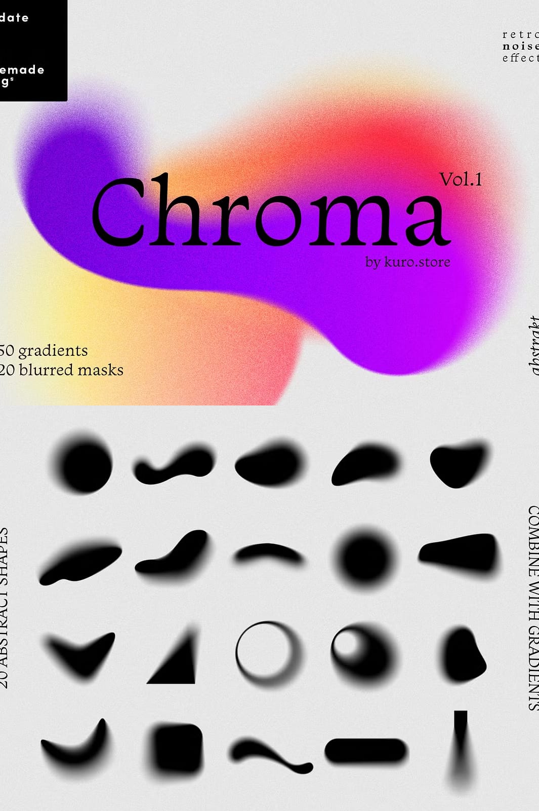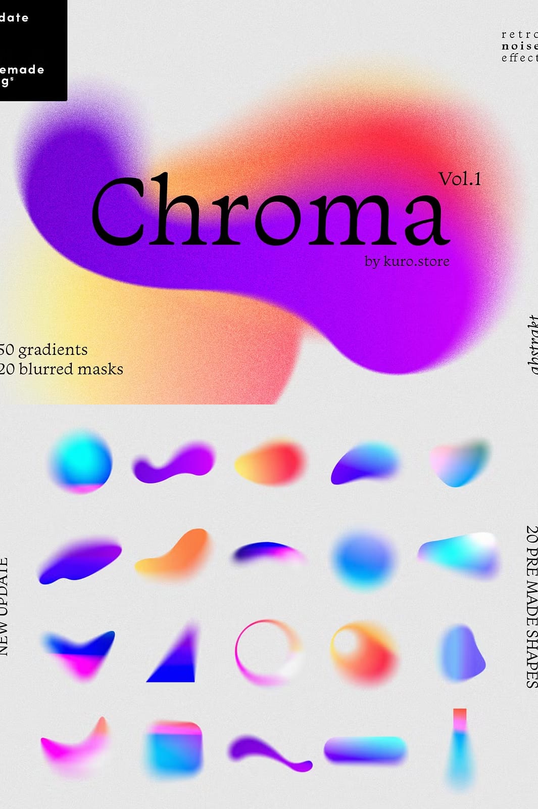 Introducing the Chroma Grainy Gradient Textures, a stunning collection designed to enhance your creative projects with vibrant gradients and unique abstract shapes. This set combines modern aesthetics with a retro flair, featuring grainy texture overlays that add depth and character to your designs. Whether you are working on digital art, branding, or print materials, these textures will help you achieve remarkable results.