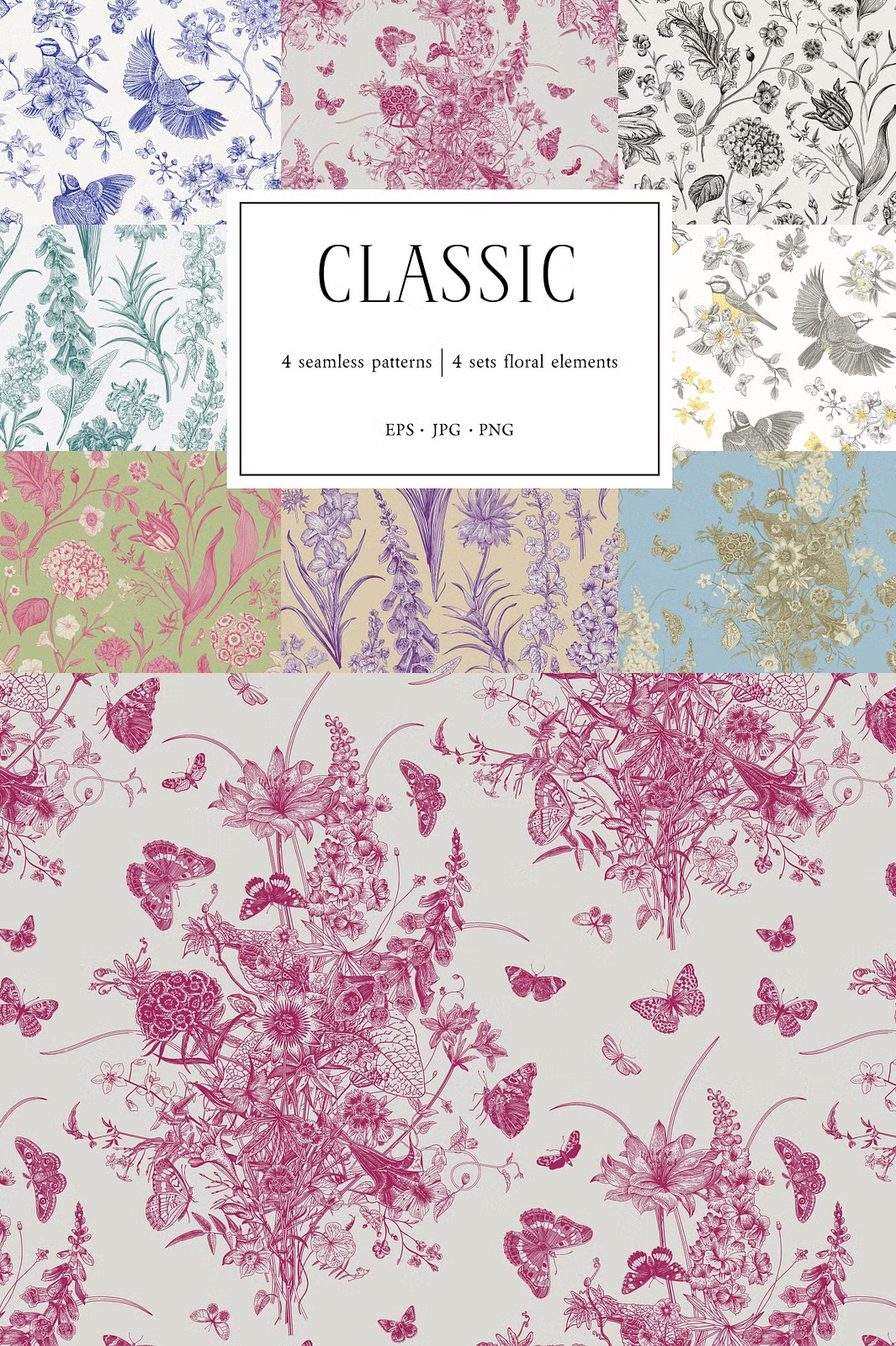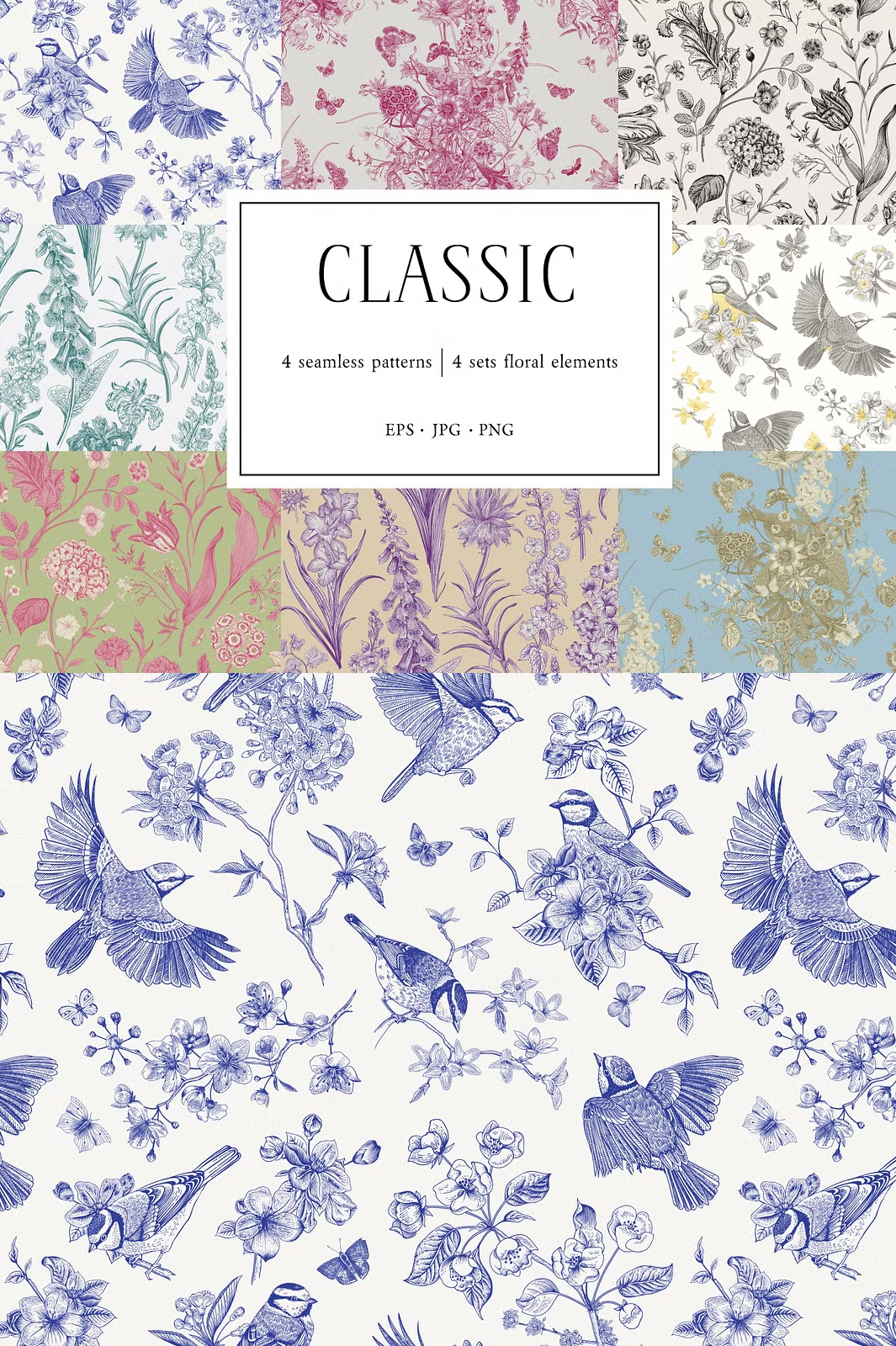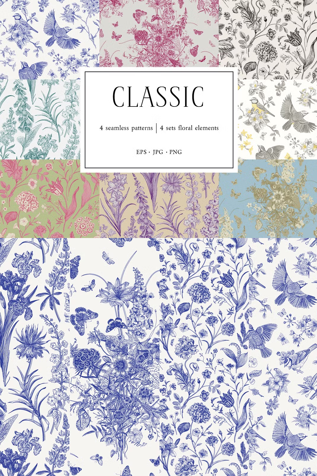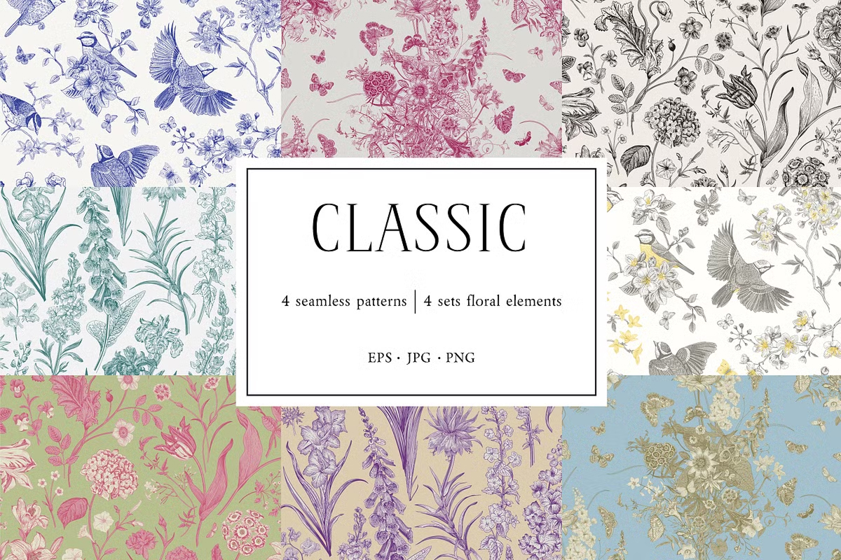 Discover the beauty of Toile de Jouy-inspired seamless patterns, designed to bring a touch of elegance and sophistication to your creative projects. This collection features exquisite hand-drawn floral and bird motifs, intricately arranged to create classic, vintage, and contemporary patterns.