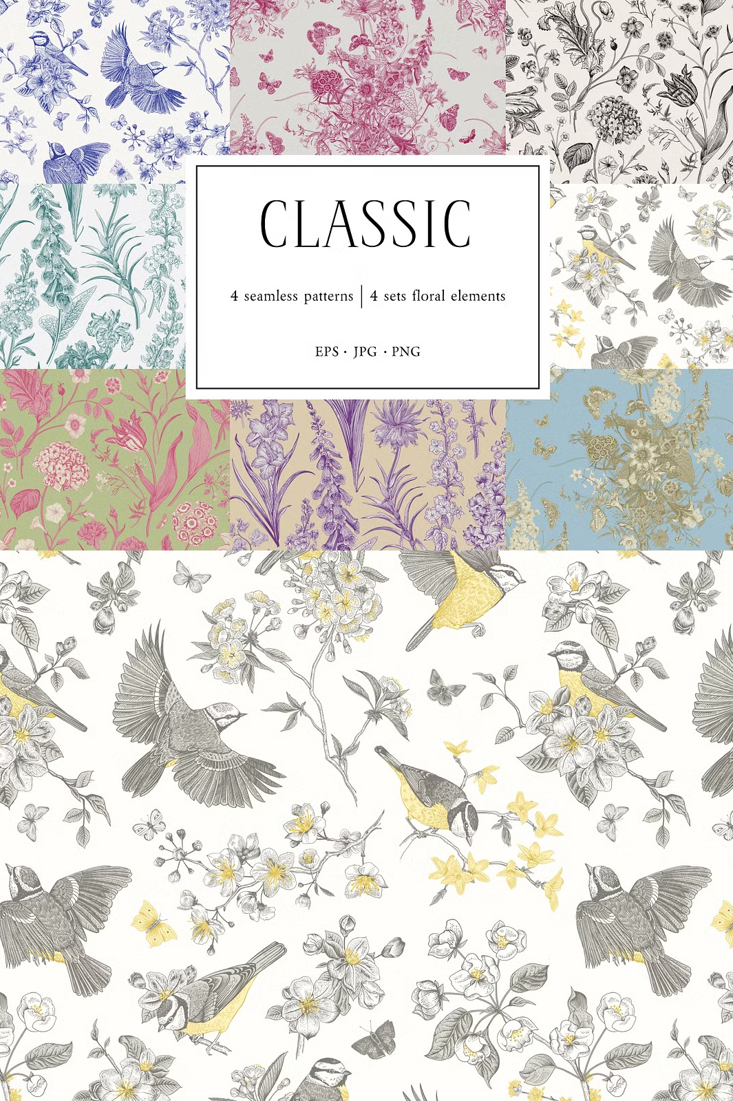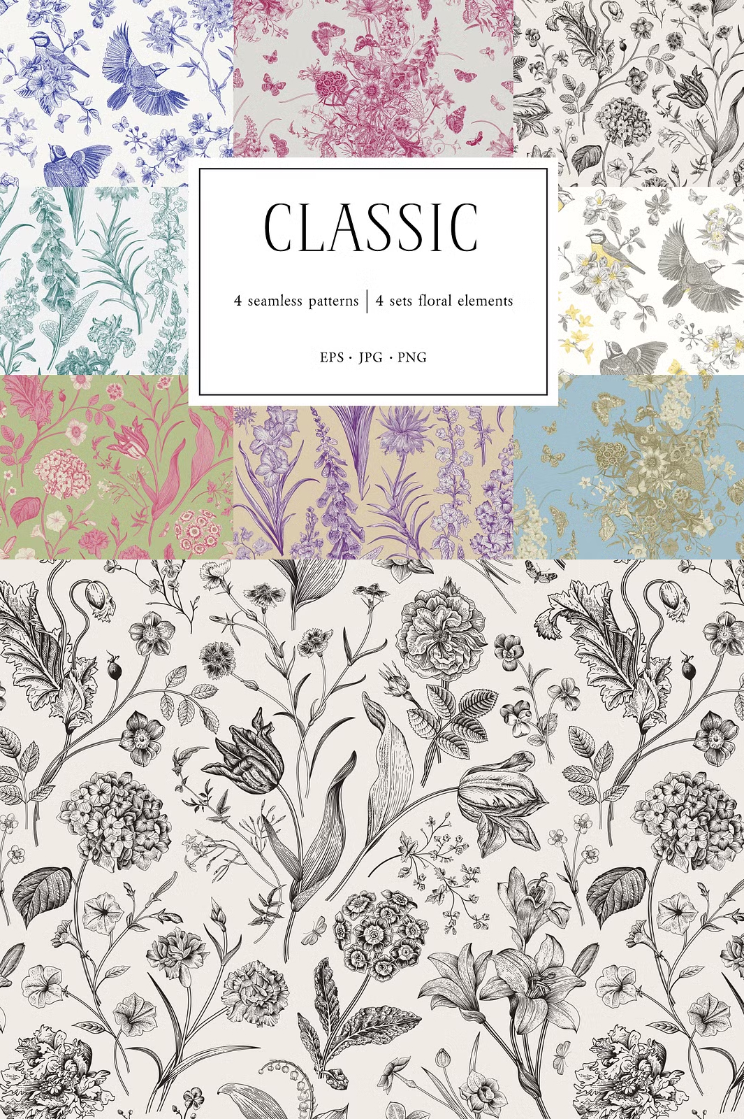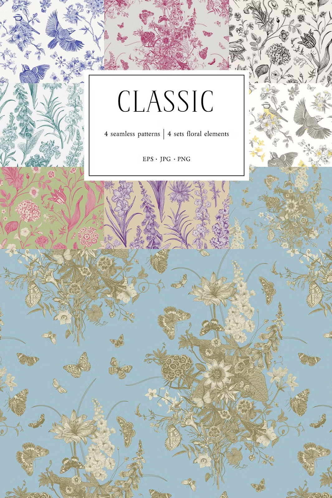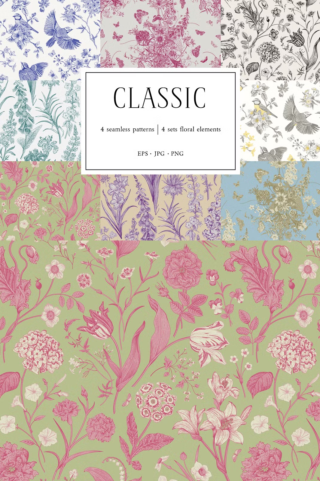 Discover the beauty of Toile de Jouy-inspired seamless patterns, designed to bring a touch of elegance and sophistication to your creative projects. This collection features exquisite hand-drawn floral and bird motifs, intricately arranged to create classic, vintage, and contemporary patterns.