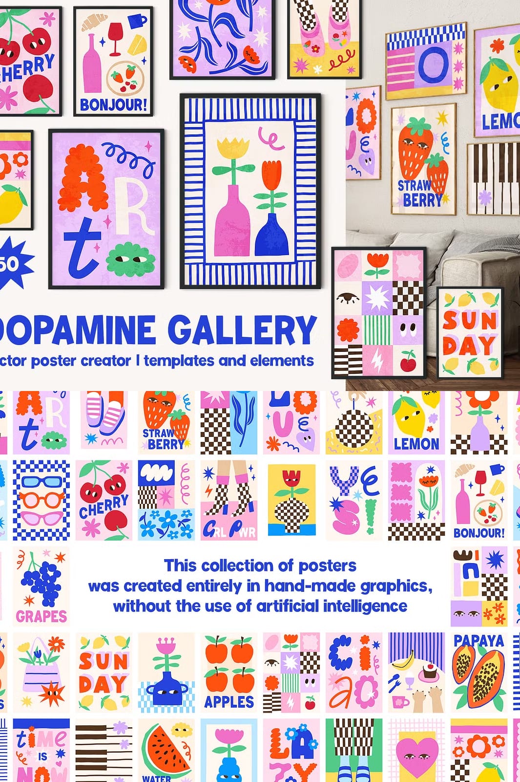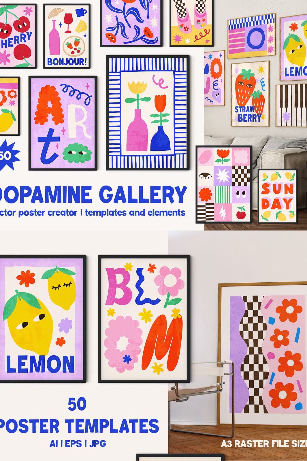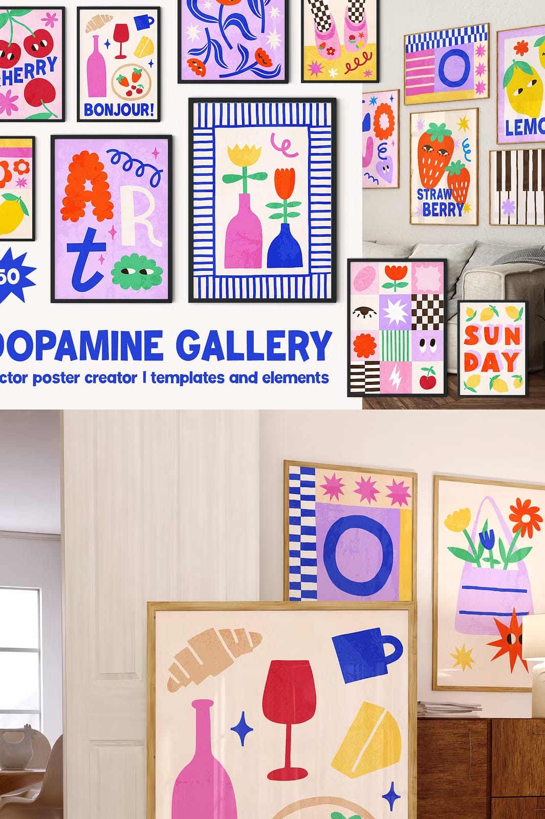 The Dopamine Gallery Collection is an extensive resource designed for artists, designers, and anyone looking to create stunning wall art. This collection includes 50 modern pre-made vector poster templates, each crafted with contemporary aesthetics in mind. Whether you are designing for personal use or professional projects, these templates provide the perfect foundation to express your creativity.