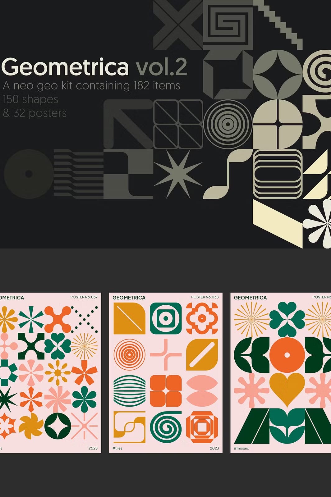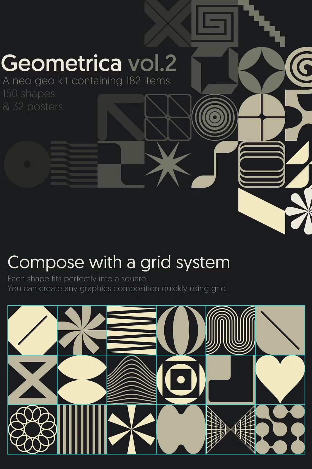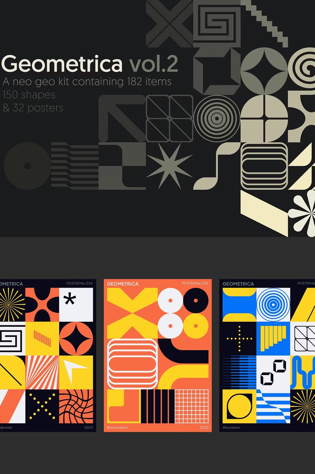 The carefully constructed grid system acts like a game board where shapes connect with precision and fluidity. With 150 unique shapes and symbols at your disposal, you can unleash your creativity to develop logos, branding materials, packaging, posters, flyers, covers, and digital assets. Geometrica Vol.2 embraces flexibility, making it suitable for projects ranging from print to web, social media, and product design. The included 32 pre-designed posters provide inspirational ready-to-use templates that can be customized to align with your brand’s vision or creative goals, accelerating your workflow while maintaining originality.