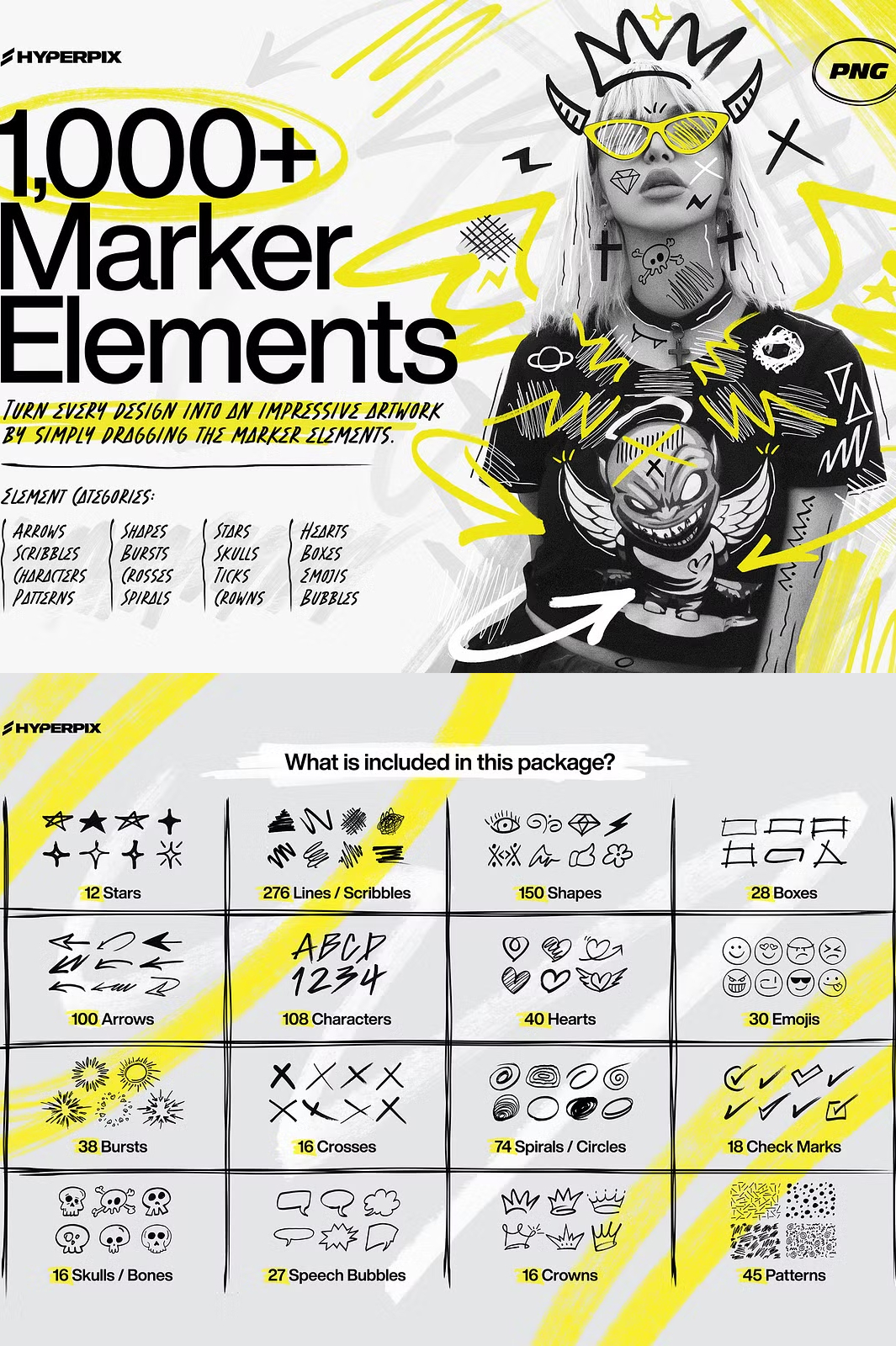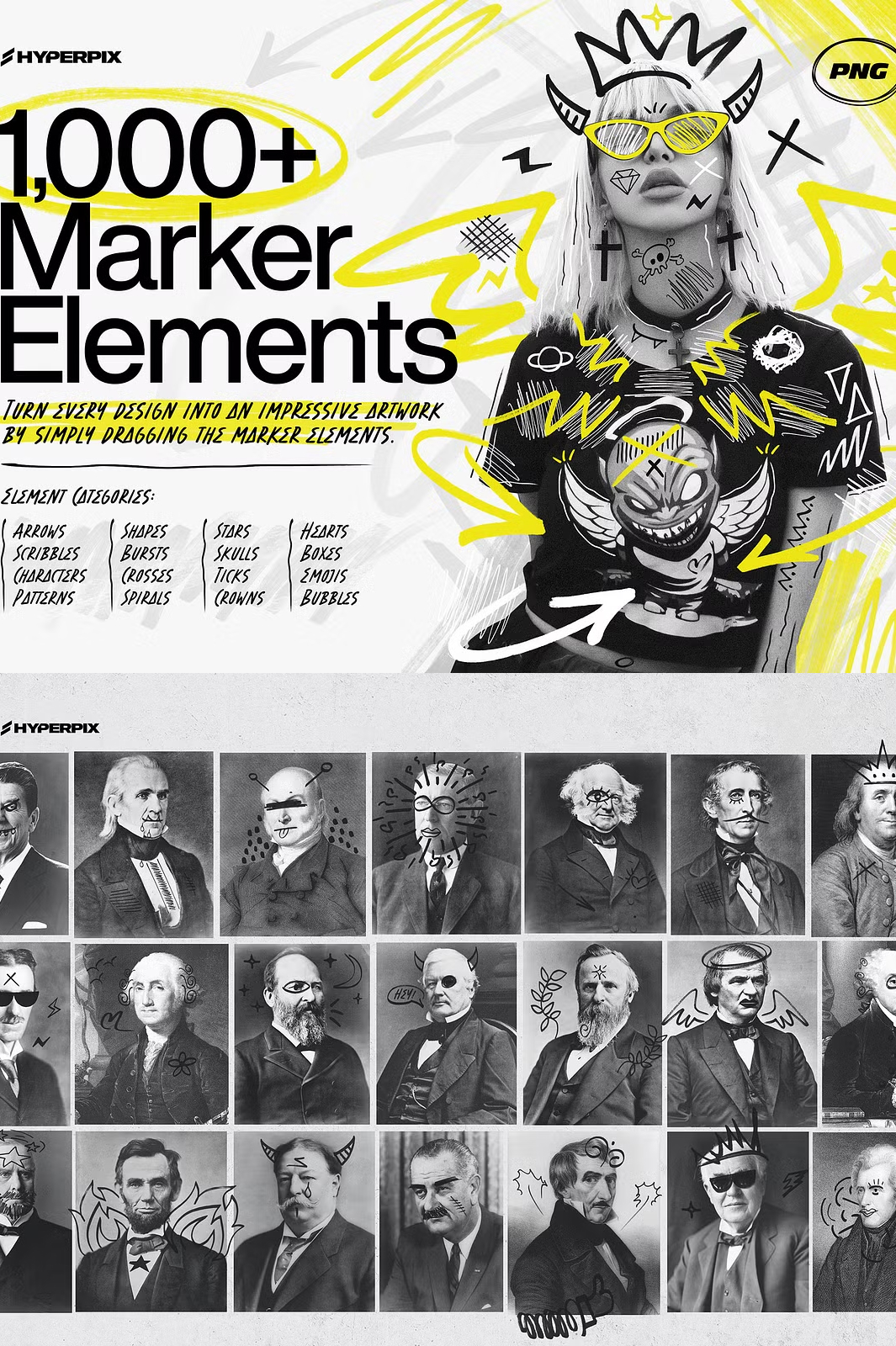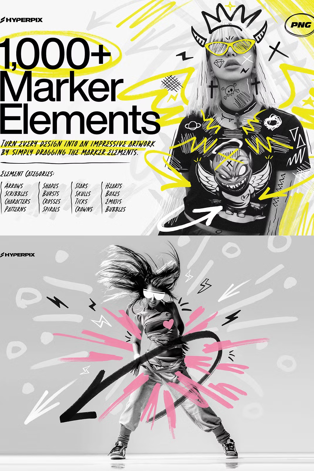 Take your designs to the next level with the largest collection of marker elements in the world of graphic design! The Hyper Marker Super-Pack is packed with over 1000 hand-drawn elements, giving you everything you need to add personality, creativity, and a bold artistic touch to your projects.