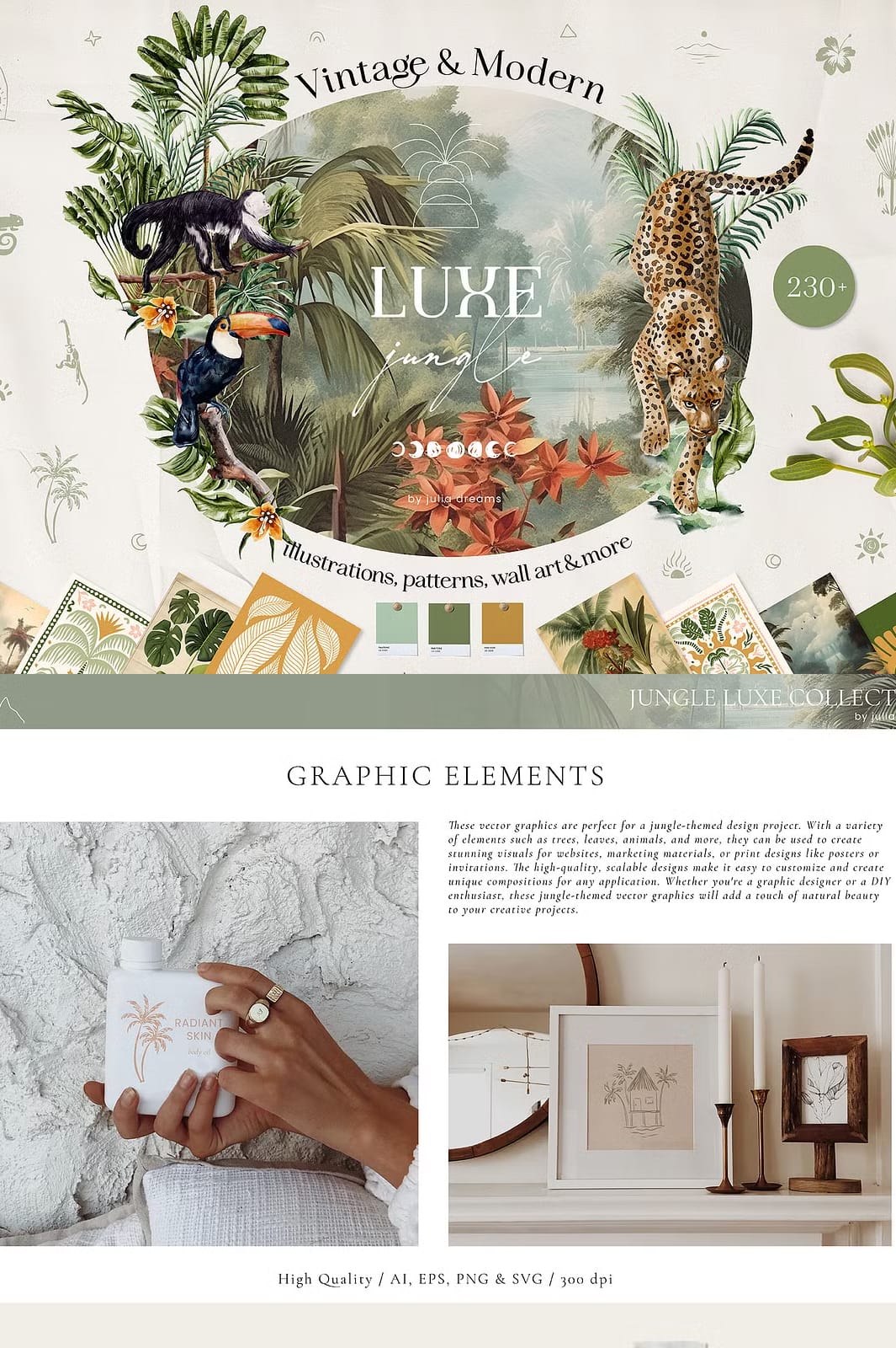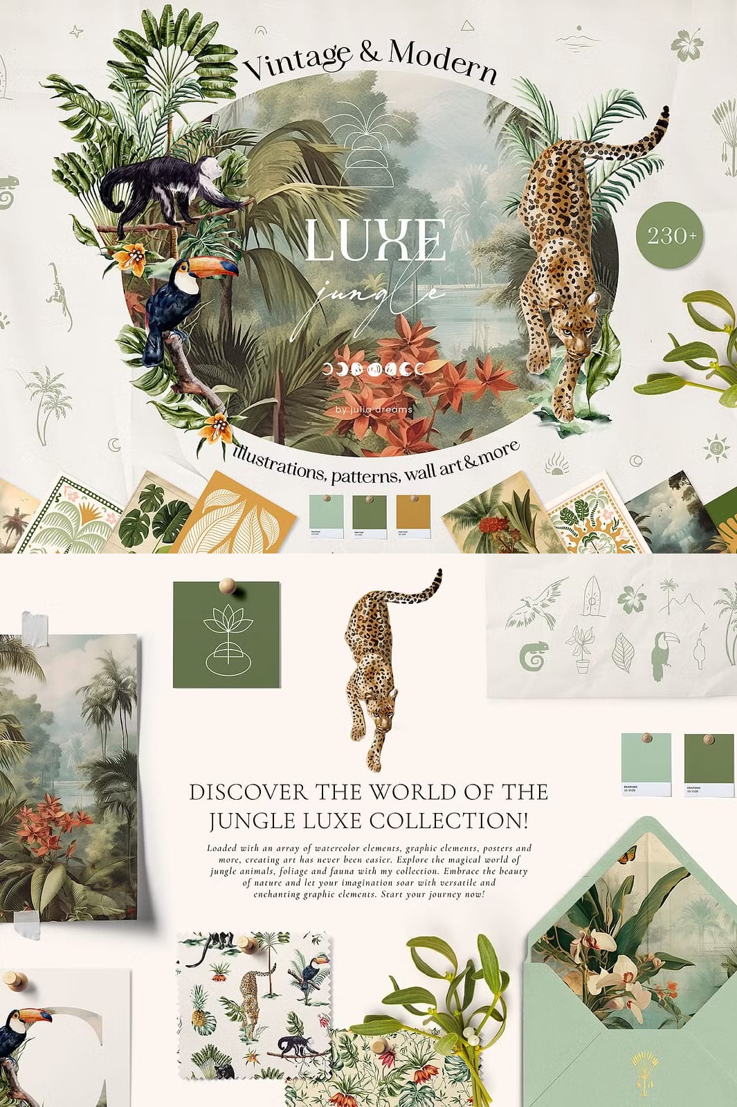 The collection’s versatility is its greatest strength. Every element can stand alone or be combined with others, allowing endless customization. Whether you need a delicate accent for a wedding invitation, a bold backdrop for a product package, or a fresh visual theme for a social‑media campaign, Jungle Luxe supplies the tools to craft compelling, story‑driven designs. The watercolor textures add a soft, handmade elegance, while the animal and foliage illustrations inject personality and movement into any project.