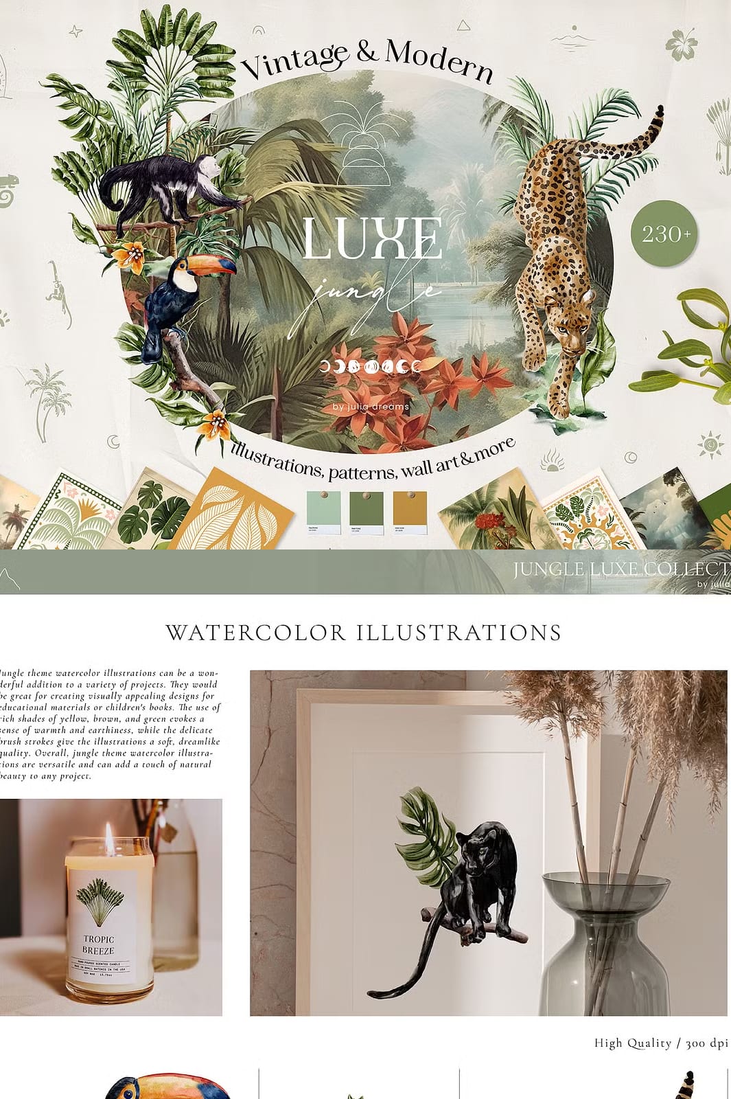 This richly curated Jungle Luxe Watercolor Collection empowers designers to infuse their work with the lush vibrancy of tropical flora and fauna. Each asset is hand‑painted, delivering an authentic, handcrafted feel that transforms ordinary layouts into immersive, nature‑inspired experiences. From whimsical animal illustrations to delicate flower motifs, the collection offers a seamless blend of organic textures and vivid colors, making it ideal for a broad spectrum of creative applications.