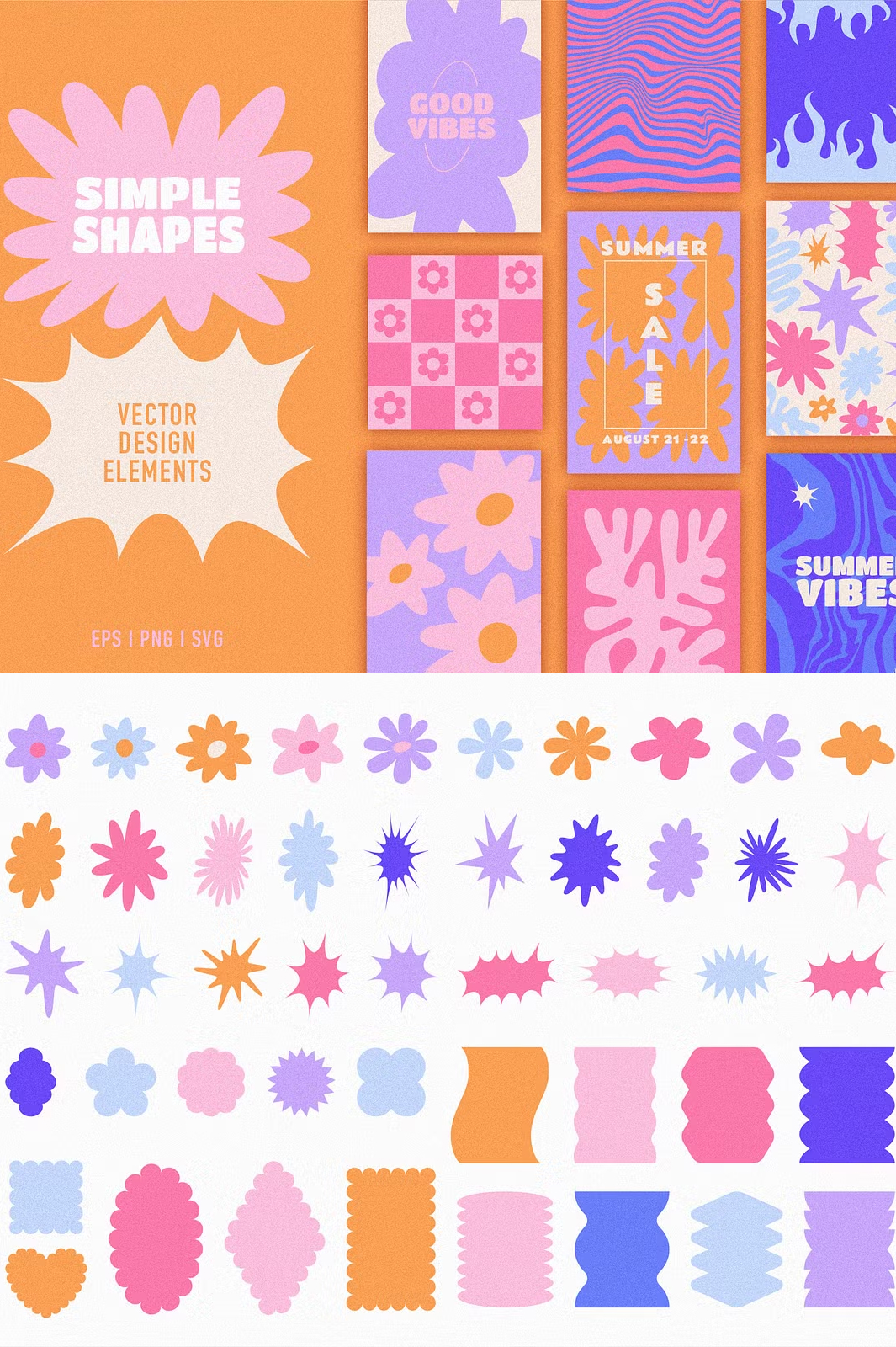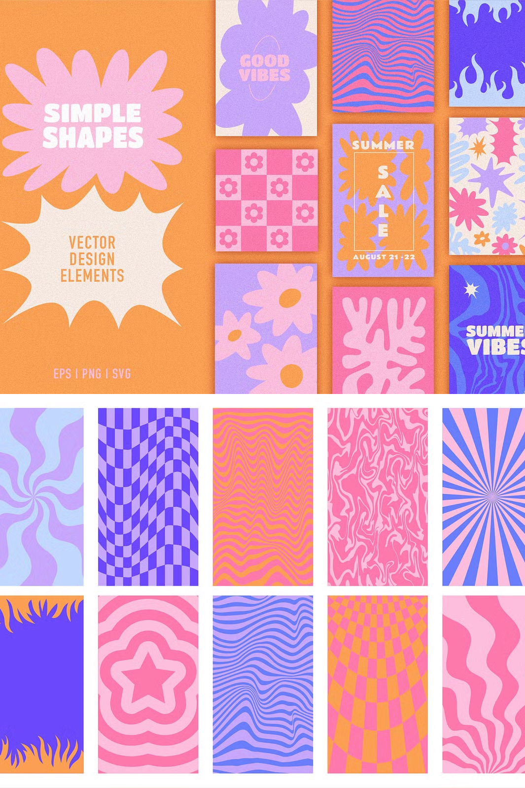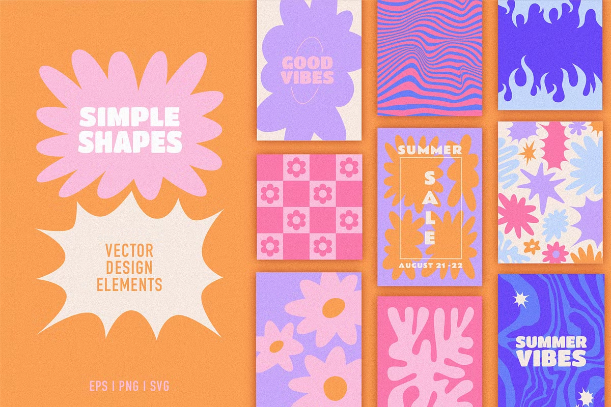 Step into a world of vibrant creativity with the Simple Shapes Collection! This set is packed with versatile vector graphic elements including logo templates, frames, borders, and backgrounds, all designed to bring a fun, decorative, and retro-inspired aesthetic to your projects.