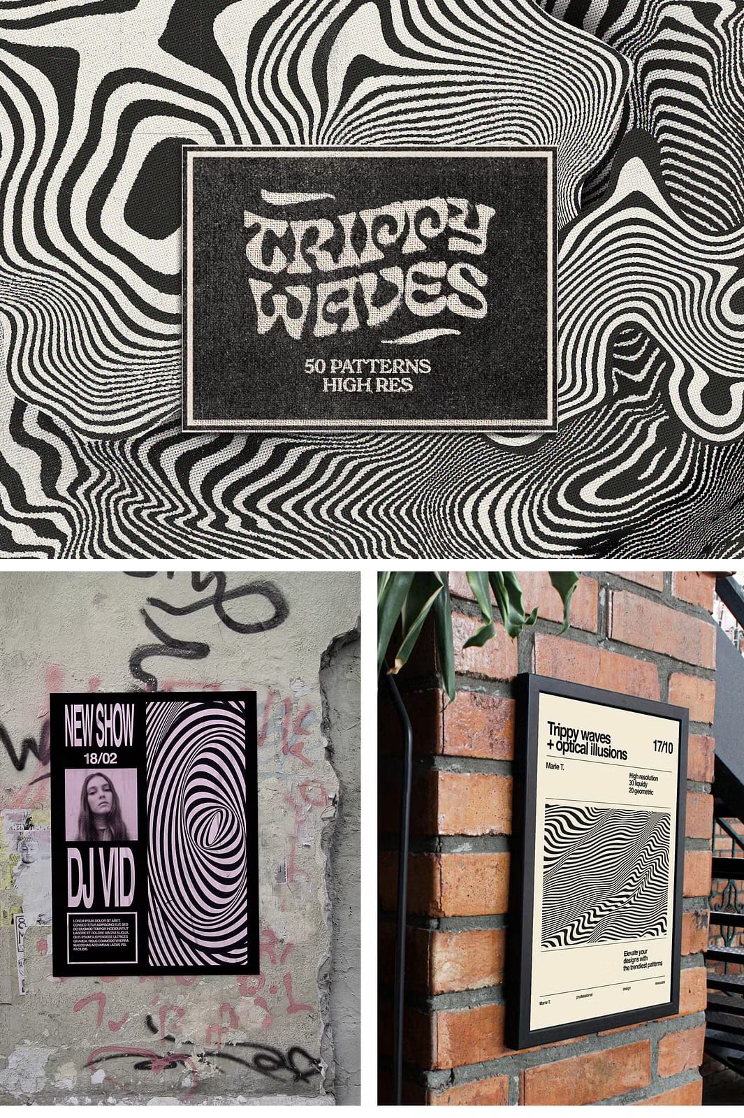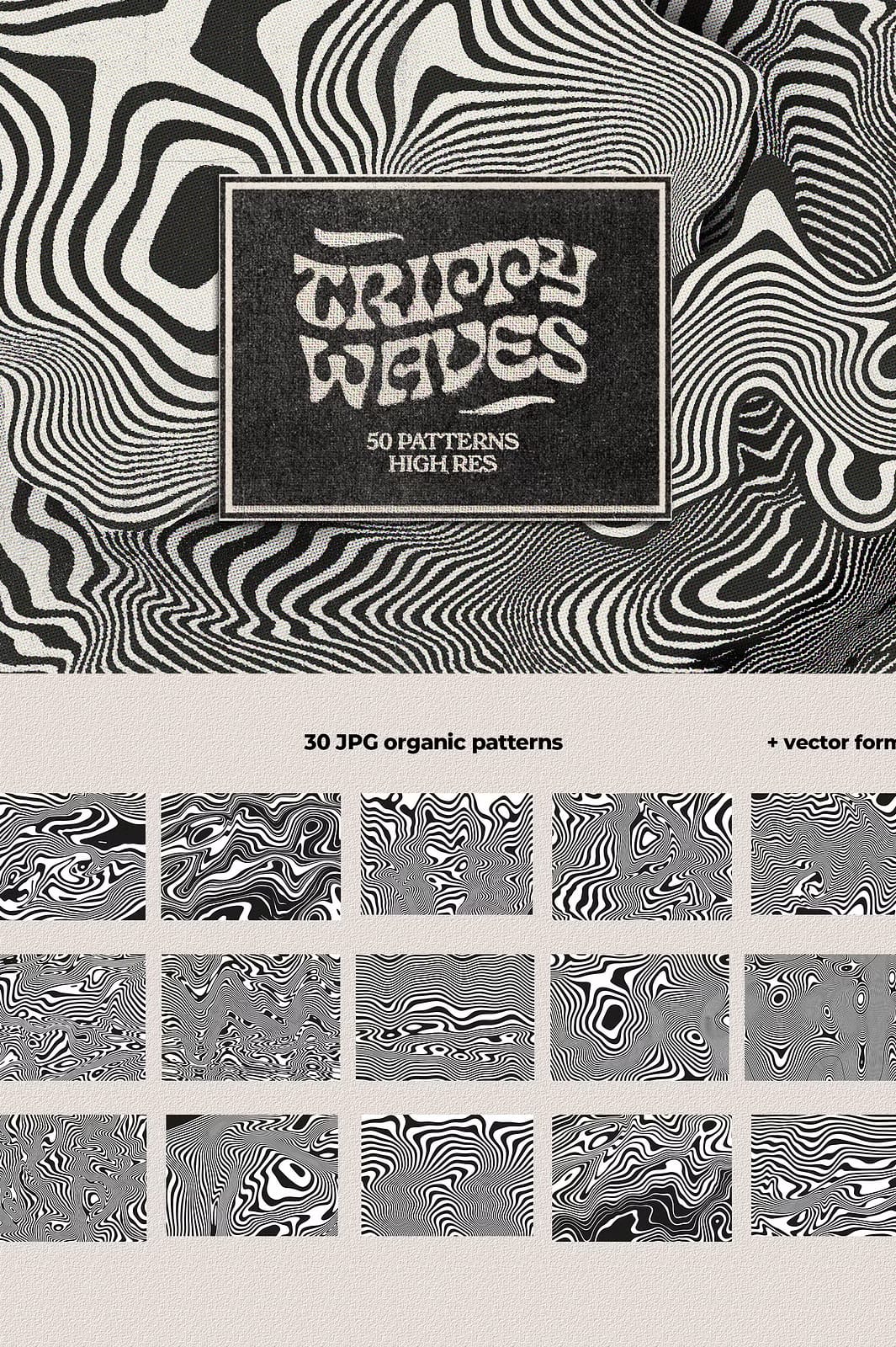 Elevate your creative projects with the Trippy Waves Ripple Patterns collection, a vibrant assembly of 50 black and white retro wave designs. Each pattern channels a nostalgic blend of organic flow and geometric precision, creating an engaging visual experience that captivates and energizes your work. This diverse set perfectly balances fluid organic shapes with striking optical illusion-inspired geometries, offering designers a versatile resource to enhance backgrounds, branding, collage art, posters, packaging, social media content, and more.