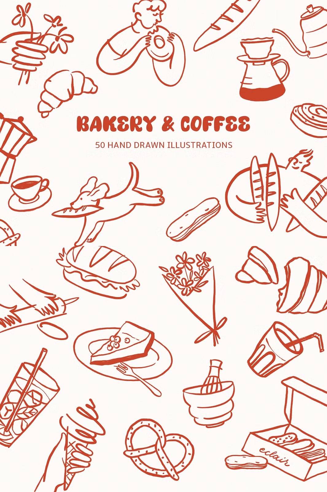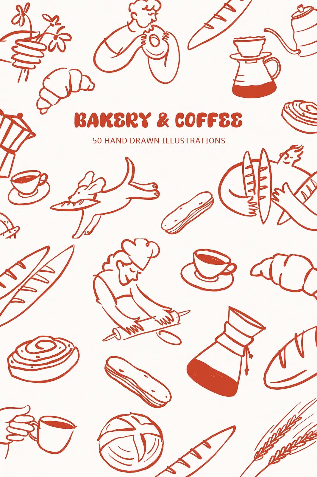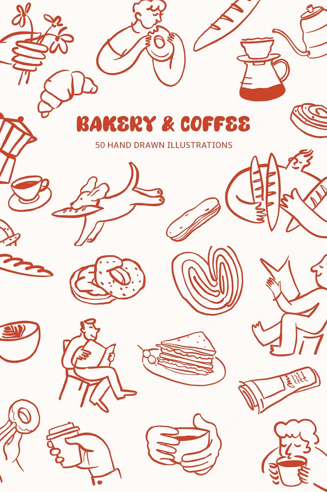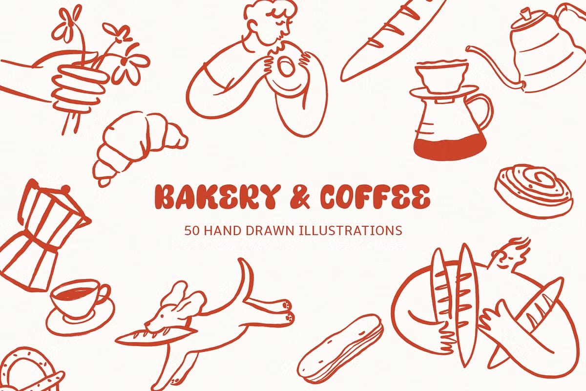 This collection offers a diverse range of illustrations that capture the essence of bakery delights and cozy café culture. Each element is meticulously hand-drawn to provide authentic, delicate details that bring your designs to life. The package includes: