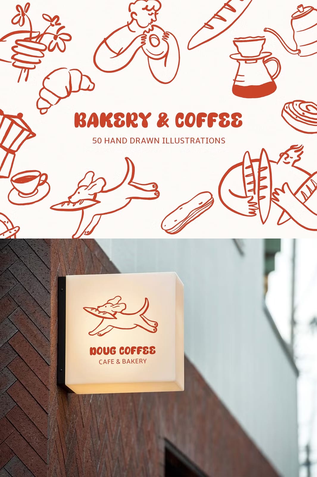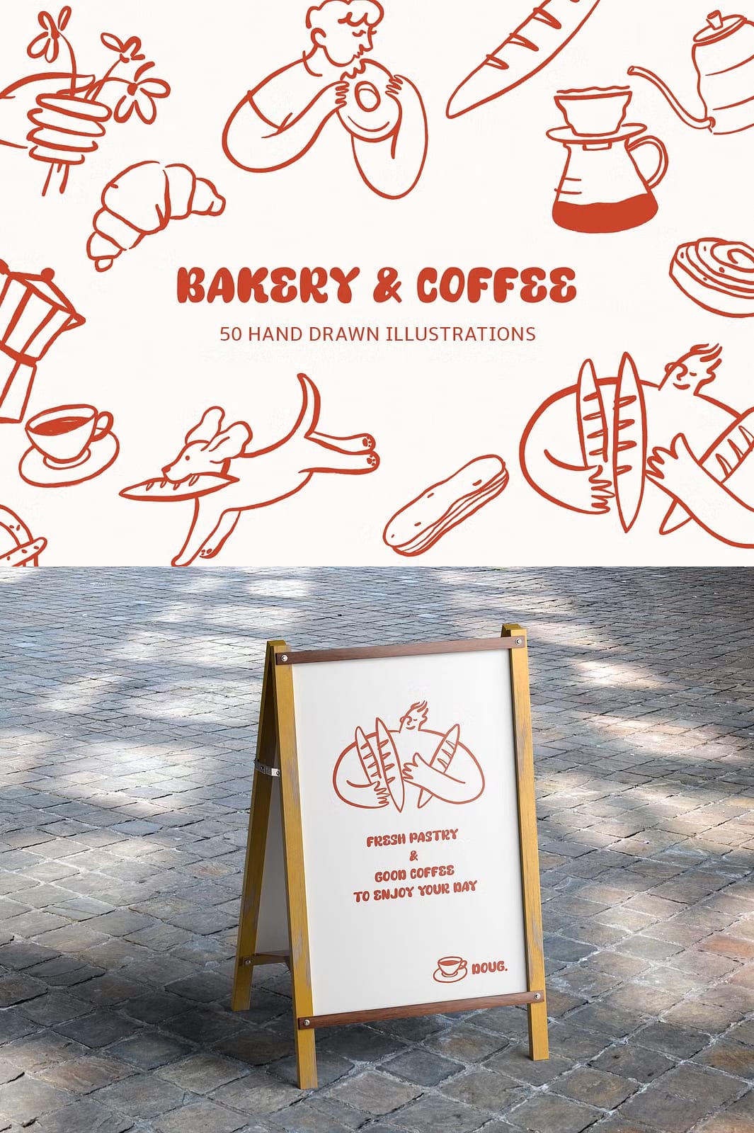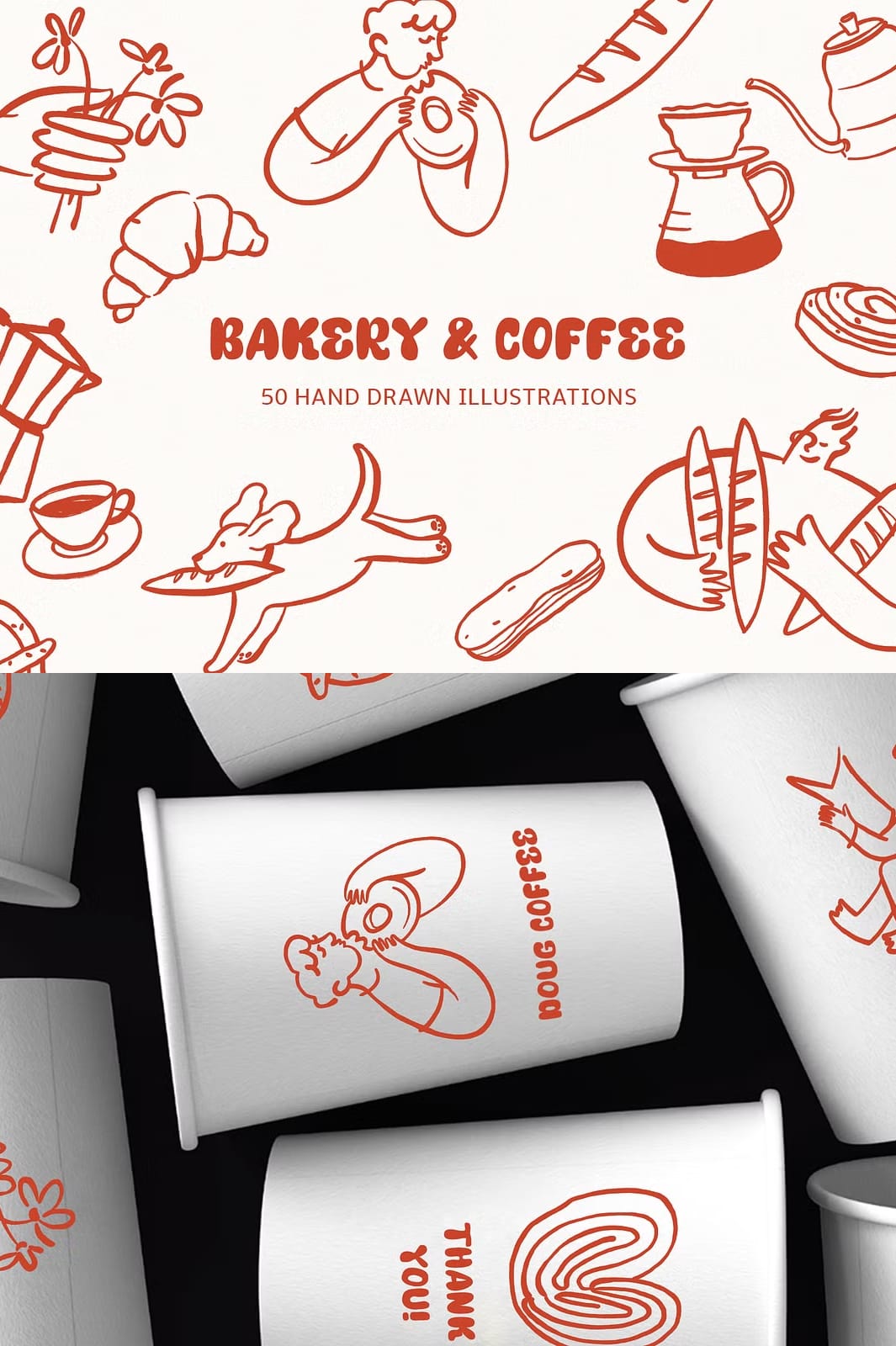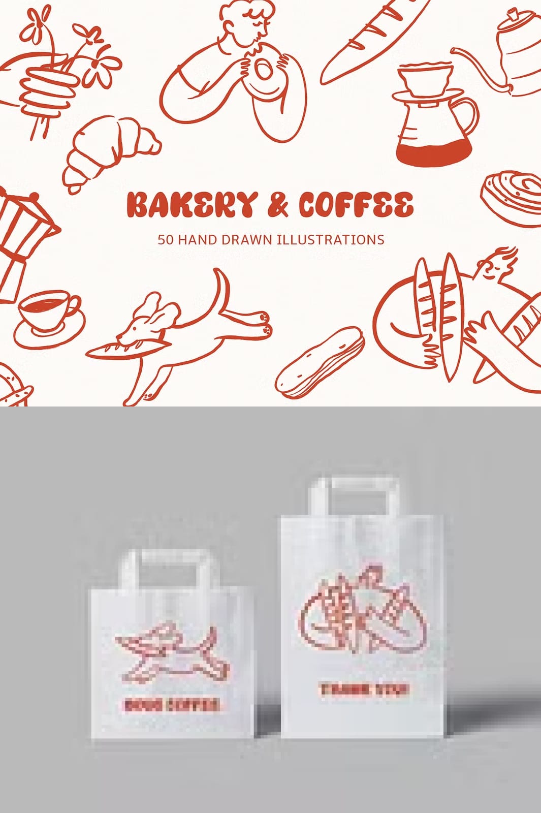 This collection offers a diverse range of illustrations that capture the essence of bakery delights and cozy café culture. Each element is meticulously hand-drawn to provide authentic, delicate details that bring your designs to life. The package includes: