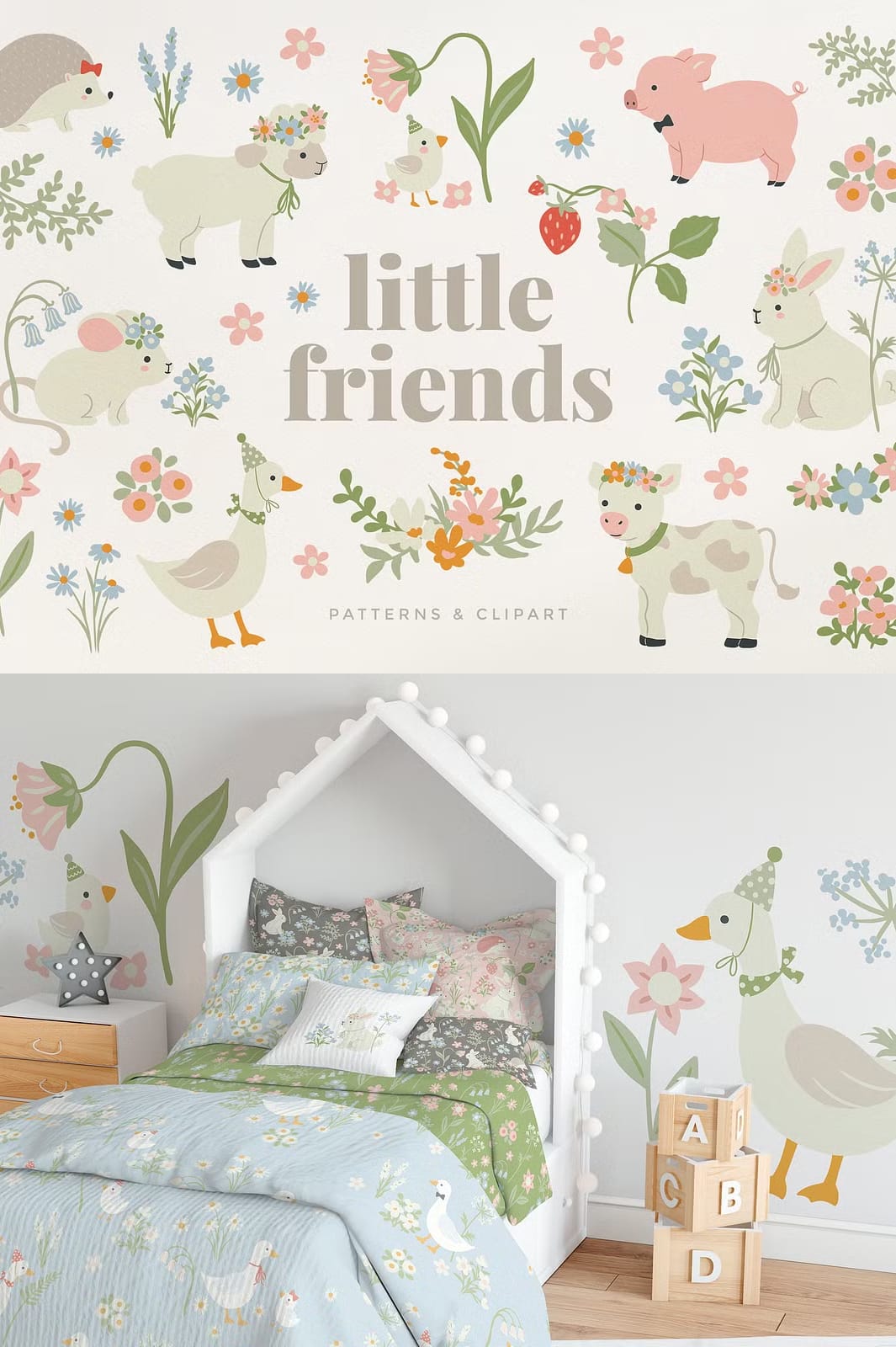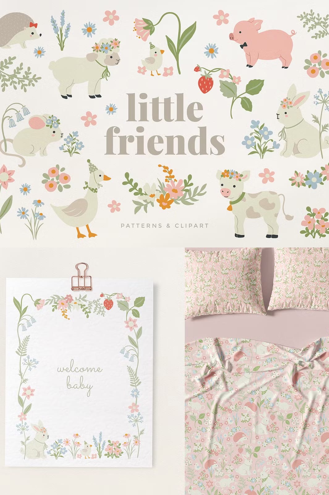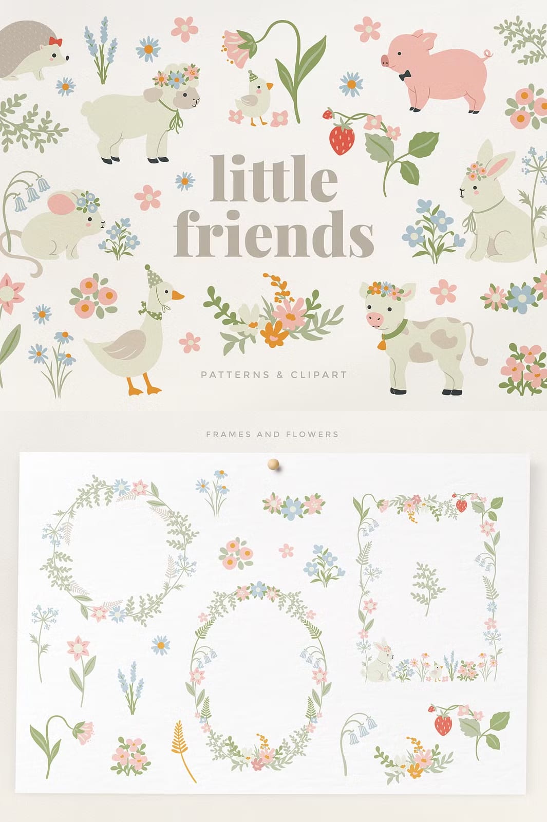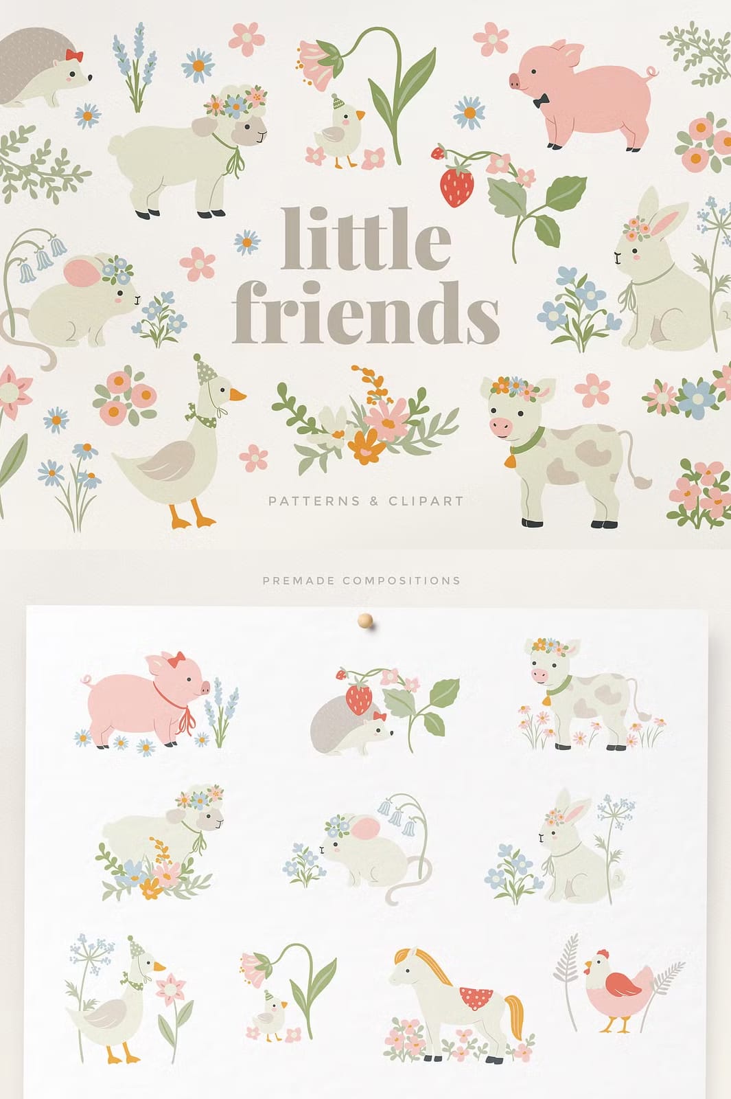Introducing the Little Friends Baby Animals Set, a delightful collection of the cutest baby animals paired with lovely decorative elements rendered in soft pastel tones. This versatile set is designed to inspire creativity across a wide range of projects, from nursery decor and fabric designs to wrapping paper, greeting cards, home decor, wall art, stationery, baby shower invitations, packaging, stickers, kids clothing, and much more. Each element is crafted to add warmth and charm, making your creations truly special and memorable.