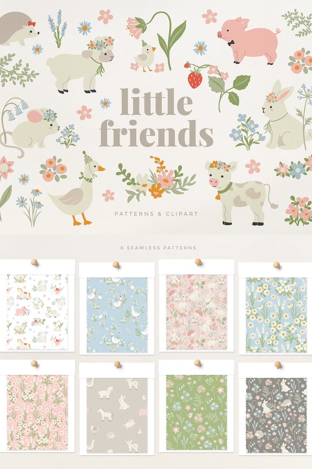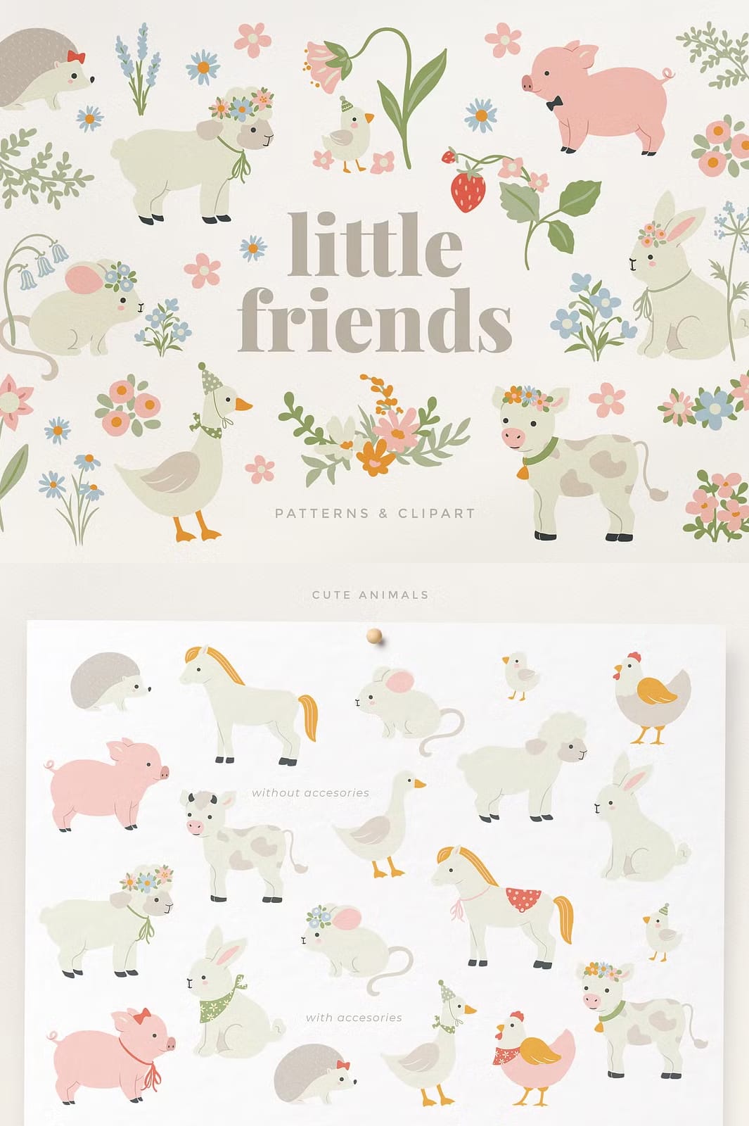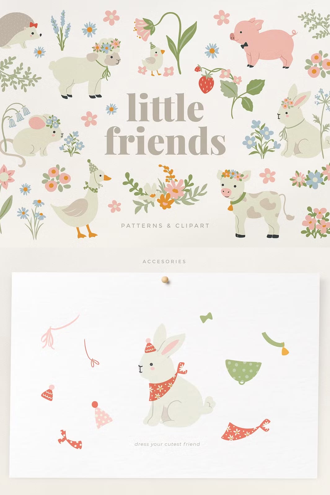 The collection offers both ready-made seamless patterns and separated clip art elements, giving you the freedom to mix, match, and personalize your designs. Animals are provided with and without accessories, allowing you to dress them yourself using the included accessories and floral elements. This flexibility ensures that your projects can be as unique and expressive as you envision.