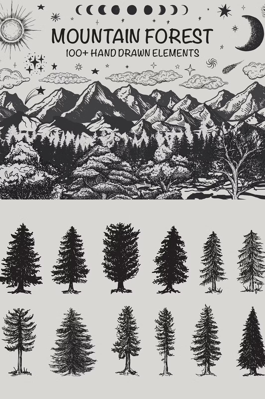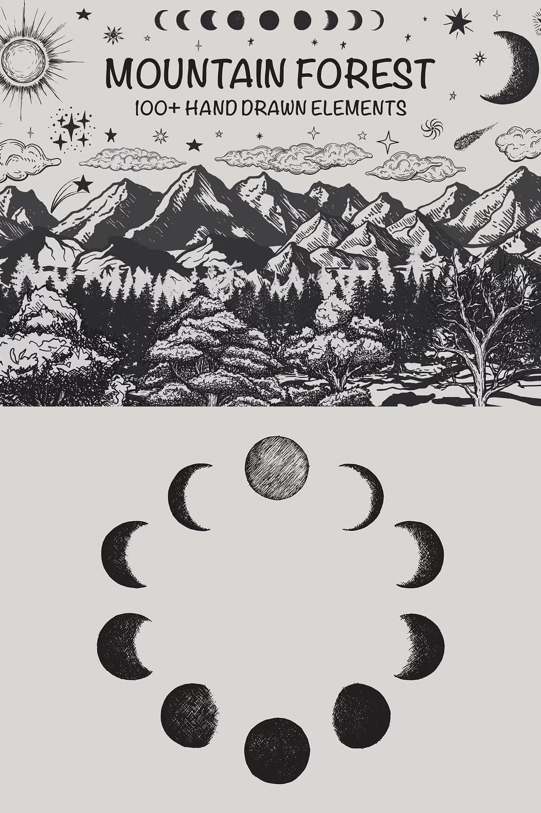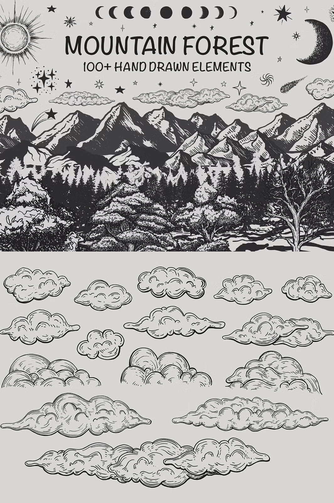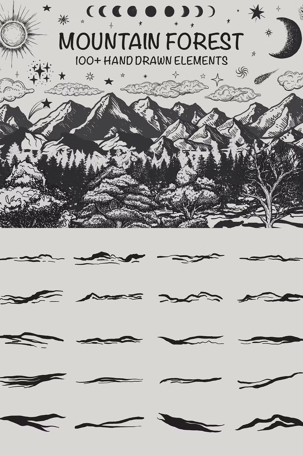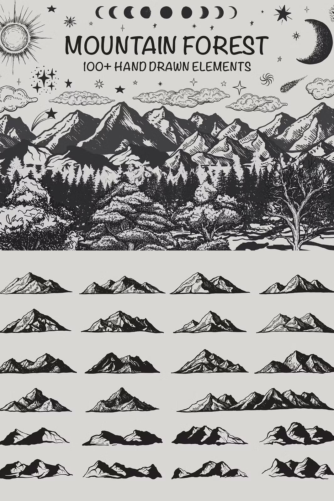 The Mountain Forest Hand-Drawn Elements collection offers a comprehensive set of 131 unique illustrations that bring the serene and majestic atmosphere of mountain landscapes directly to your creative work. This set features a wide variety of elements including mountains, trees, landforms, moon phases, sun, clouds, stars, and comets, all rendered in a distinctive hand-drawn style that combines rustic charm with artistic precision.