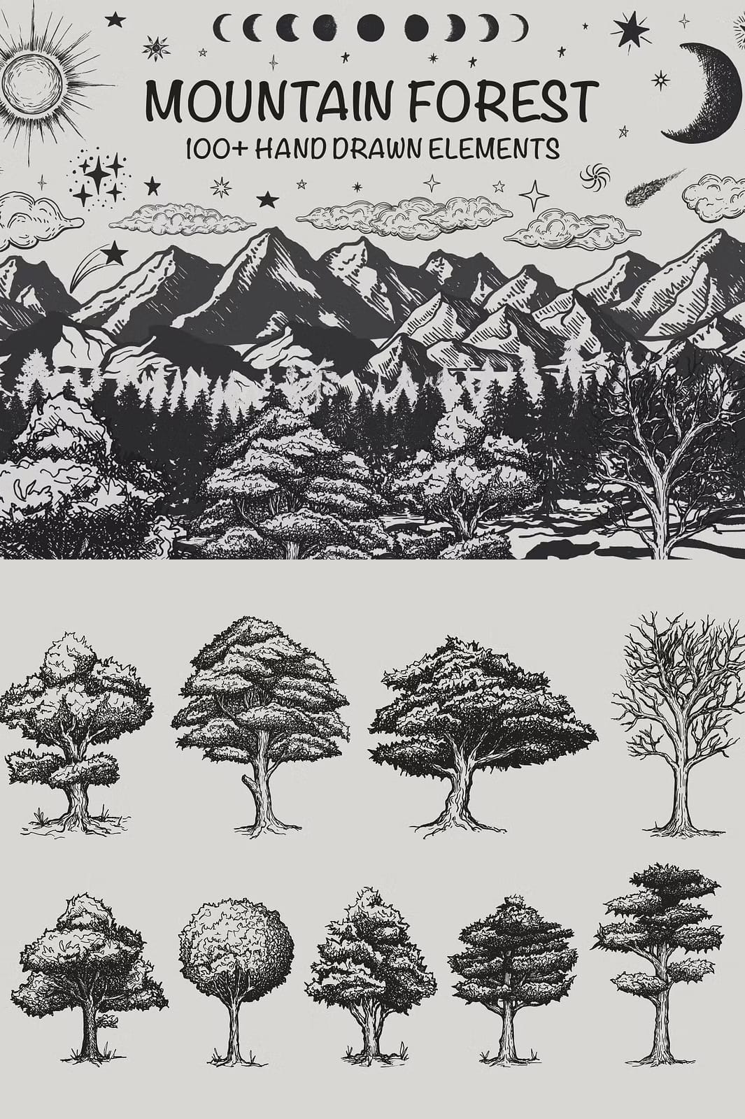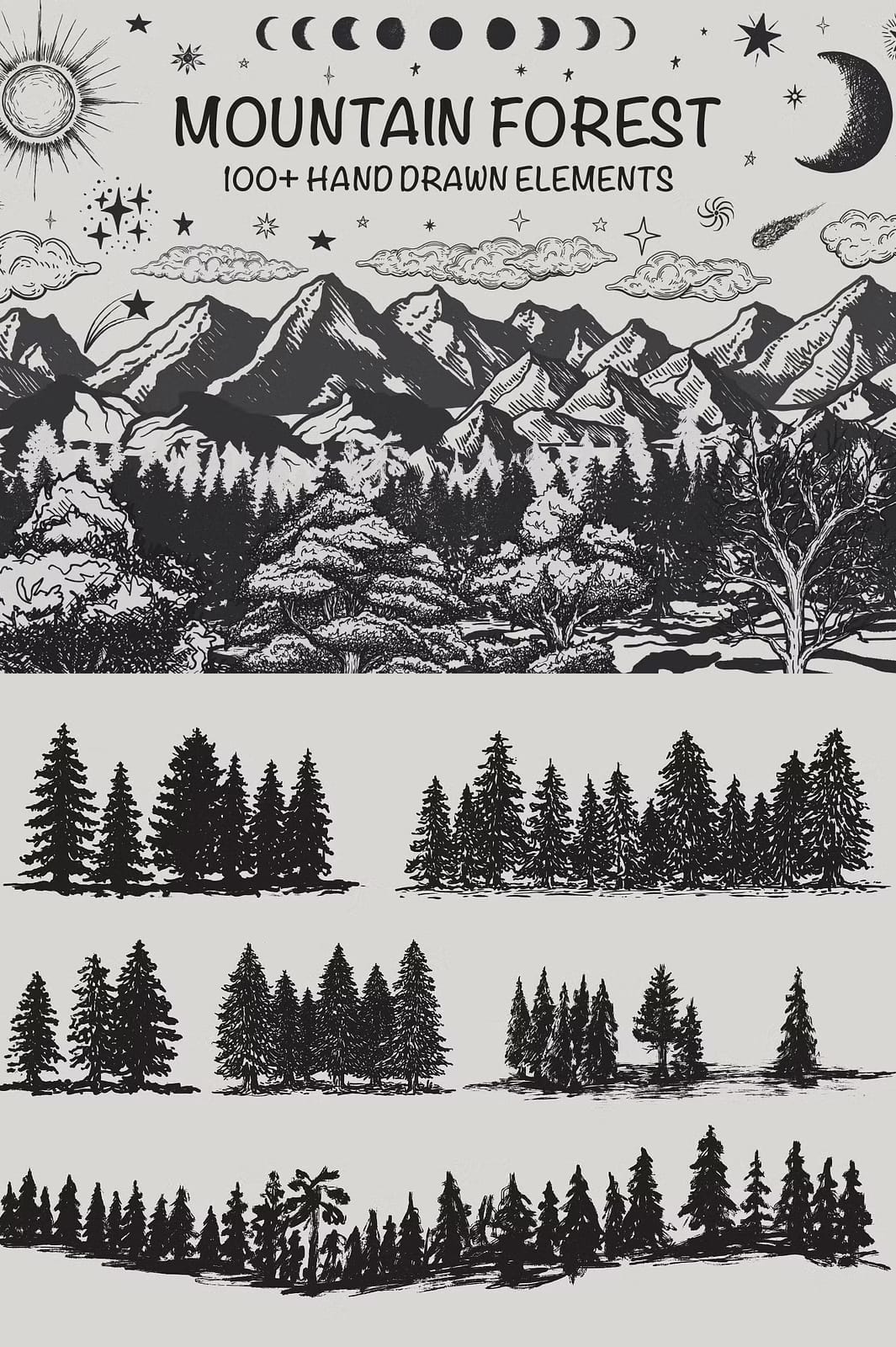 This collection covers a broad spectrum of natural and celestial elements that capture the essence of mountain forest landscapes. You will find detailed illustrations of: