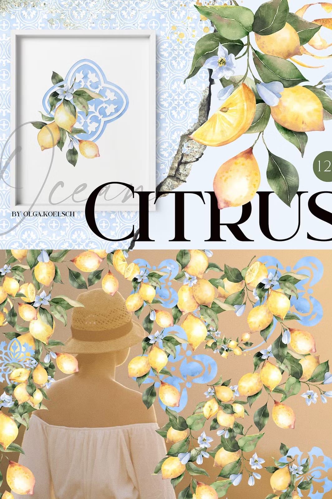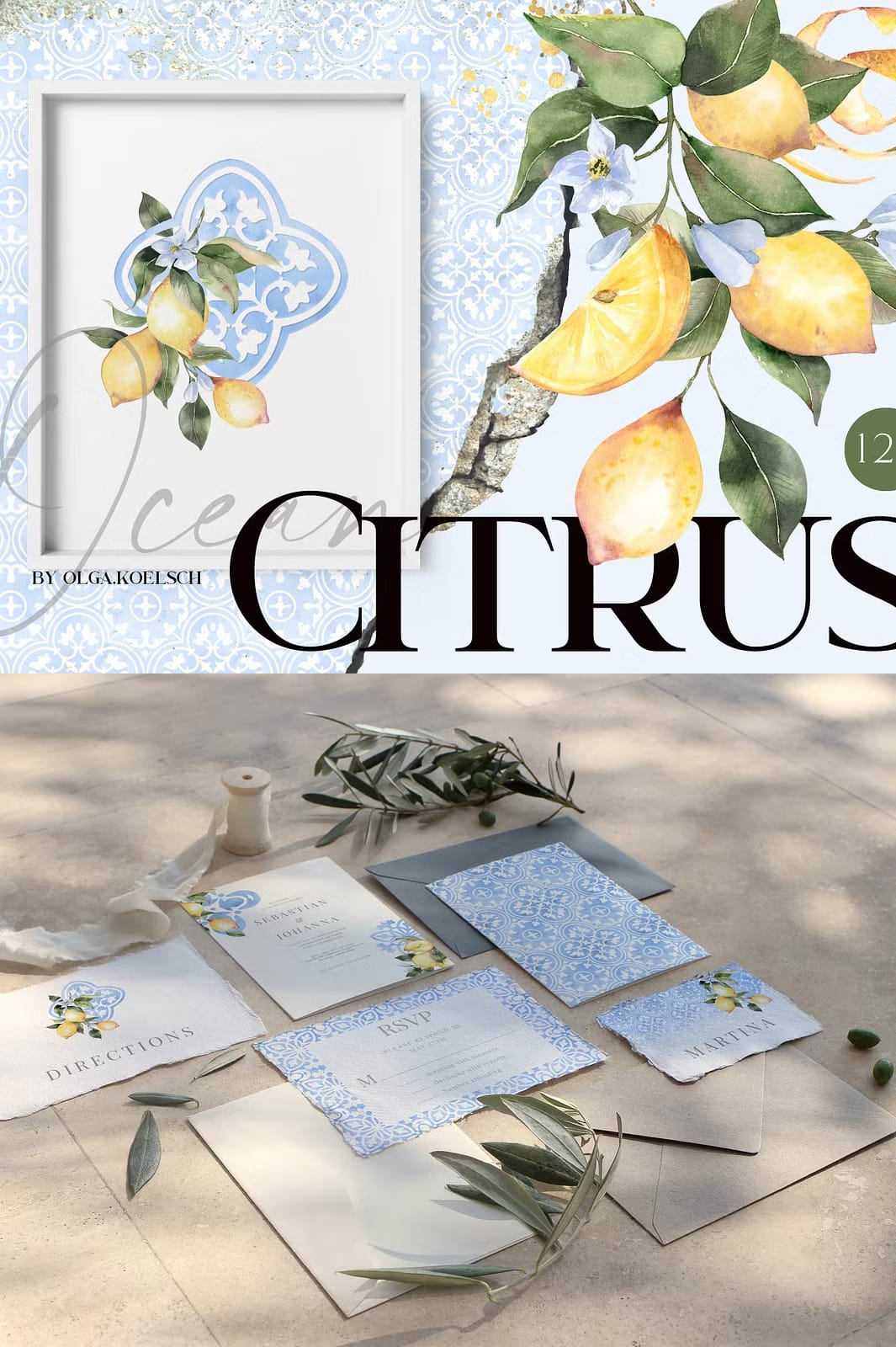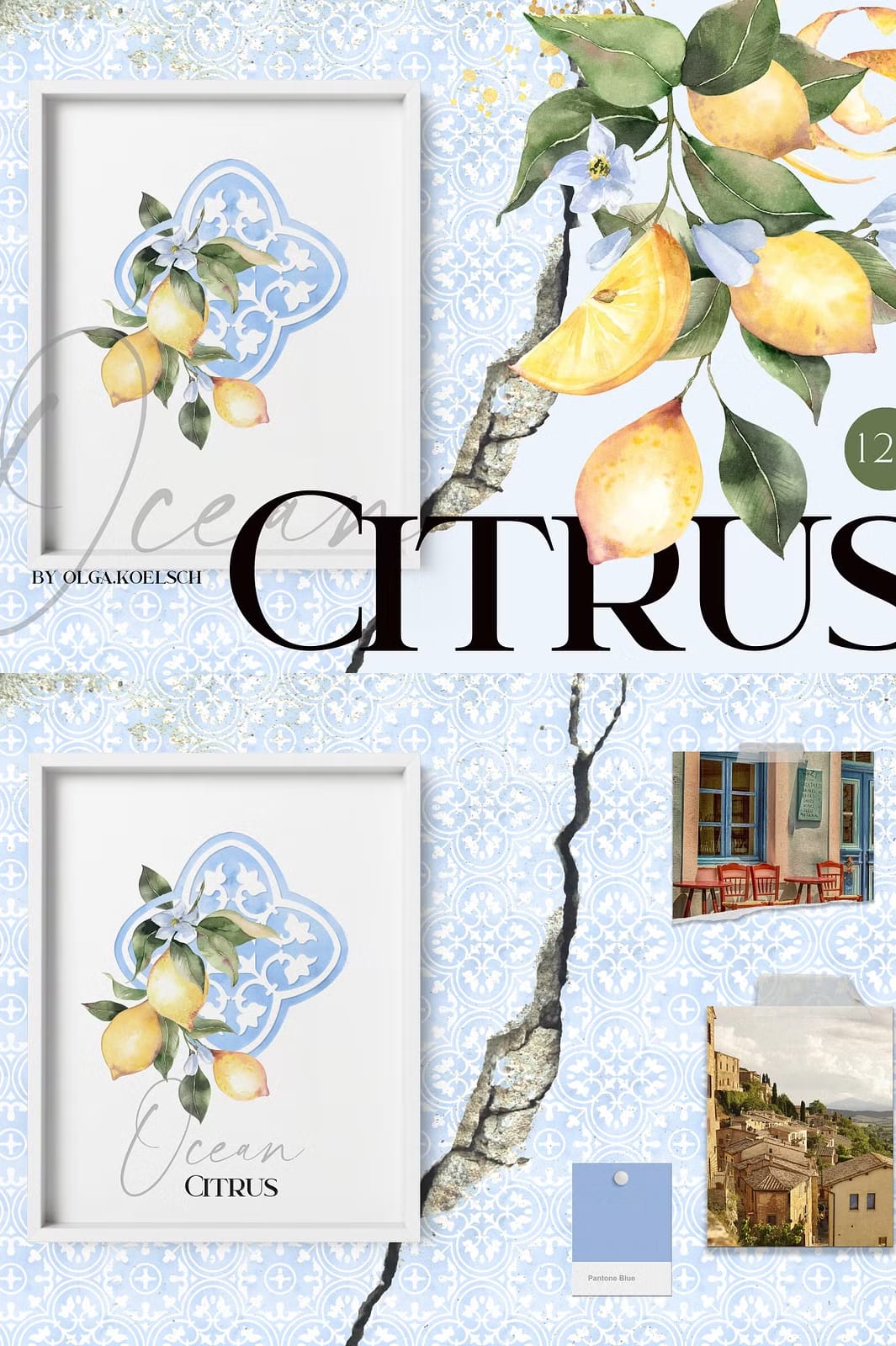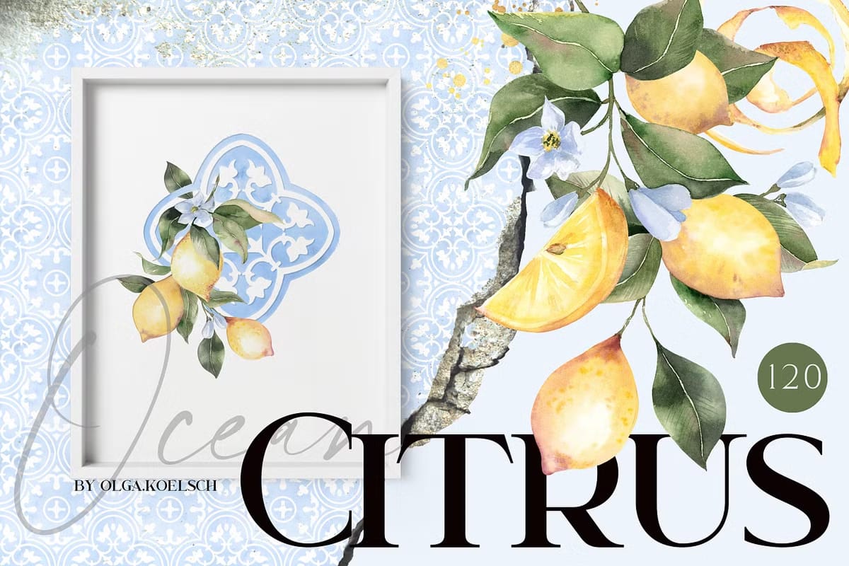 Immerse yourself in the captivating beauty of the Ocean Citrus Watercolor Set, a unique collection that masterfully blends modern watercolor citrus illustrations with classic traditional tile ornaments in soothing ocean blue tones. This versatile set is designed to inspire and elevate a wide range of creative projects, from wedding invitations and packaging to web pages, social media content, souvenirs, posters, home textiles, and wrapping paper. With over 120 high-resolution graphics, this collection offers endless possibilities to bring your artistic vision to life with vibrant color and timeless style.