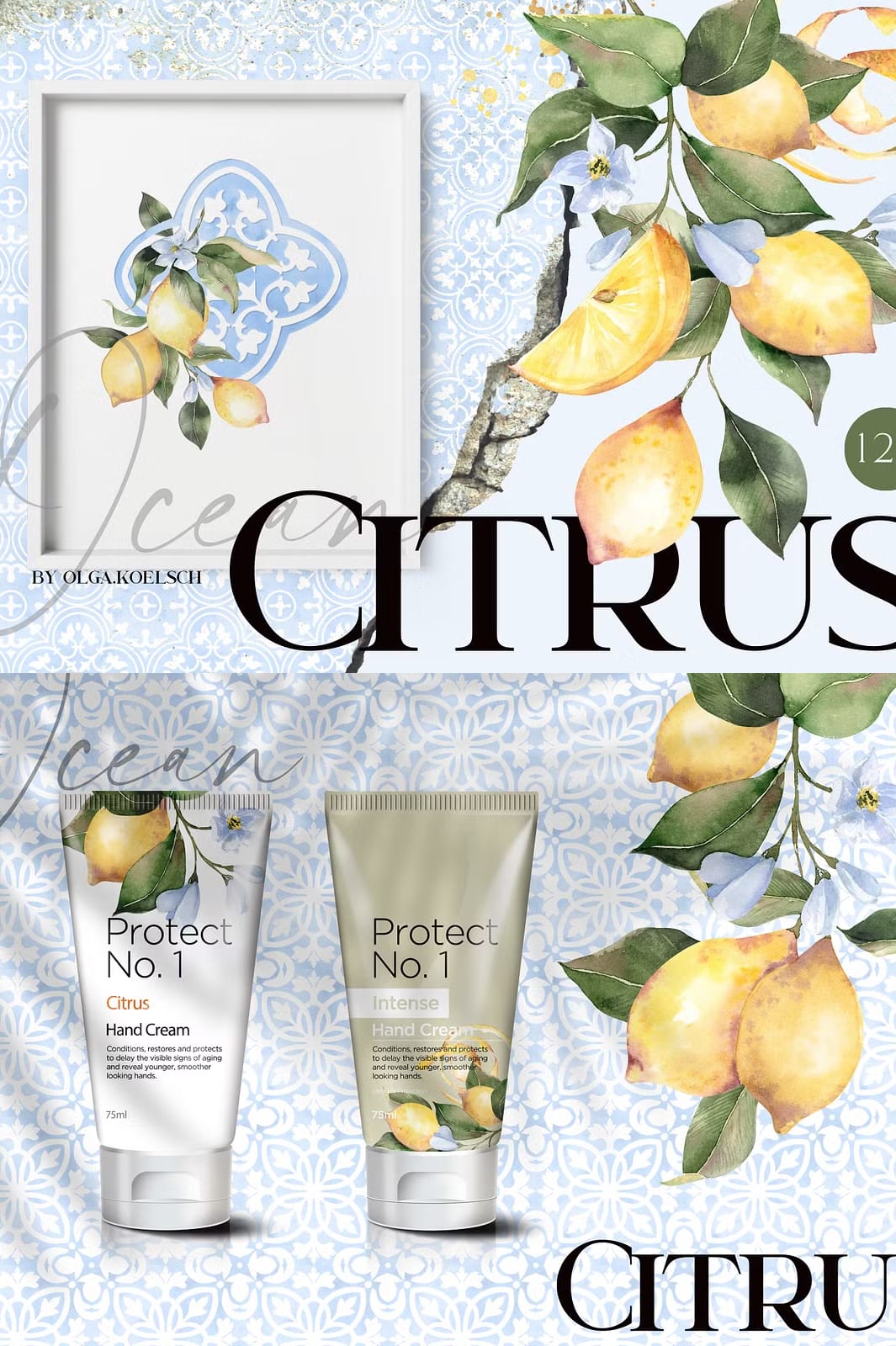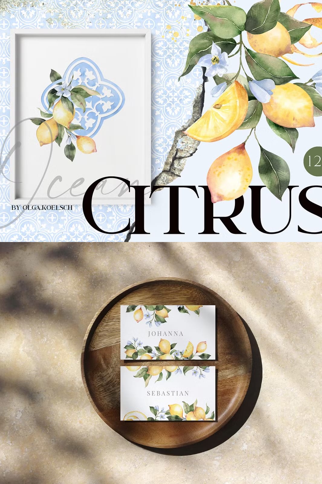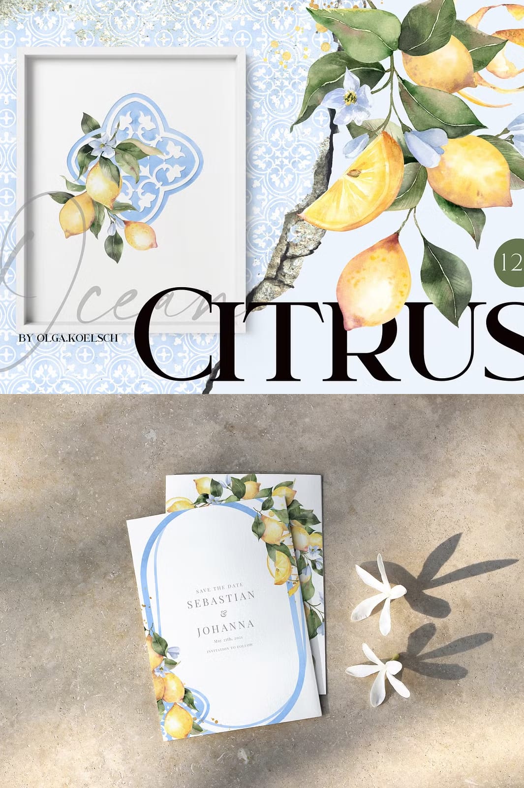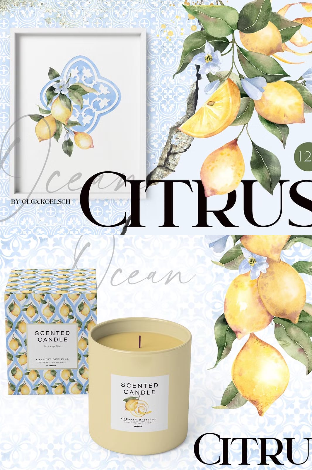 Immerse yourself in the captivating beauty of the Ocean Citrus Watercolor Set, a unique collection that masterfully blends modern watercolor citrus illustrations with classic traditional tile ornaments in soothing ocean blue tones. This versatile set is designed to inspire and elevate a wide range of creative projects, from wedding invitations and packaging to web pages, social media content, souvenirs, posters, home textiles, and wrapping paper. With over 120 high-resolution graphics, this collection offers endless possibilities to bring your artistic vision to life with vibrant color and timeless style.
