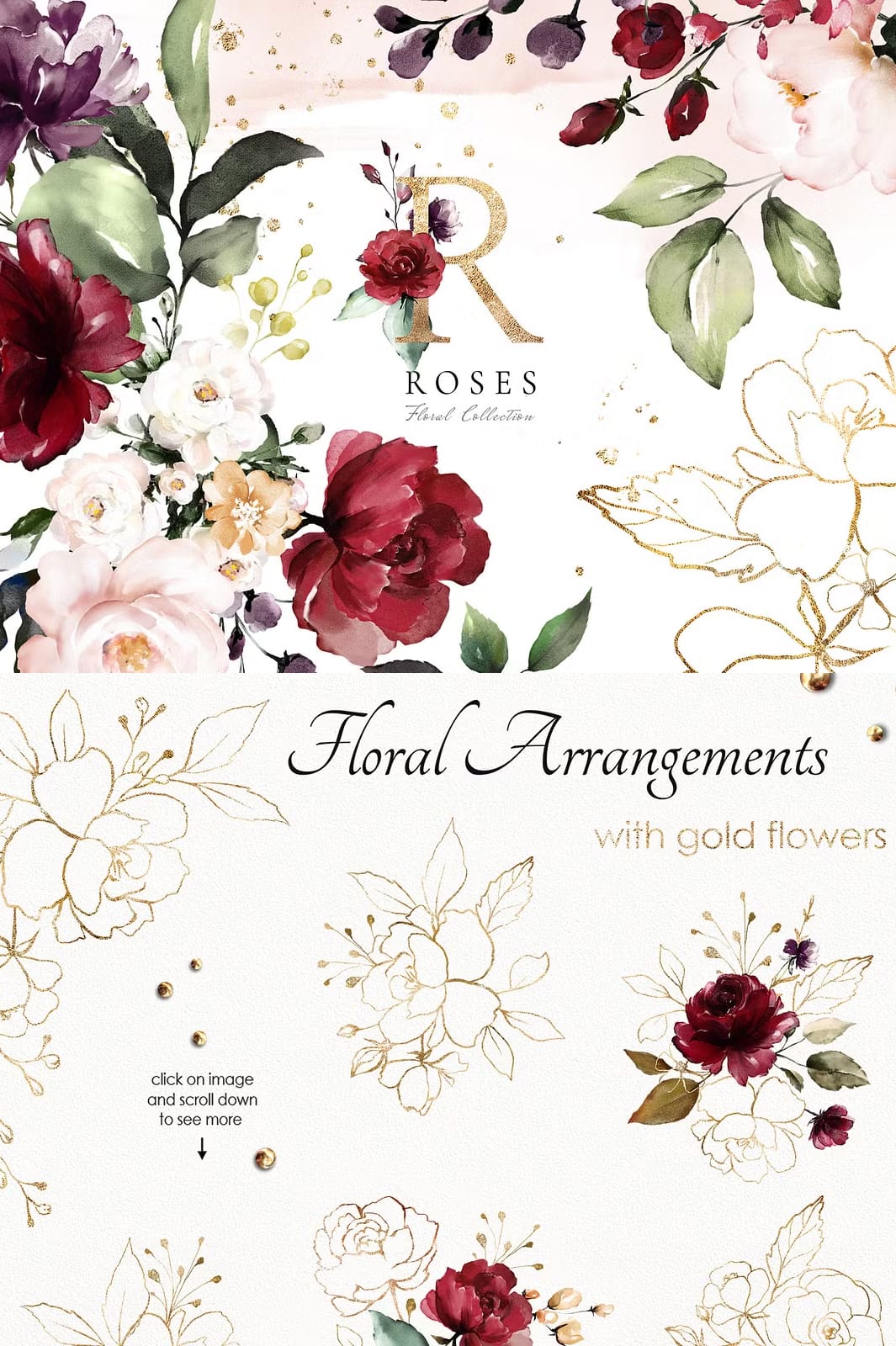 | Floral Arrangements | Watercolor flowers combined with elegant gold accents, perfect for focal design elements. | 45 PNG files |