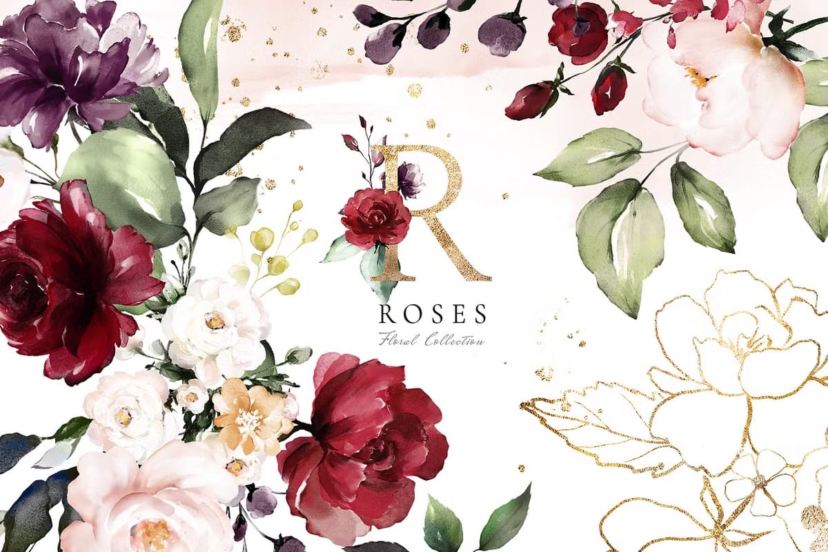 The Roses Watercolor Floral Collection offers a stunning array of hand-painted floral elements designed to bring sophistication and charm to your creative projects. This collection is perfect for designers, artists, and crafters who want to infuse their work with the delicate beauty of watercolor roses combined with luxurious gold and geometric accents.