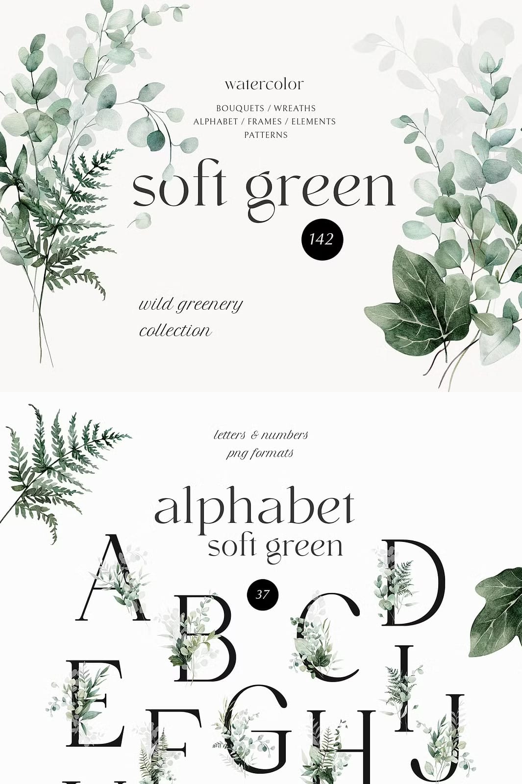 I am delighted to introduce the Soft Green Collection, a beautifully crafted set inspired by the calming hues and delicate forms of nature. This collection features an exquisite array of watercolor illustrations including eucalyptus twigs, fern fronds, and ivy leaves, designed to infuse your projects with natural elegance and harmony.