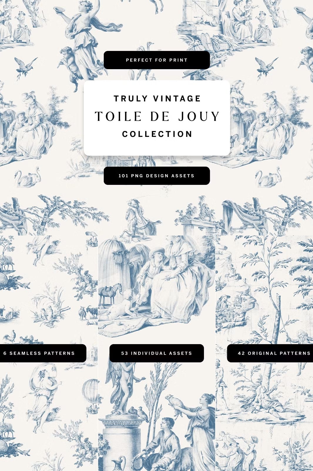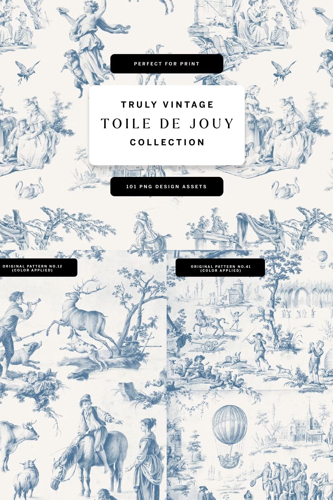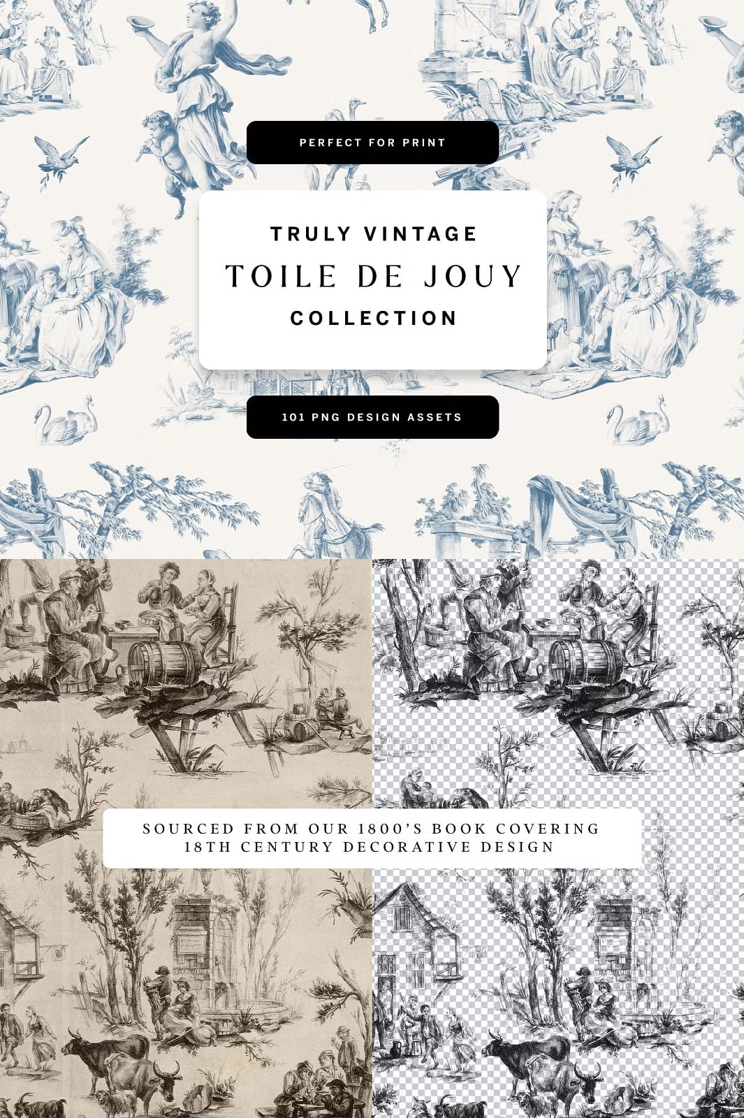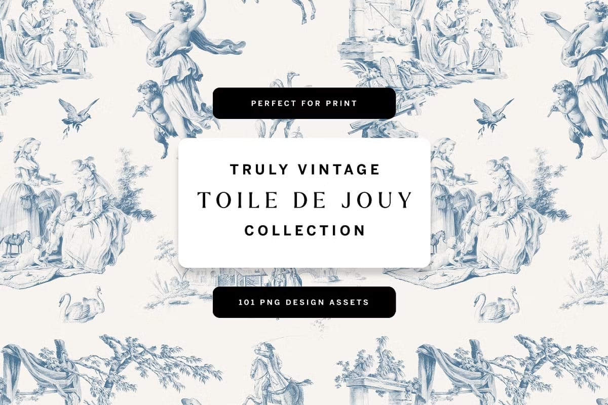 Introducing our exquisite Toile De Jouy Design Collection, a carefully curated set that blends the timeless charm of vintage aesthetics with the fresh flair of contemporary design. This collection is a treasure trove of original vintage Toile de Jouy patterns and design elements, crafted to inspire and elevate your creative projects.