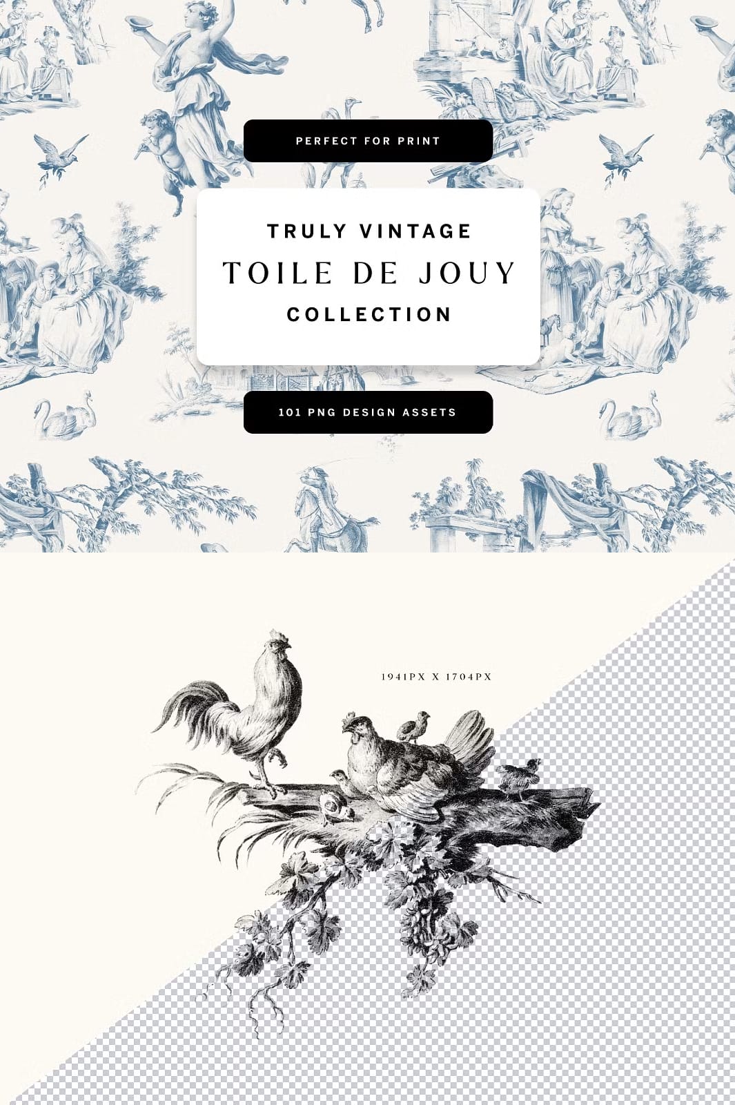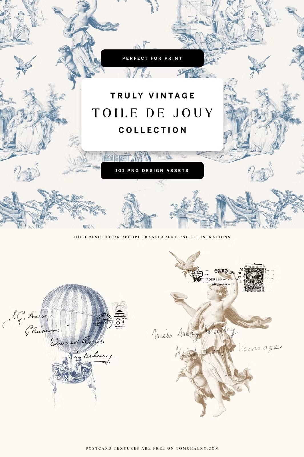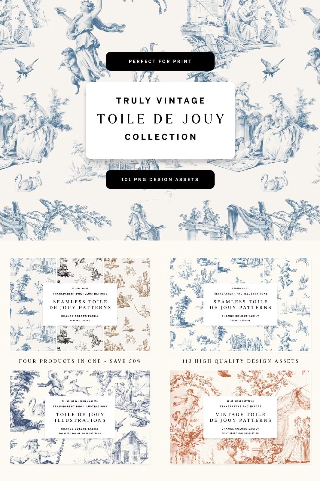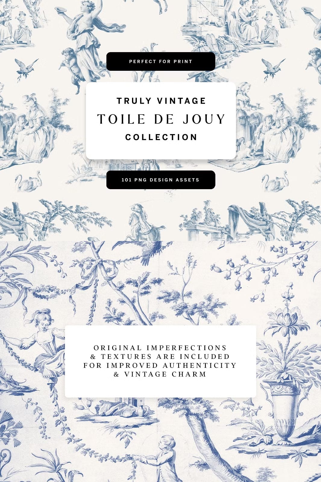 Introducing our exquisite Toile De Jouy Design Collection, a carefully curated set that blends the timeless charm of vintage aesthetics with the fresh flair of contemporary design. This collection is a treasure trove of original vintage Toile de Jouy patterns and design elements, crafted to inspire and elevate your creative projects.