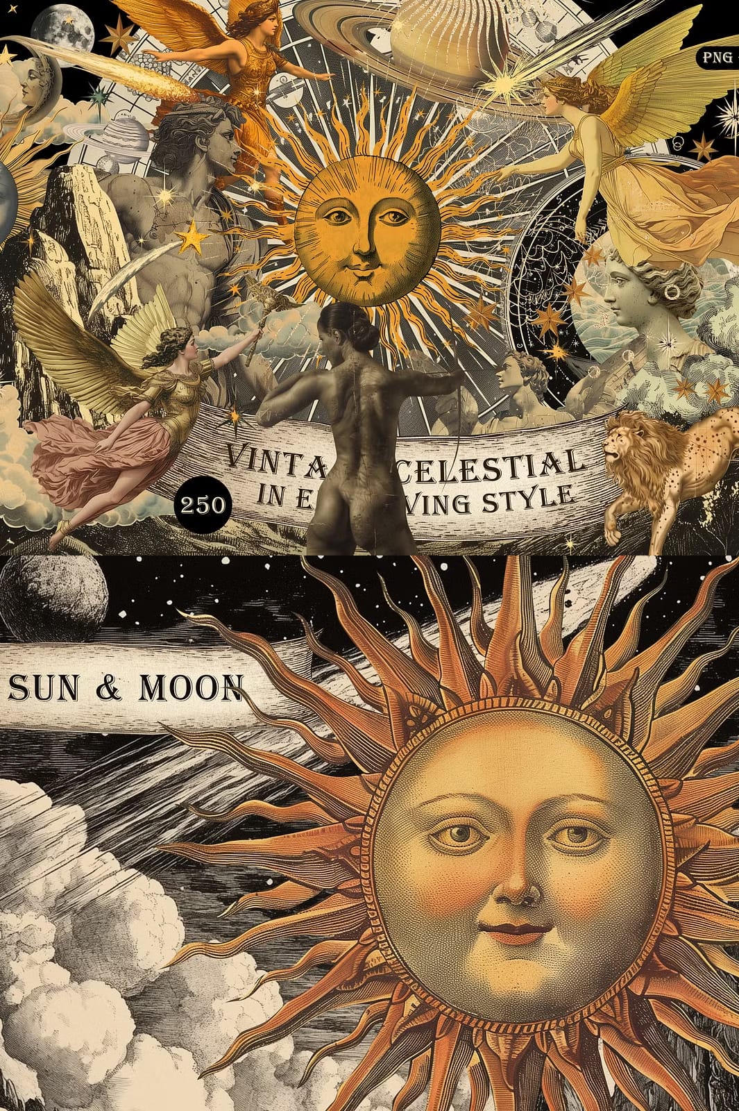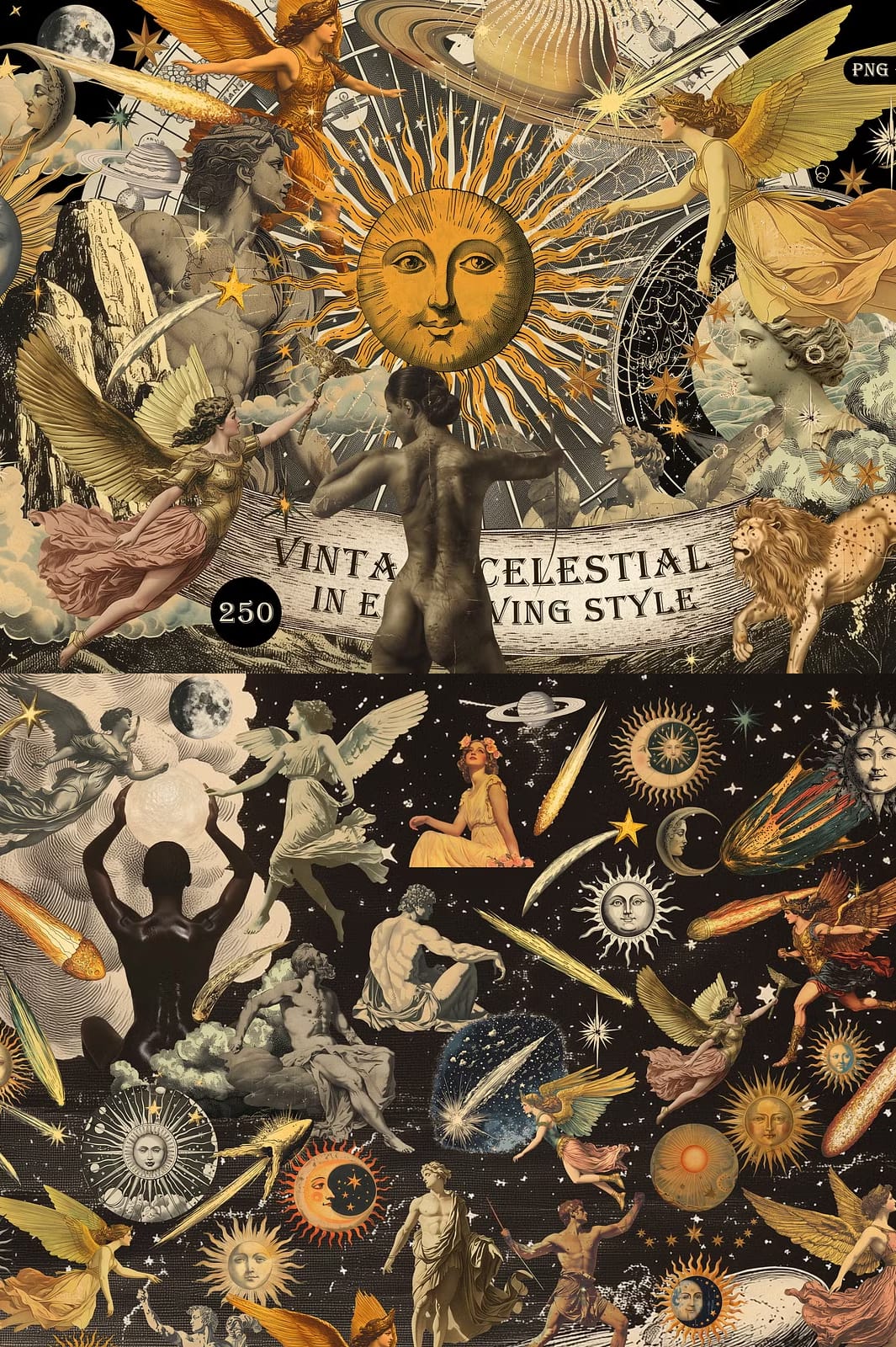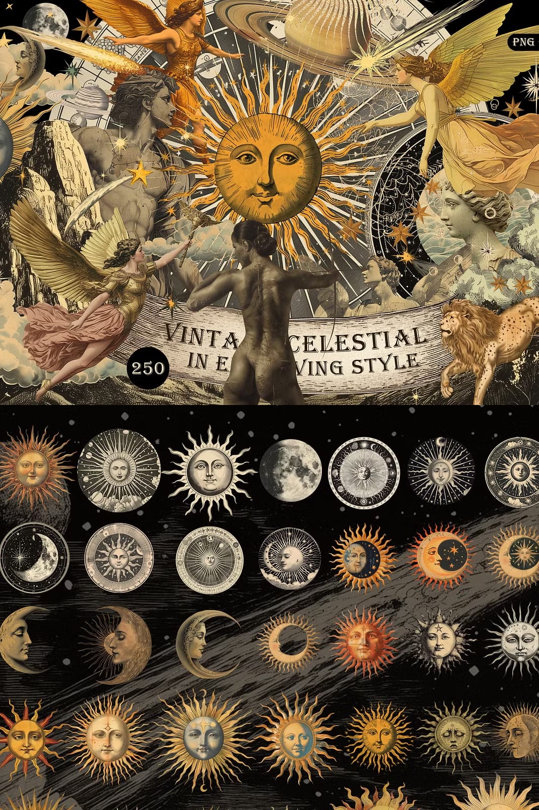 This vintage celestial collection is designed to actively enhance your creative workflow. Use these elements to: