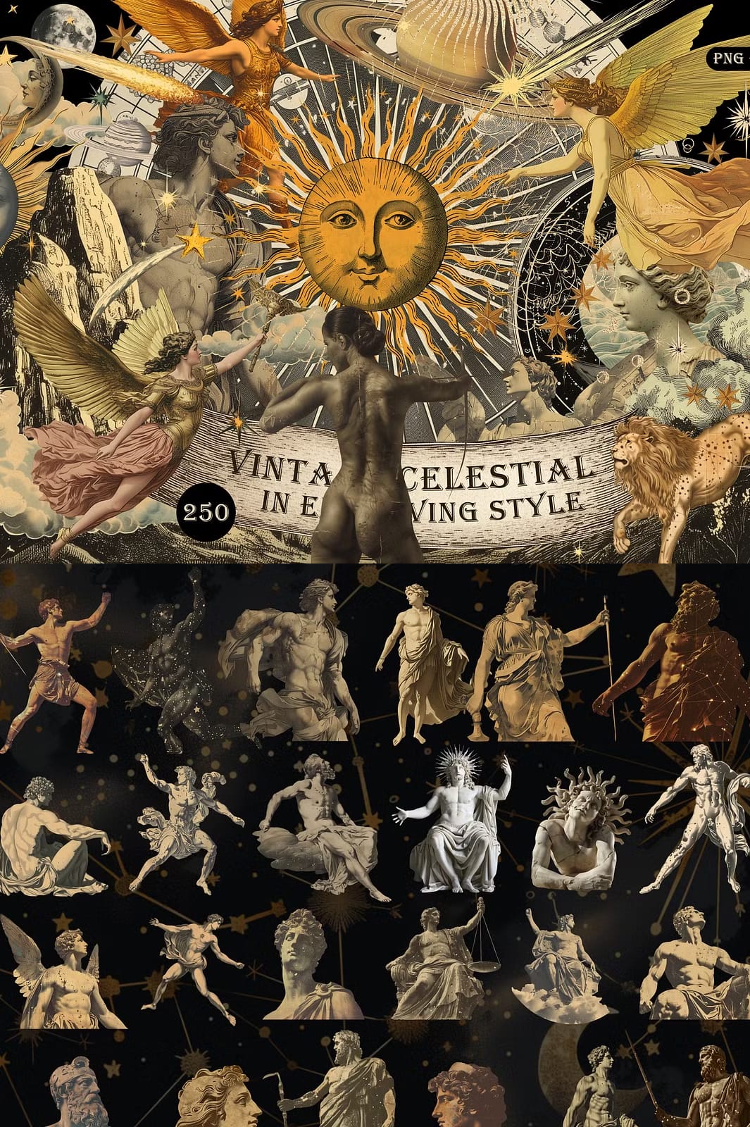 Discover the enchanting beauty of the vintage celestial collection, a graphic set inspired by the ancient elements and the mysterious depths of space. This collection is designed to bring a sophisticated and unique touch to your creative projects. Each element harmonizes perfectly with others, much like the notes of a melody combine to form a lyrical song. The visual components are presented on transparent backgrounds in high resolution, allowing seamless integration into your designs.