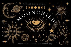 | Gold Celestial PNGs | Elegant gold hand-drawn celestial elements on transparent backgrounds. | 62 elements, 3000×3000 px, 300 dpi |