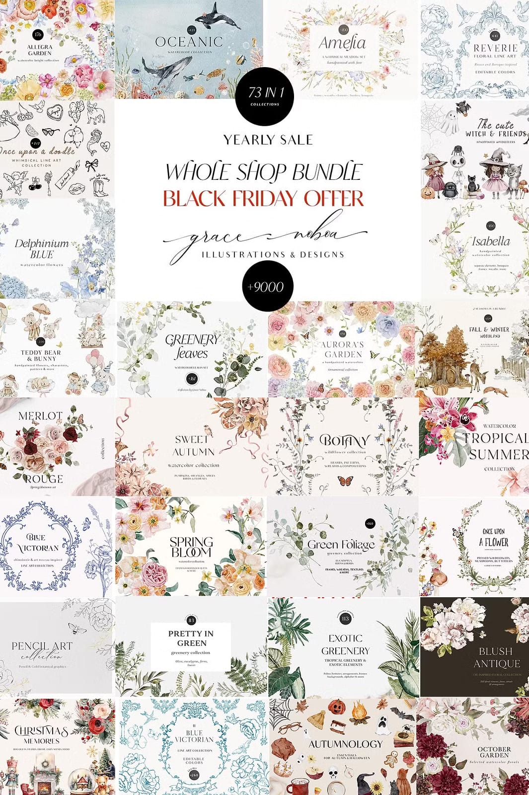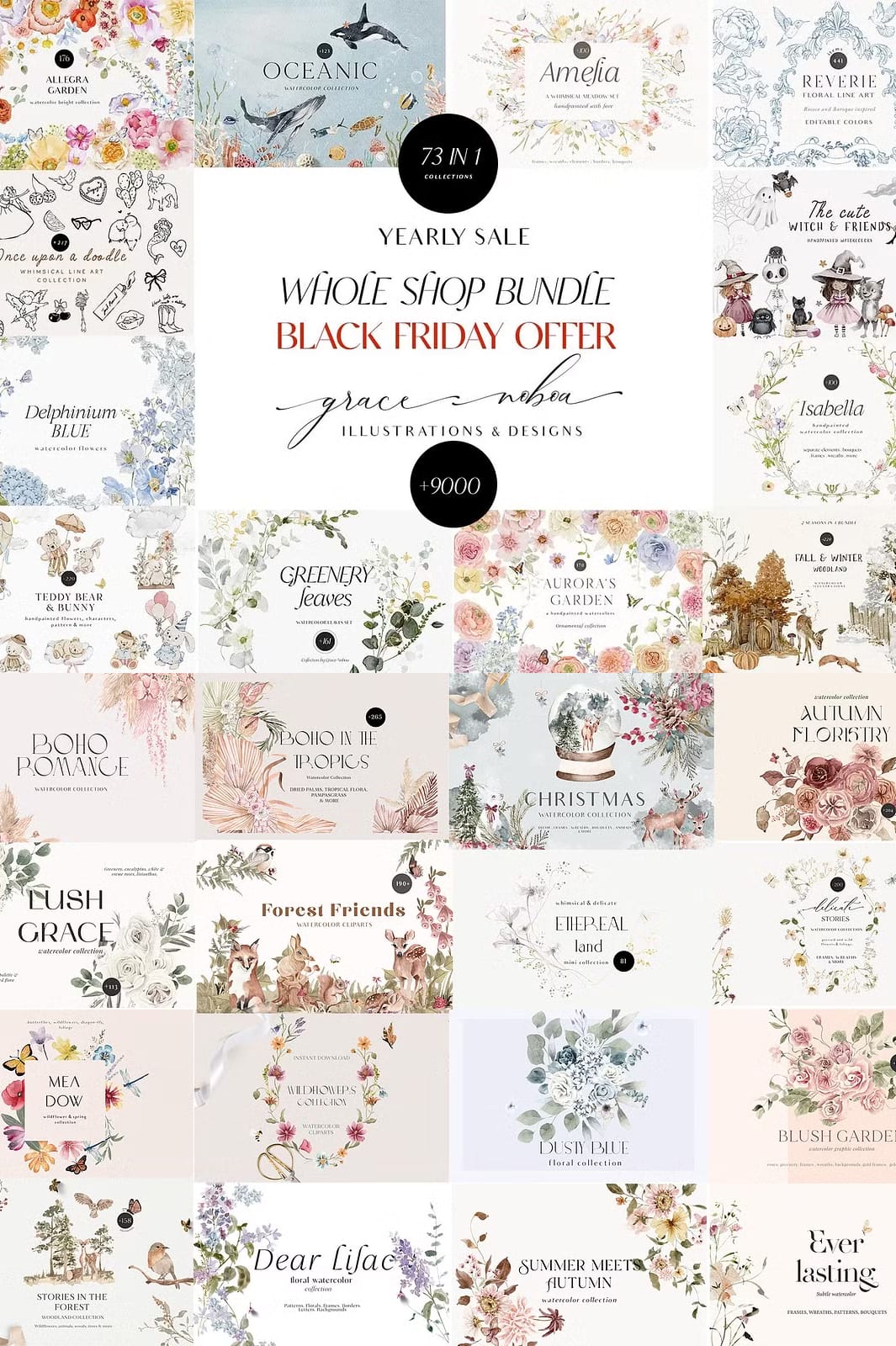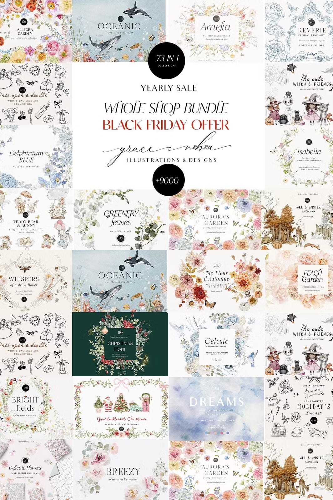 Welcome to the ultimate creative resource — the Whole Shop Clipart Graphic Bundle. This exclusive bundle brings together all 73 of my meticulously crafted collections into one comprehensive package, designed to fuel your creativity throughout the year. Whether you are a professional designer, crafter, or hobbyist, this bundle offers an unparalleled variety of watercolor elements, vector graphics, illustrations, seamless patterns, and more, all created with love and attention to detail.
