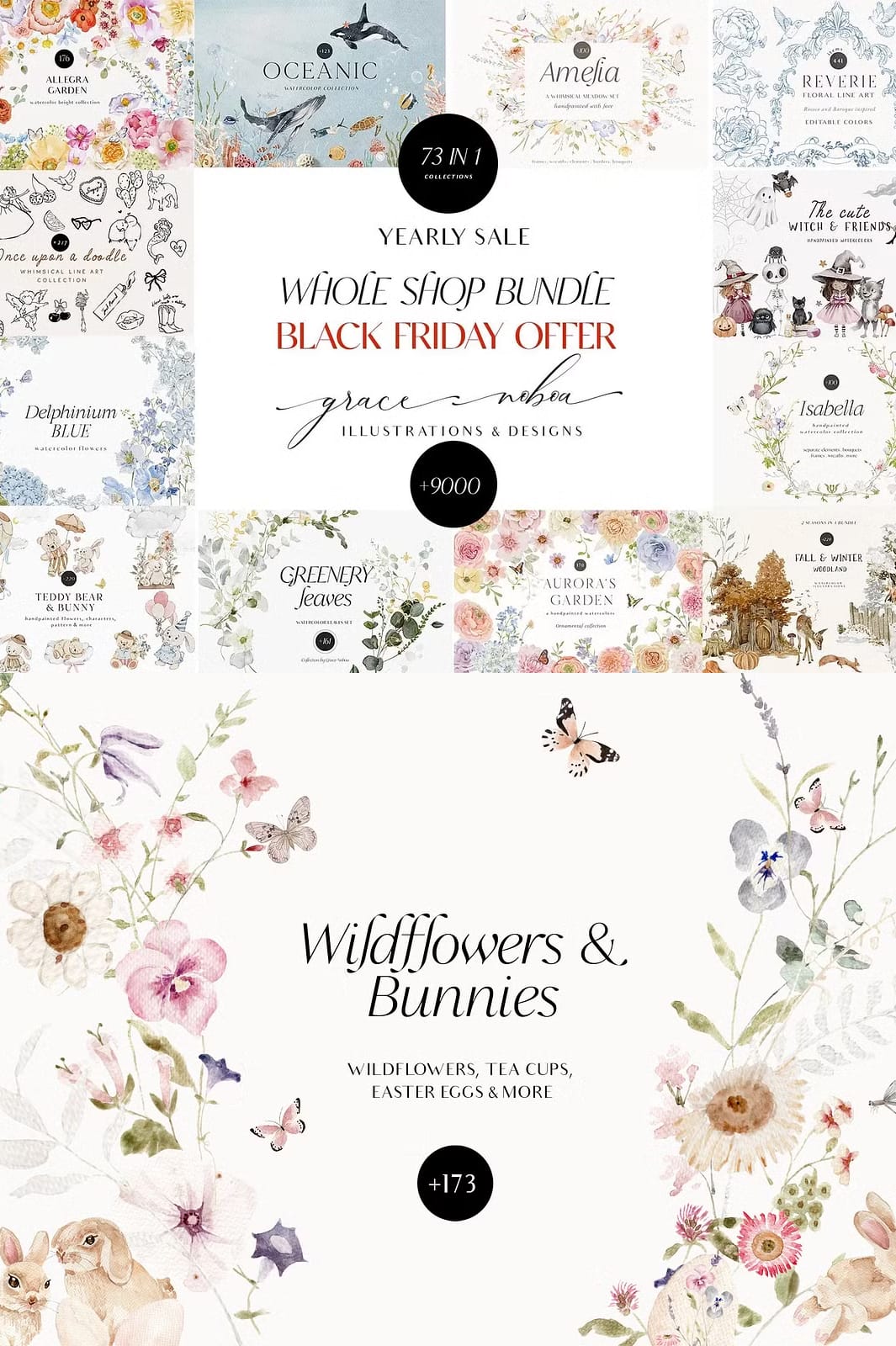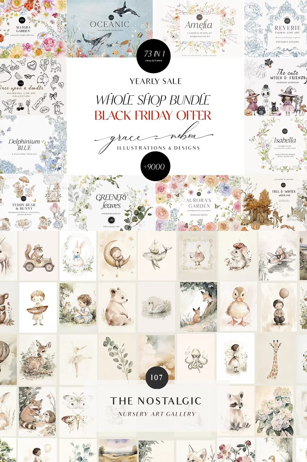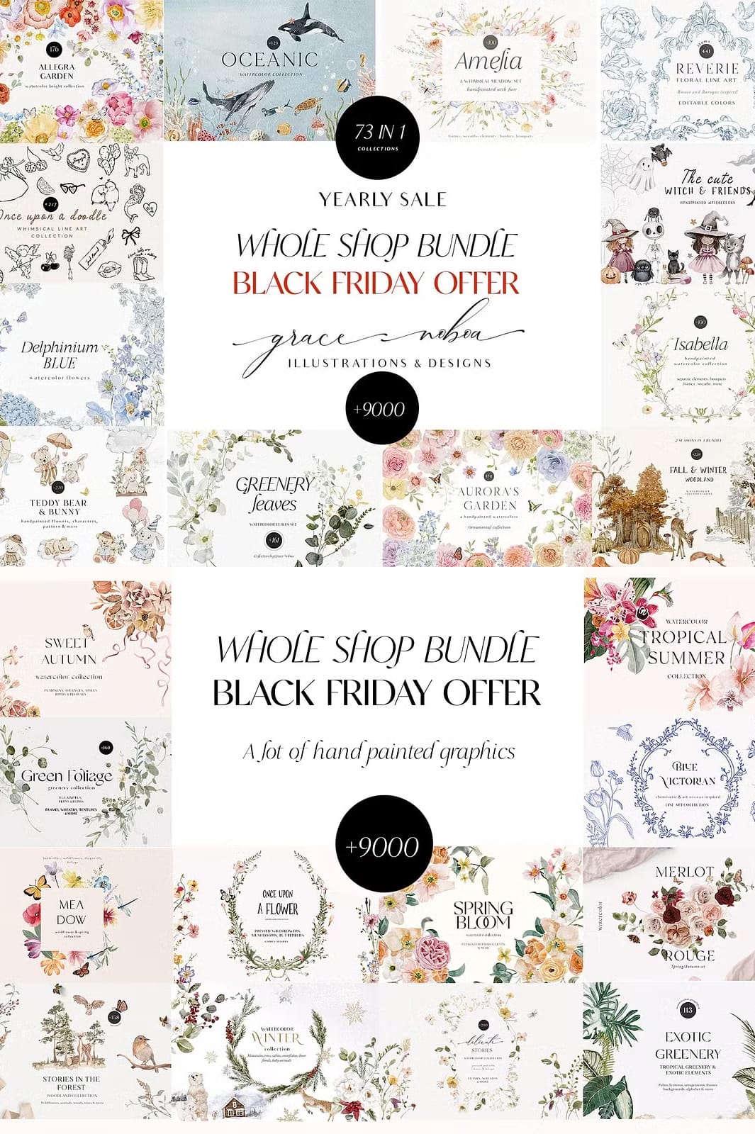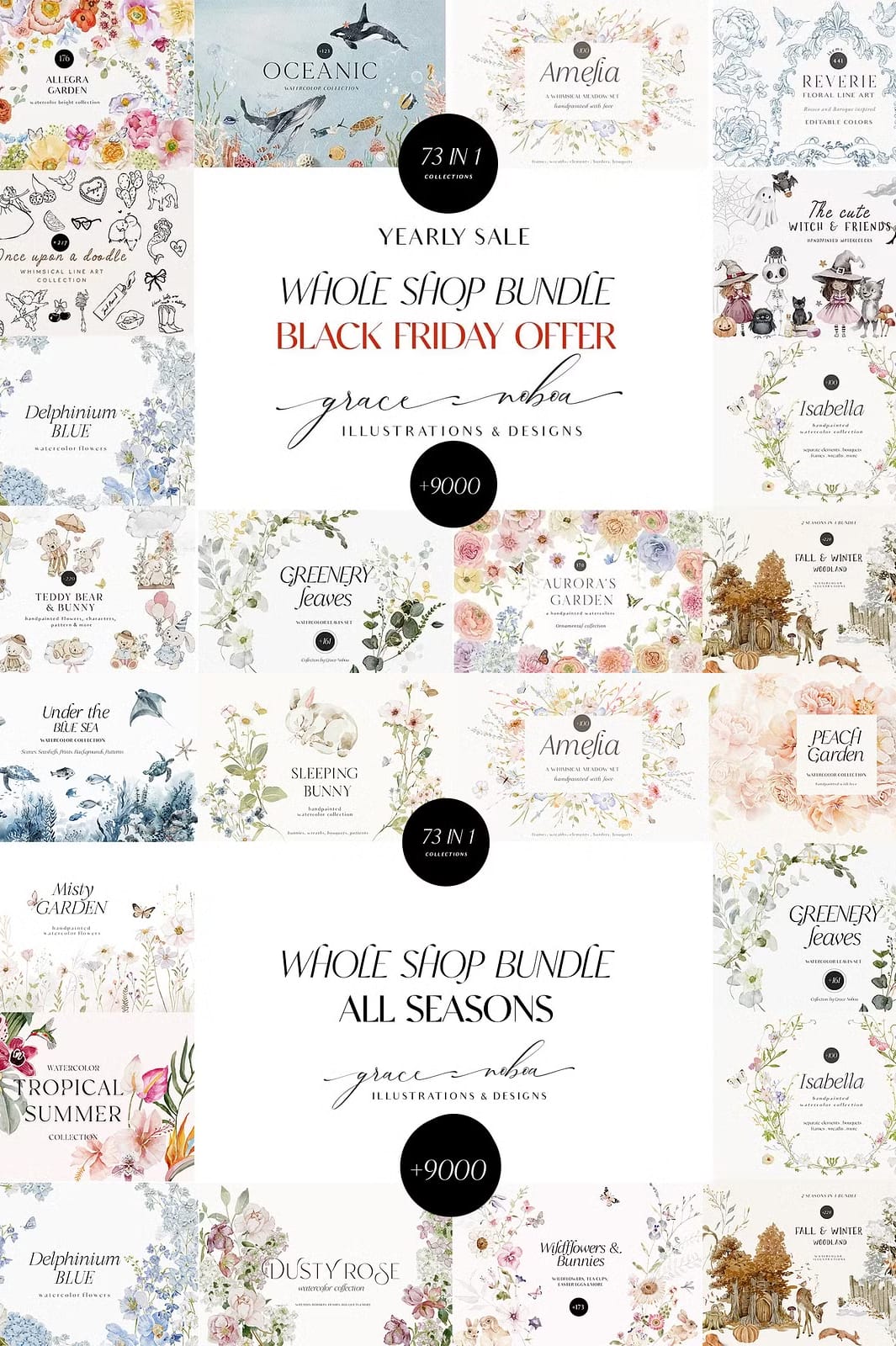 Welcome to the ultimate creative resource — the Whole Shop Clipart Graphic Bundle. This exclusive bundle brings together all 73 of my meticulously crafted collections into one comprehensive package, designed to fuel your creativity throughout the year. Whether you are a professional designer, crafter, or hobbyist, this bundle offers an unparalleled variety of watercolor elements, vector graphics, illustrations, seamless patterns, and more, all created with love and attention to detail.