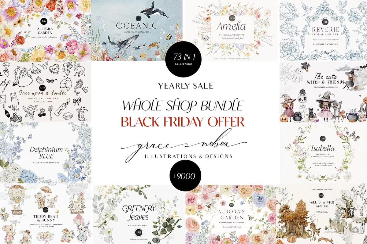 This Black Friday special gives you instant access to a vast library of design assets that cover every season, style, and theme imaginable. From delicate floral watercolors to bold vector illustrations, from trendy patterns to charming hand-lettered quotes, this bundle equips you with everything you need to create stunning wedding invitations, birthday cards, nursery decor, branding materials, scrapbooking projects, textile designs, and much more.