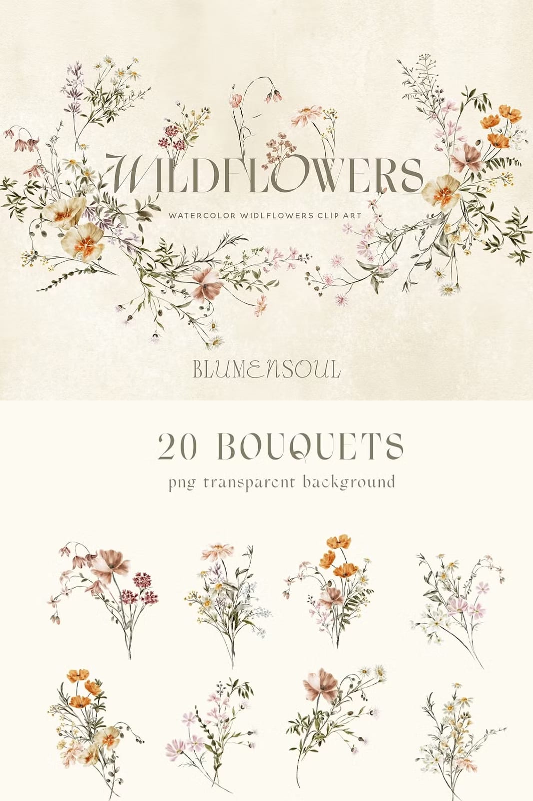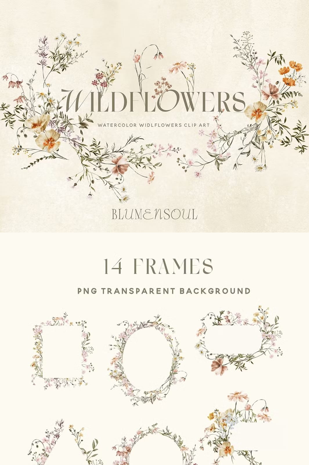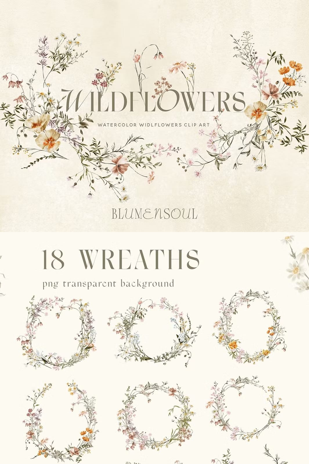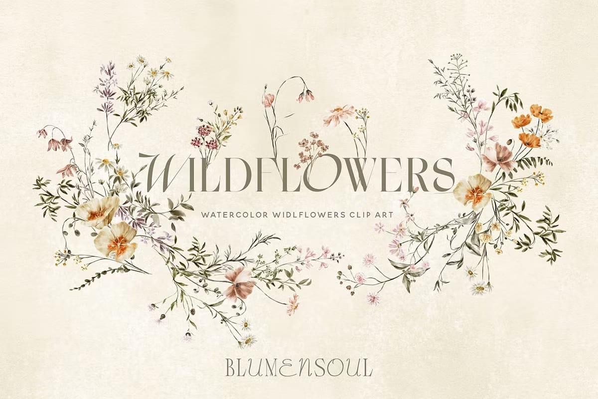 Discover the Wildflowers Watercolor Flowers Clip Art Collection, a stunning assortment of hand-painted floral elements designed to add a touch of natural charm and sophistication to your creative projects. This collection features a diverse range of wildflower illustrations, including individual elements, bouquets, frames, wreaths, seamless patterns, and decorative borders. Each piece is crafted with meticulous attention to detail, capturing the delicate beauty and vibrant colors of wildflowers in a high-resolution watercolor style.