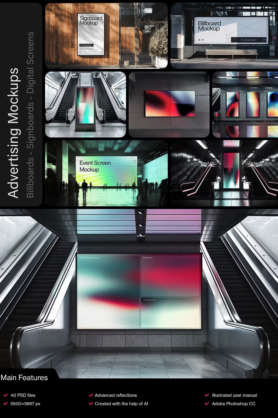- 40 PSD & JPG Files: A versatile set of advertising mockups in high resolution.