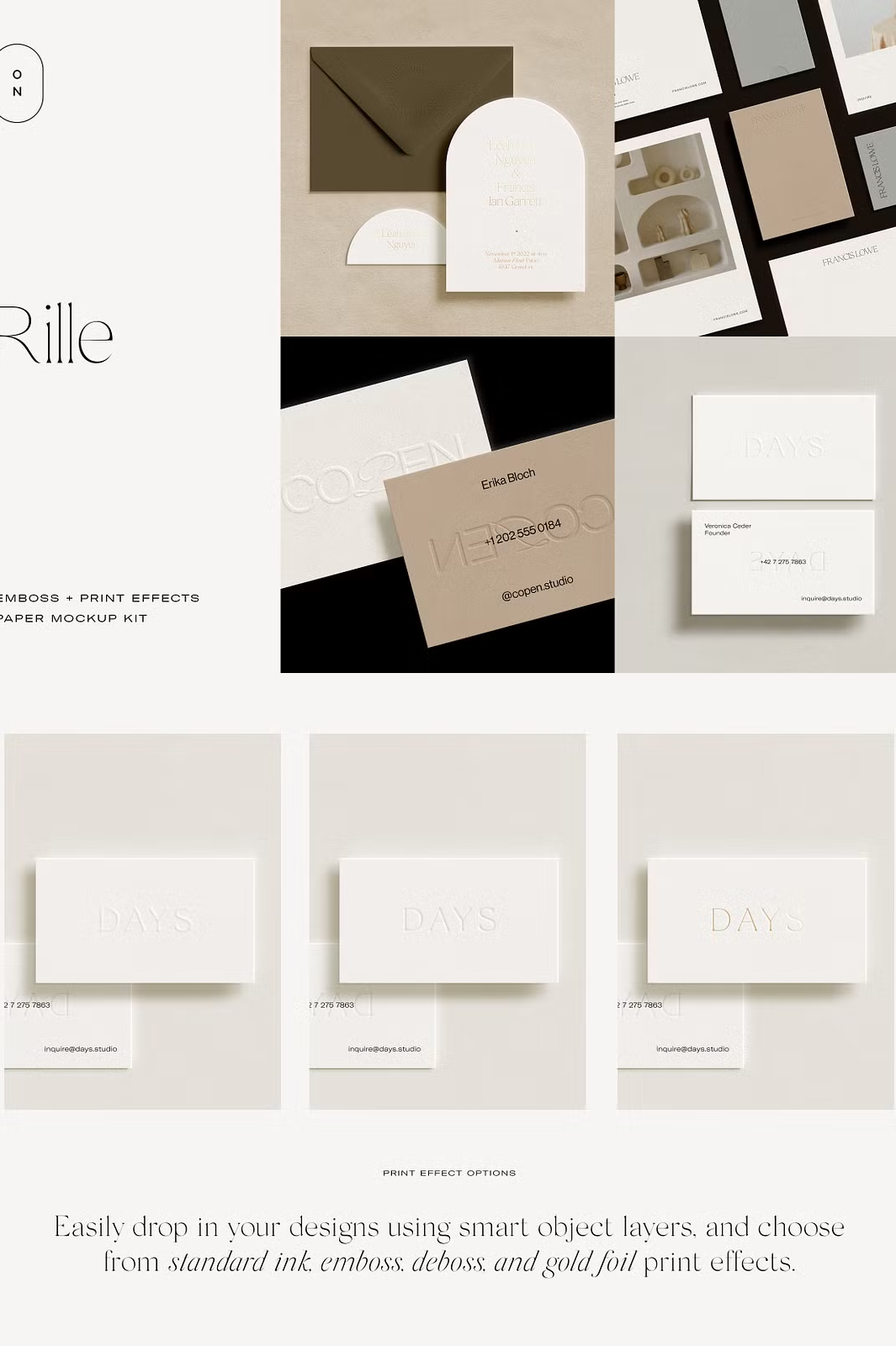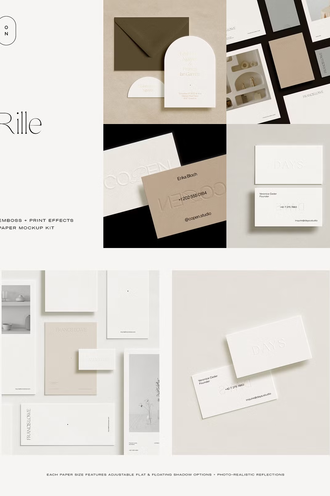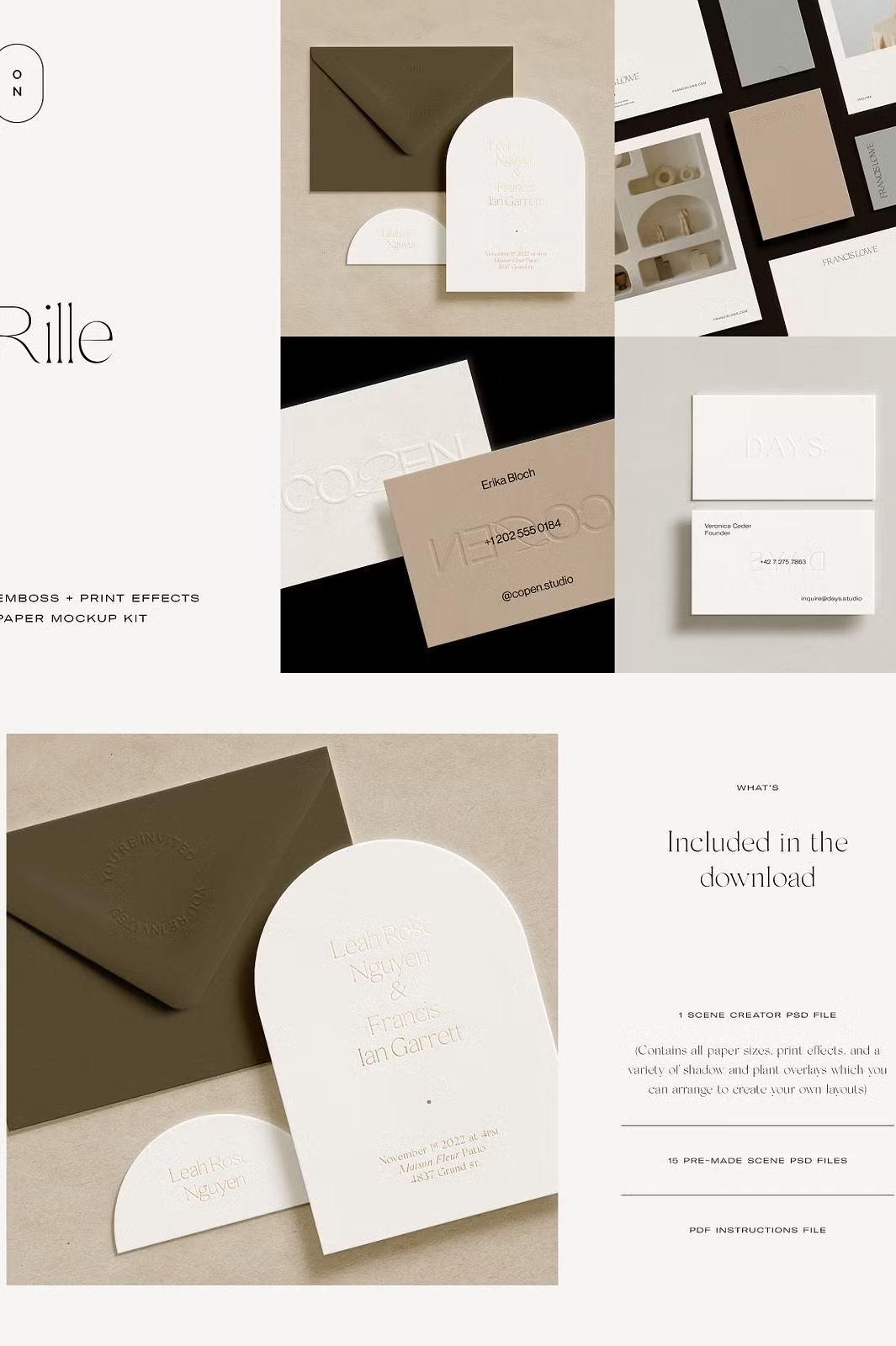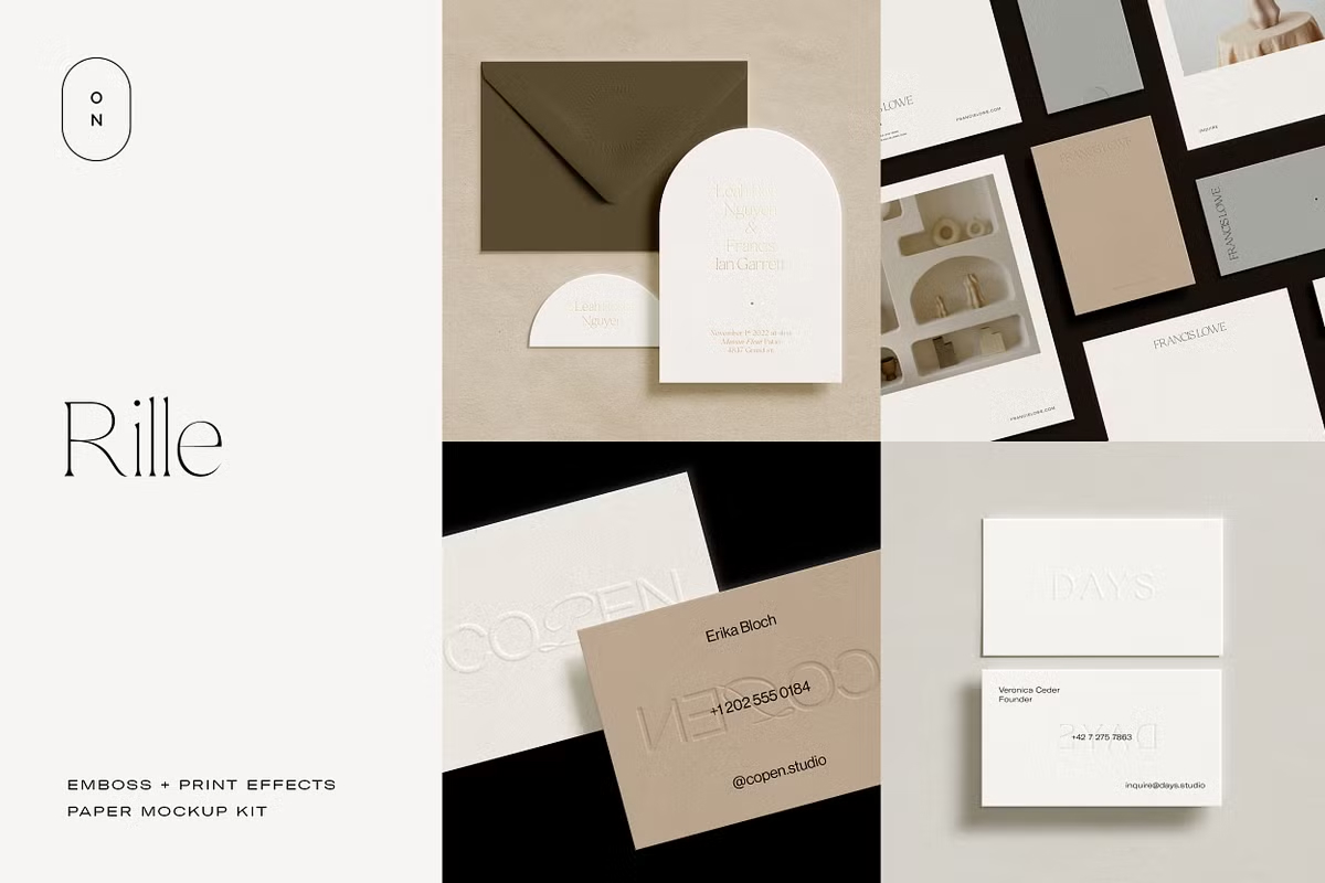 Whether you’re designing **luxurious wedding invitations, business stationery, or creative branding materials**, the Rille mockup kit helps you present your work **professionally and with elegance**. Simply drag and drop your designs into the **smart object layers**, adjust the **print effects and shadows**, and customize the **paper and background colors** to create a **stunning, high-quality mockup**.