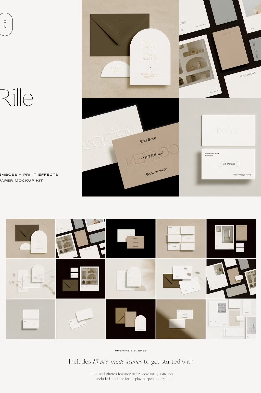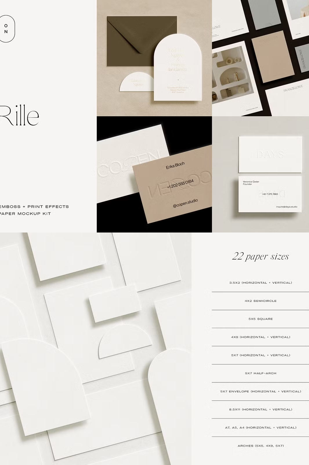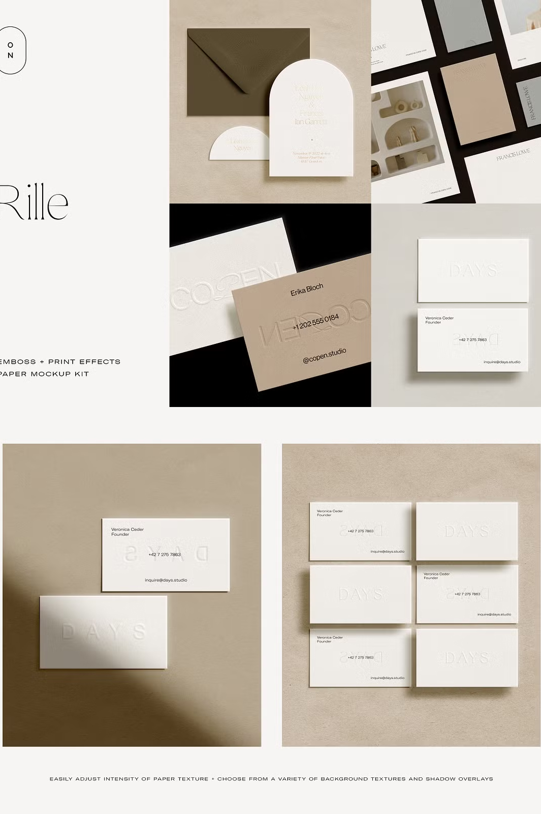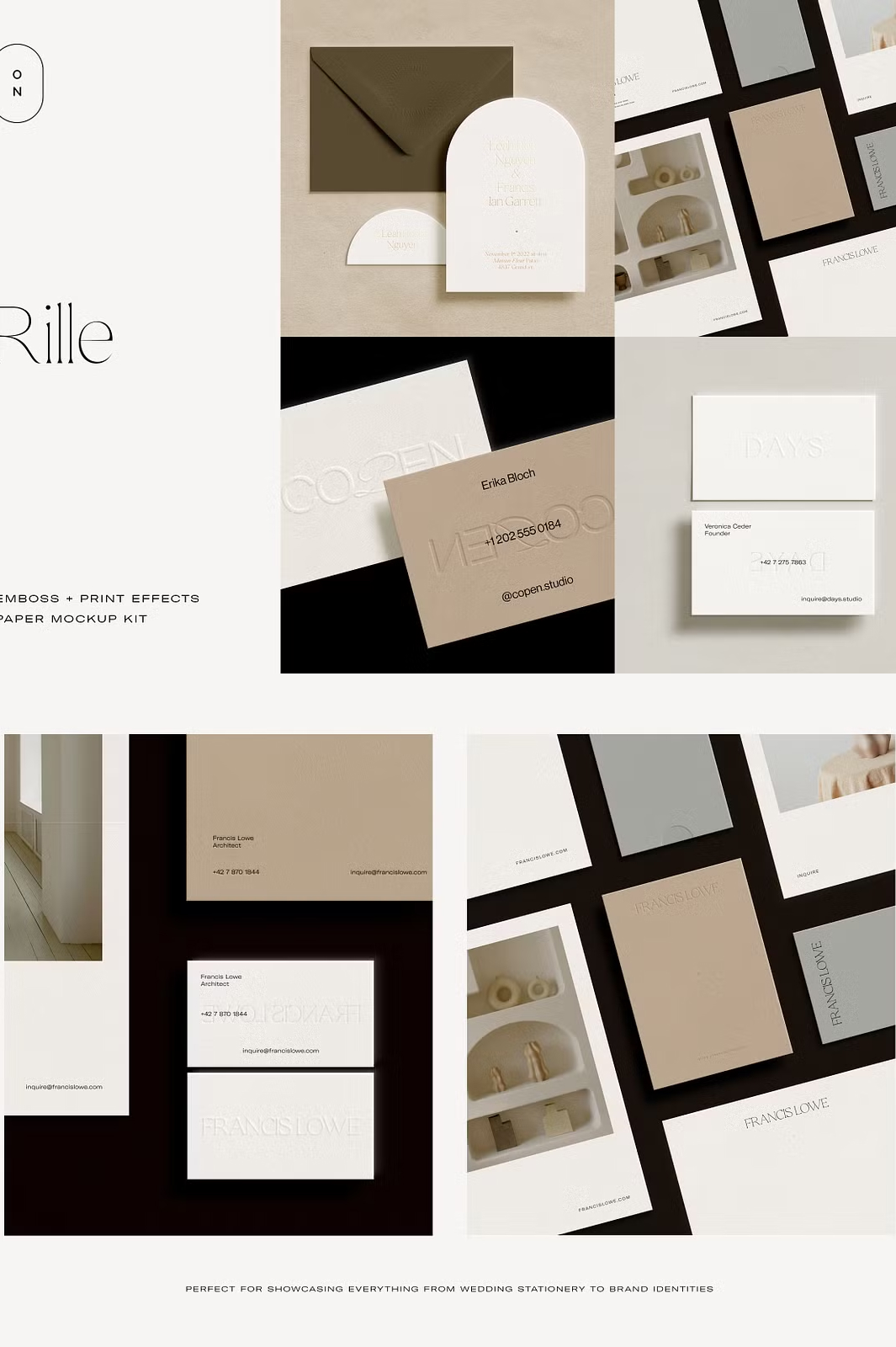 Whether you’re designing **luxurious wedding invitations, business stationery, or creative branding materials**, the Rille mockup kit helps you present your work **professionally and with elegance**. Simply drag and drop your designs into the **smart object layers**, adjust the **print effects and shadows**, and customize the **paper and background colors** to create a **stunning, high-quality mockup**.