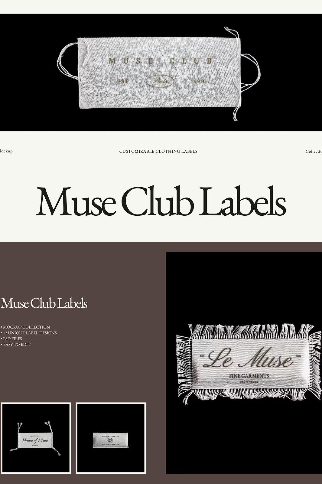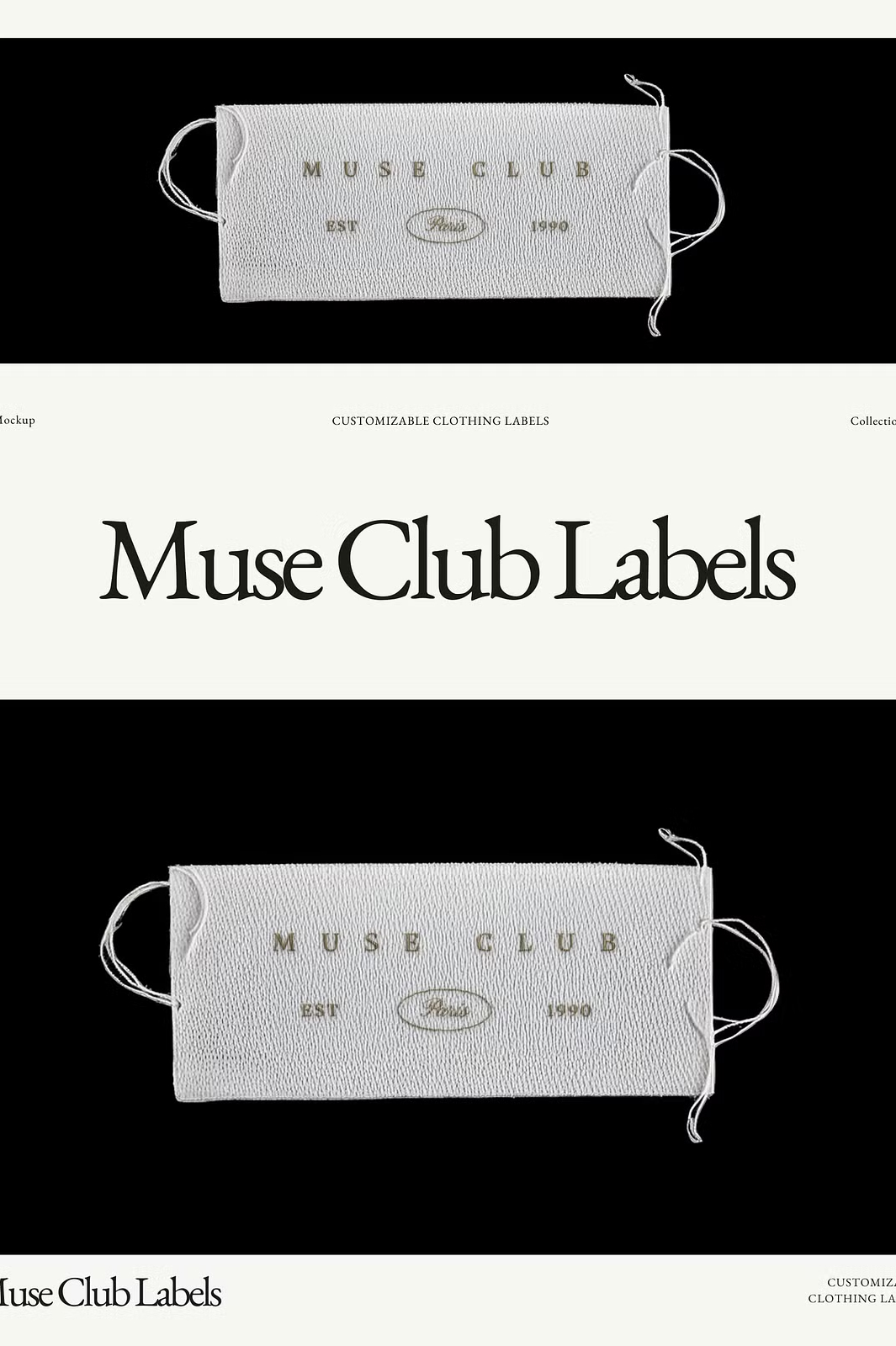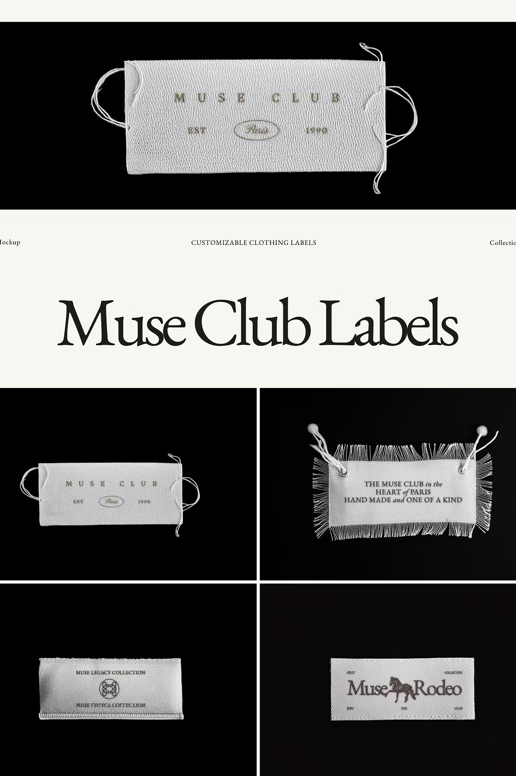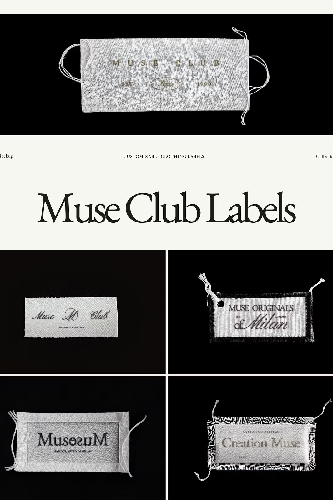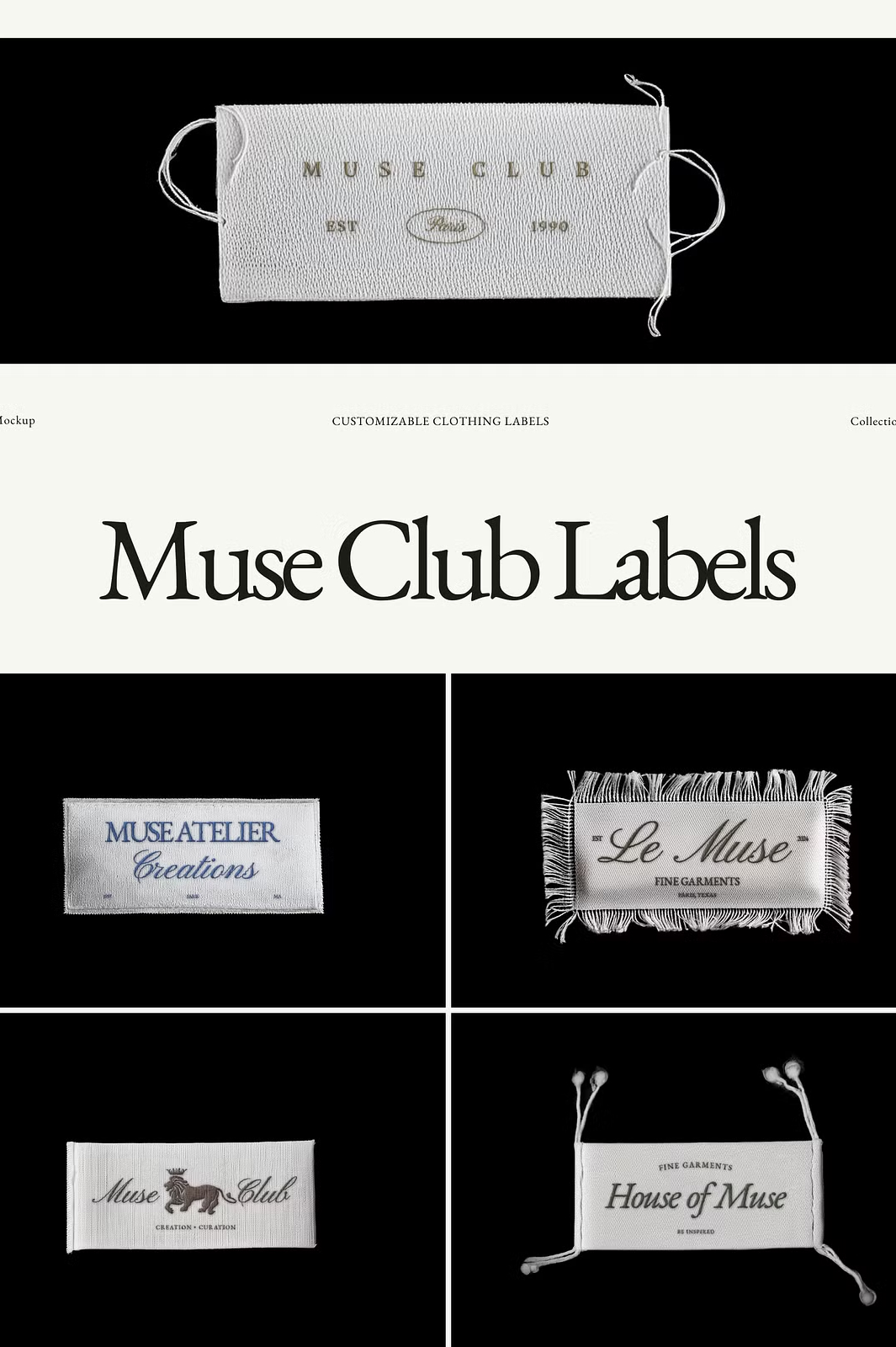 Showcase your fashion brand’s identity with the Muse Club Woven Garment Label Mockups. This premium collection of 12 high-quality woven label mockups is designed to give your logo or design a realistic, professional, and stylish presentation. Each label is set against a black background, emphasizing its intricate embroidery effect.