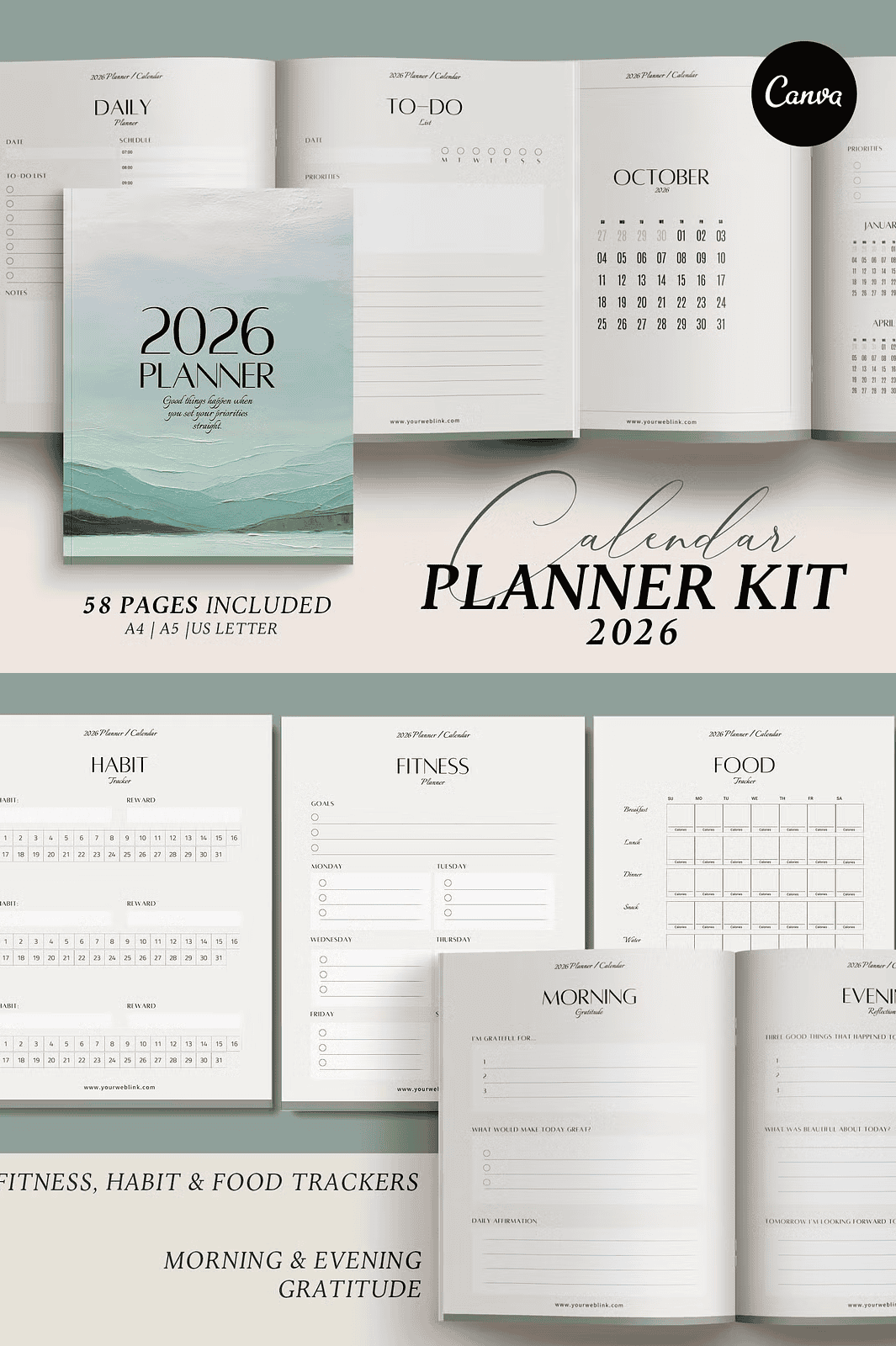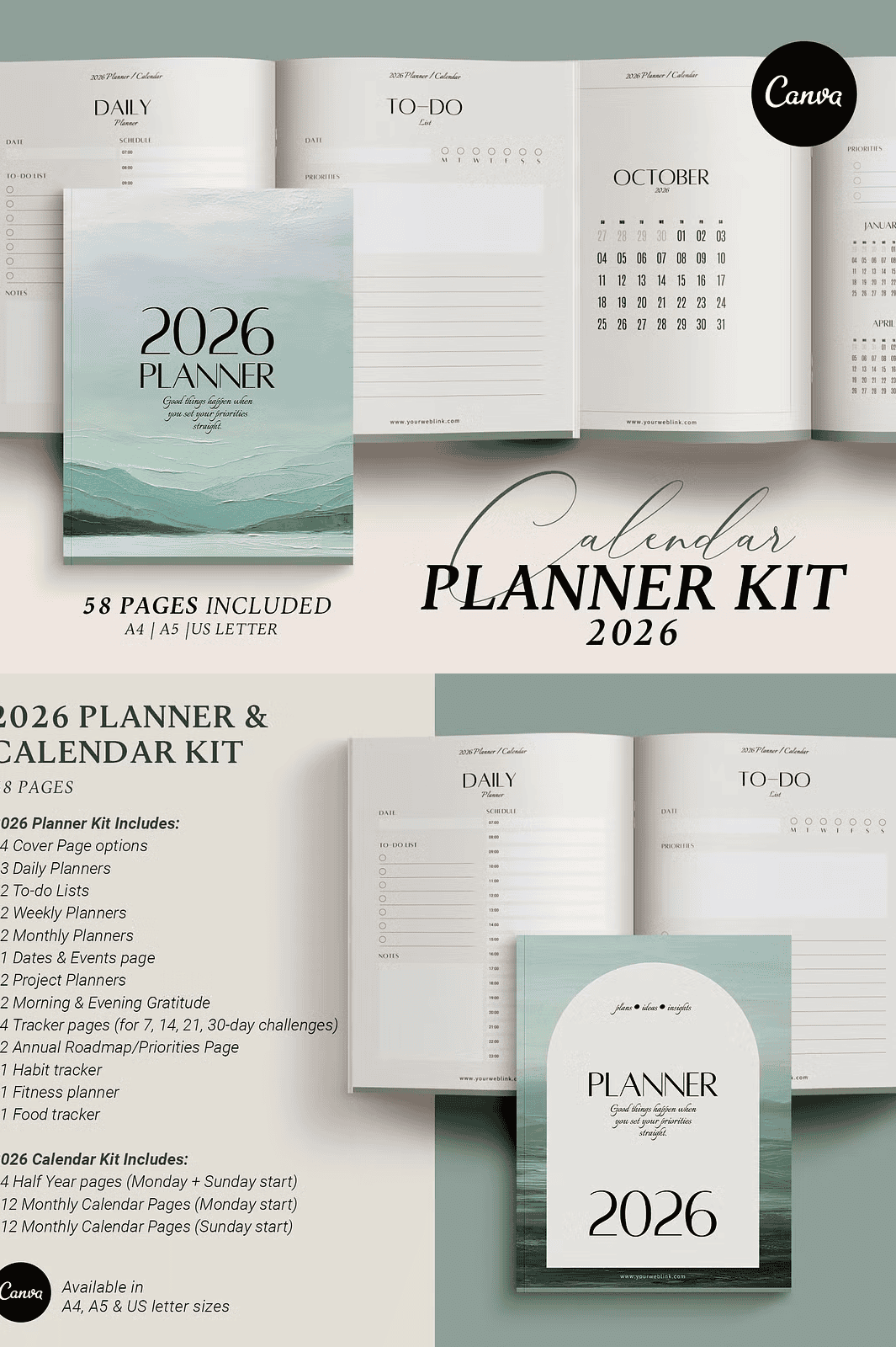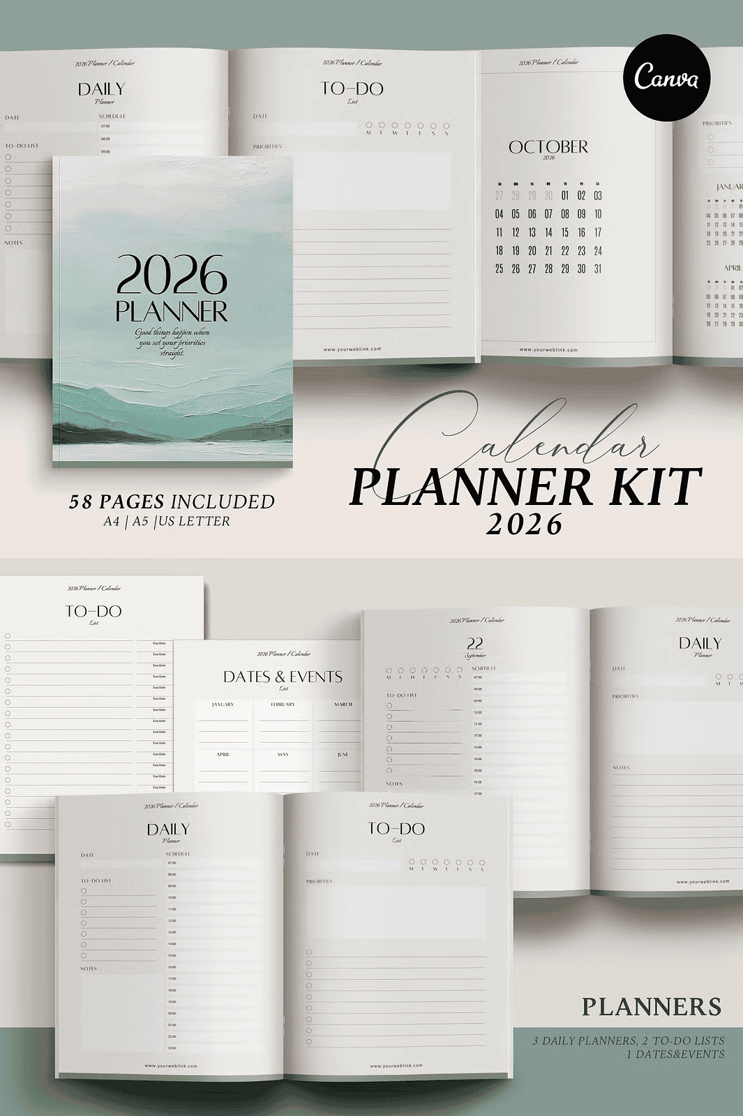 Elevate your organization and productivity with the **2026 Canva Planner & Calendar Kit**—a sleek, highly customizable solution built for both personal and professional use. Whether you’re a busy entrepreneur, a student, a coach, or someone who thrives on structure, this fully editable planner empowers you to design a schedule that reflects your unique lifestyle and goals.