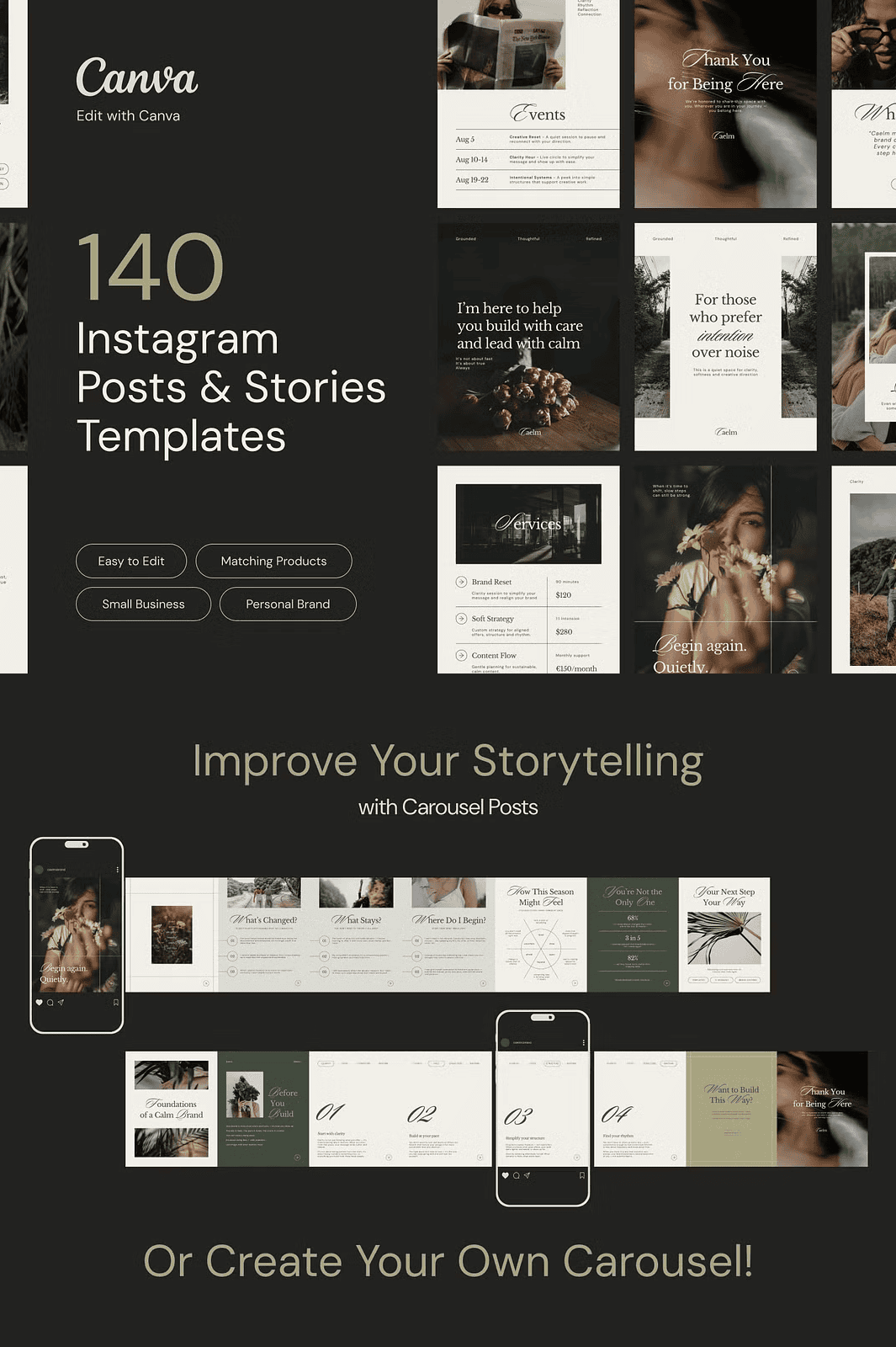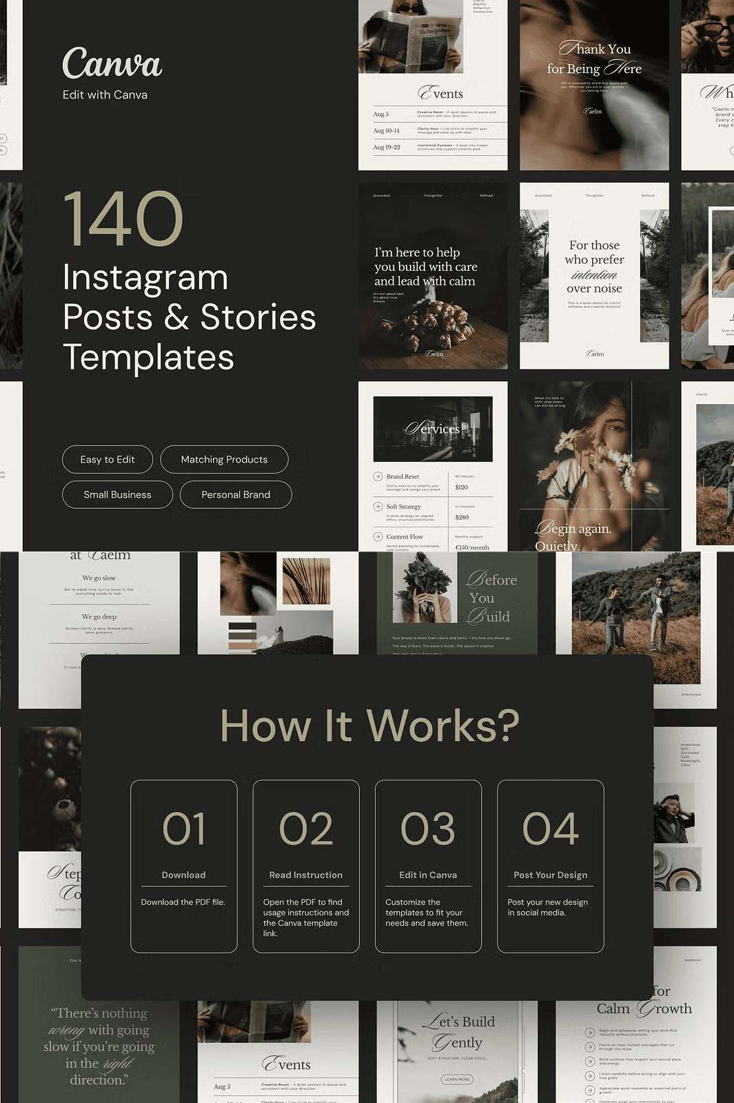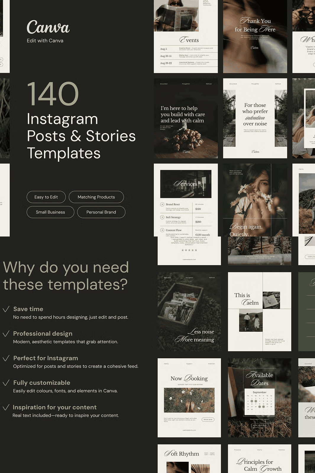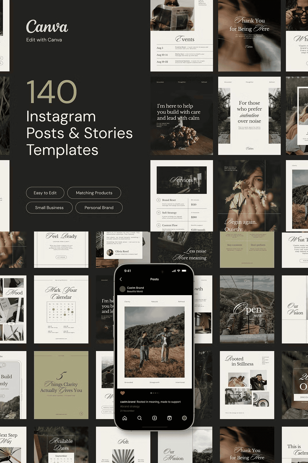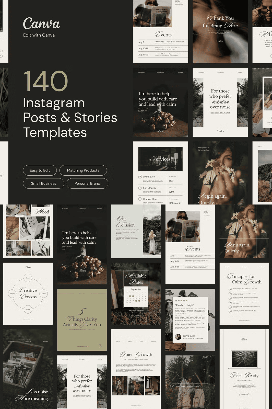 Stop sacrificing your peace of mind for content creation. If you’re a service-based professional, creative, or expert seeking clarity and elegance, **CAELM** is your strategic design partner. This fully editable Canva template kit was meticulously crafted for those who value stillness, intention, and refined simplicity. With 140 thoughtfully designed layouts—70 Instagram posts and 70 Instagram stories—you’ll establish a visually cohesive, emotionally grounded presence that reflects your authenticity and expertise.