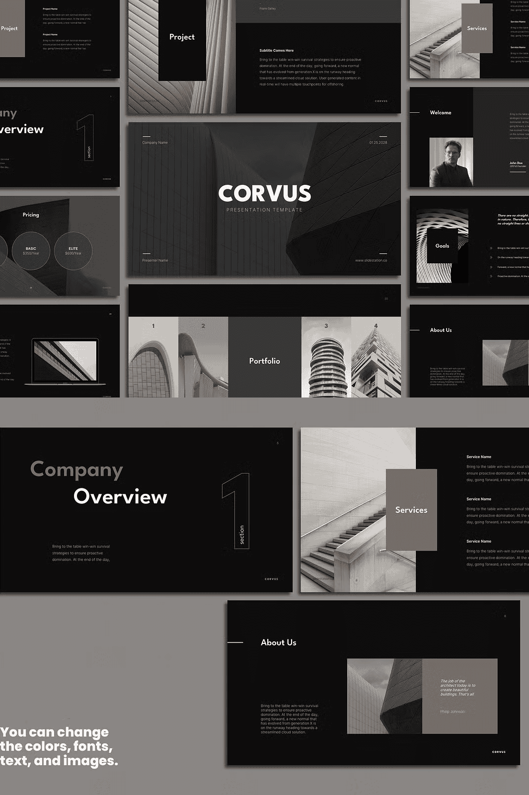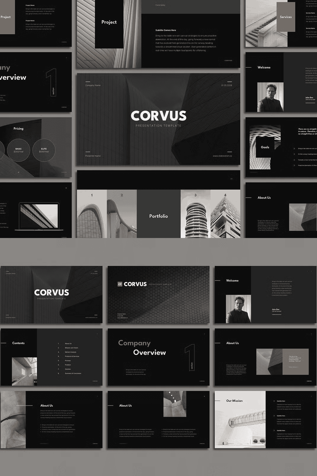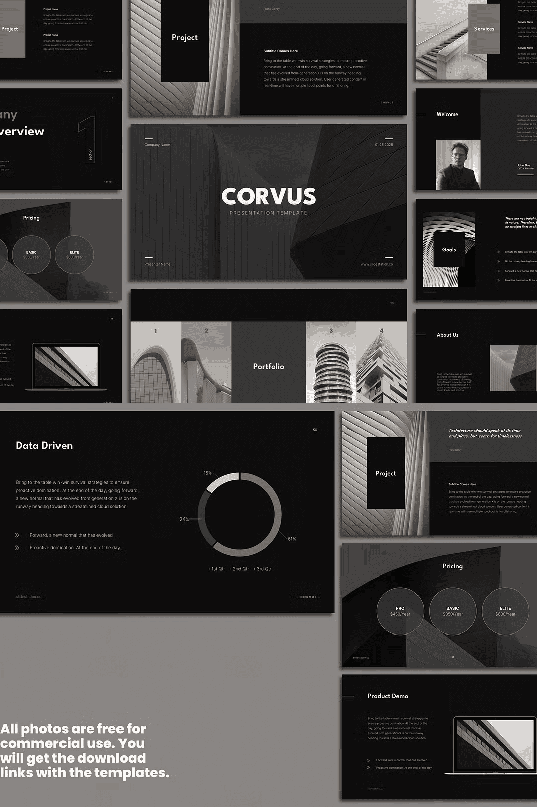 The stunning visuals in the preview are not stock—but real project examples designed to showcase Corvus at its peak. You can use these photographs **in your own presentations** with no additional licensing. The download links to the images are provided in the Readme file.