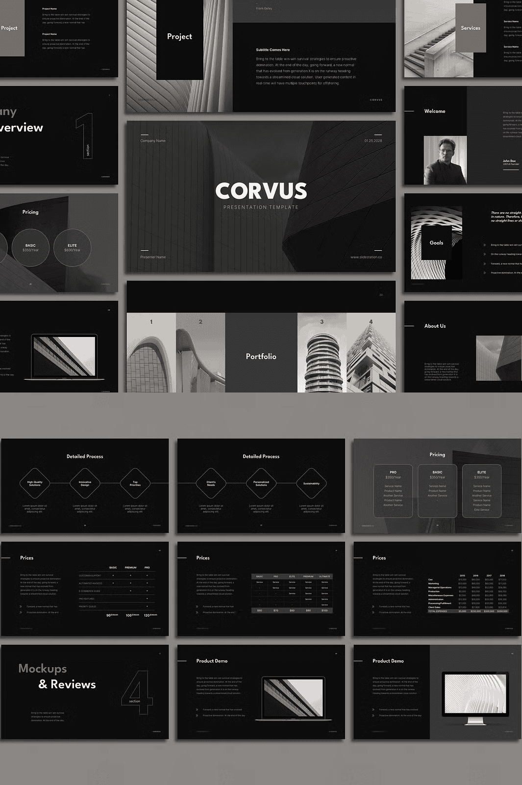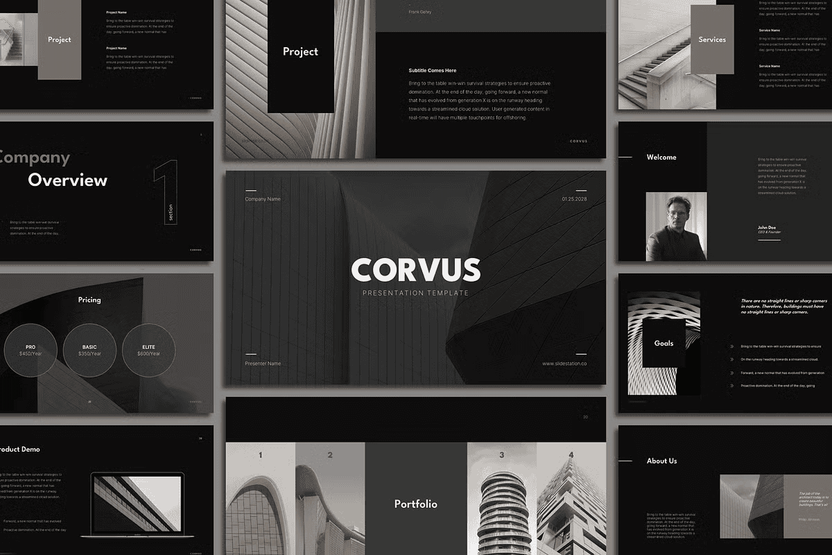 Take your presentations further with our Corvus Portfolio Template, designed for showcasing completed projects with dynamic galleries, project summaries, and interactive client highlights.