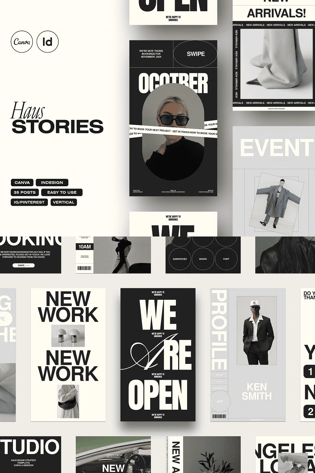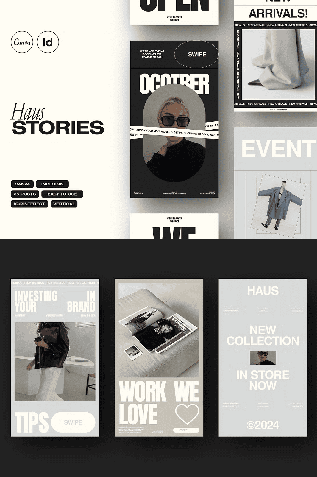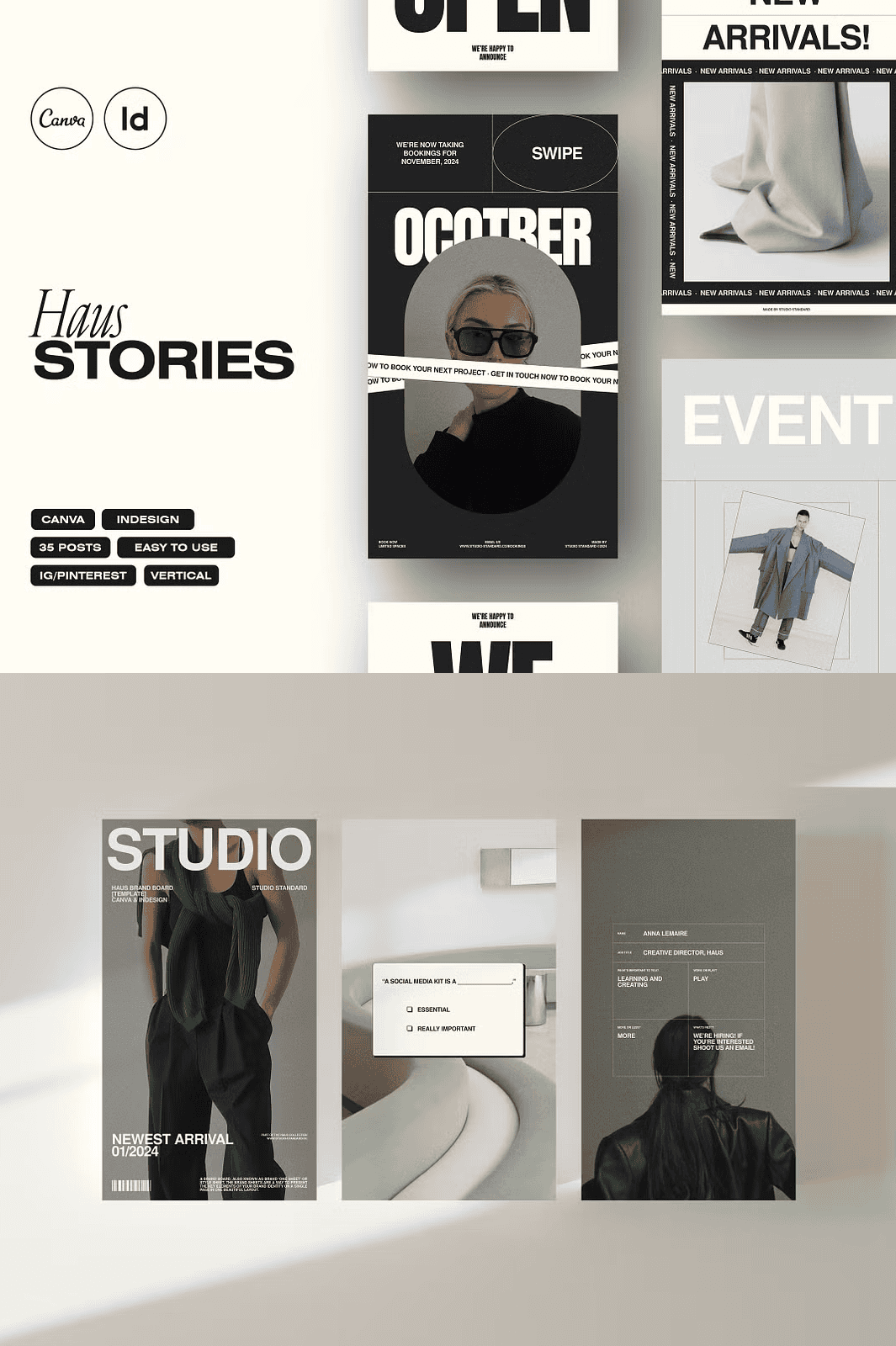Designed with speed and flexibility in mind, the HAUS Stories Kit empowers you to generate visually stunning, brand-consistent stories across Instagram, Facebook, and Pinterest — all in vertical 1080x1920px format. Built for Canva and Adobe InDesign, this kit gives you the freedom to work in your preferred platform while maintaining consistent design quality.