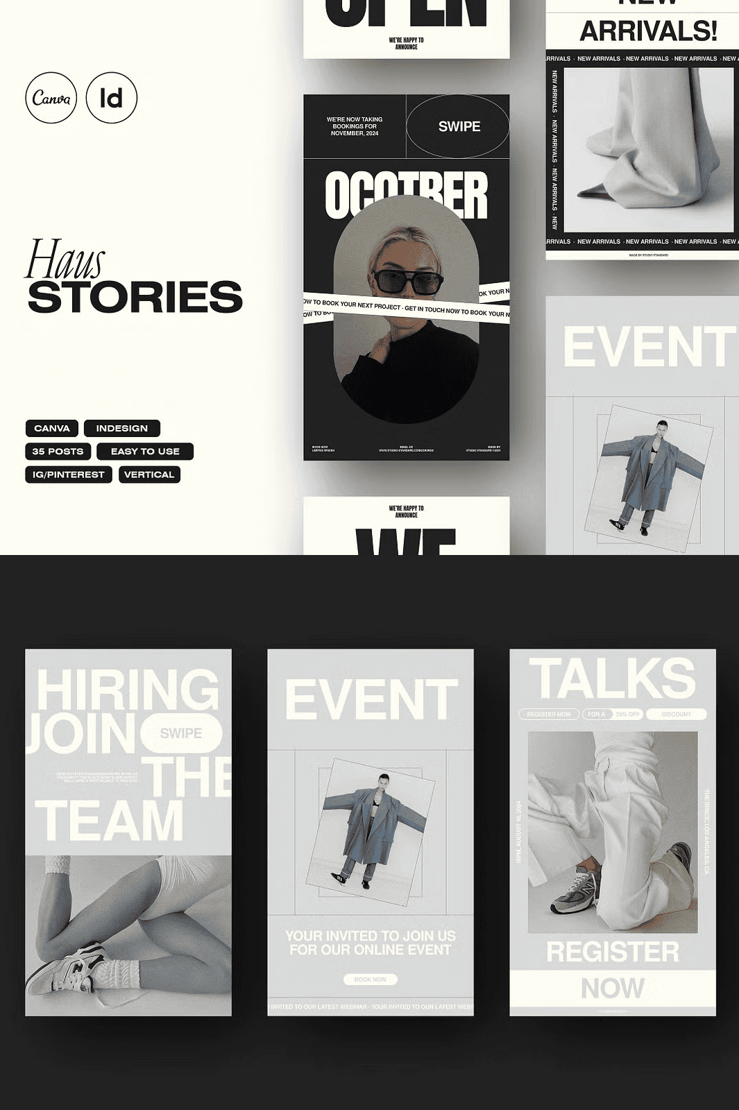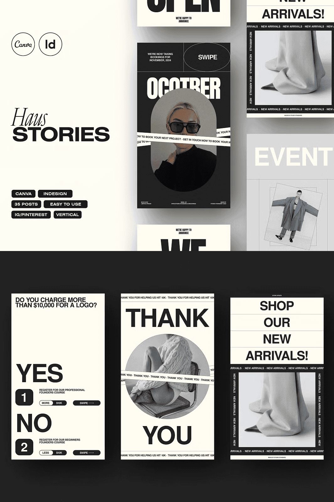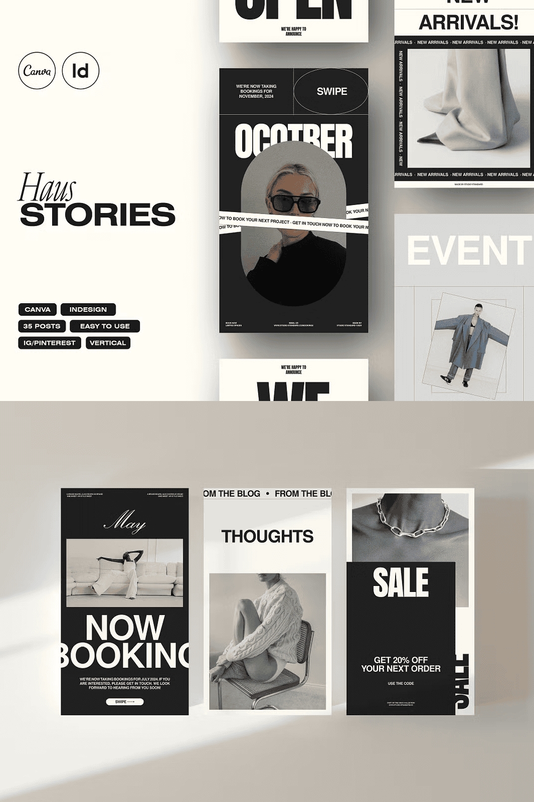 Designed with speed and flexibility in mind, the HAUS Stories Kit empowers you to generate visually stunning, brand-consistent stories across Instagram, Facebook, and Pinterest — all in vertical 1080x1920px format. Built for Canva and Adobe InDesign, this kit gives you the freedom to work in your preferred platform while maintaining consistent design quality.