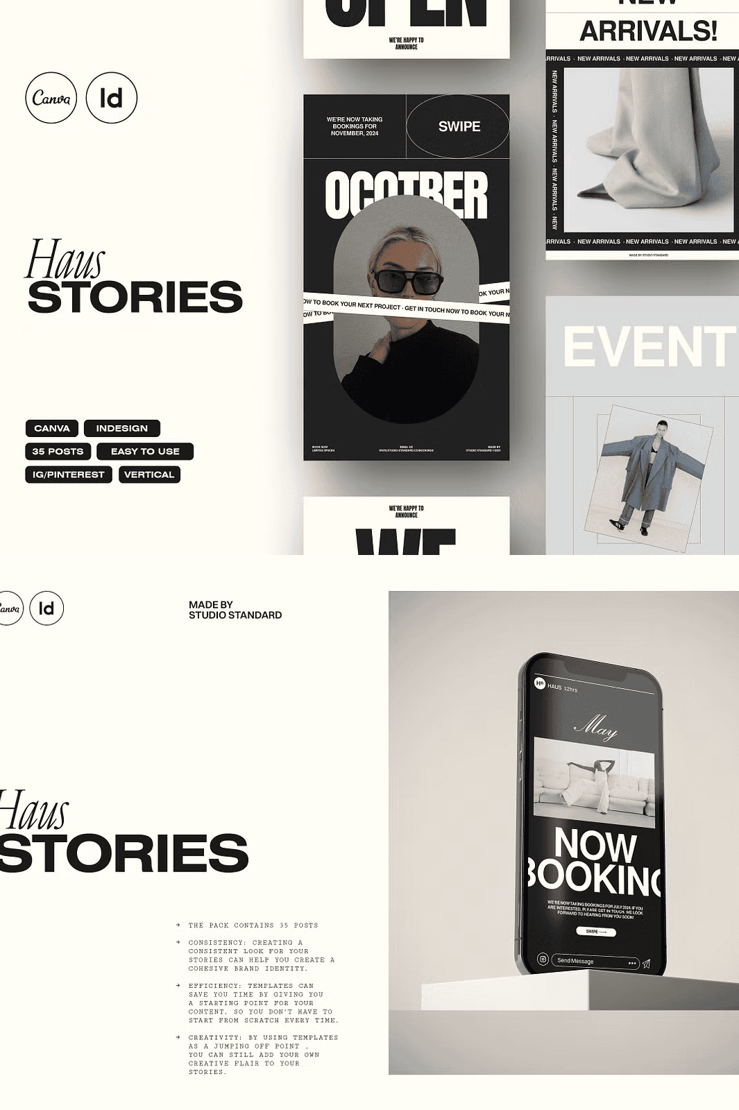 The HAUS Stories Kit is not an isolated tool — it’s part of the larger Haus Collection by Studio Standard. This means you can seamlessly pair it with other templates like the HAUS Post Kit, HAUS Banner Kit, and HAUS Presentation for a unified brand aesthetic across all digital touchpoints.