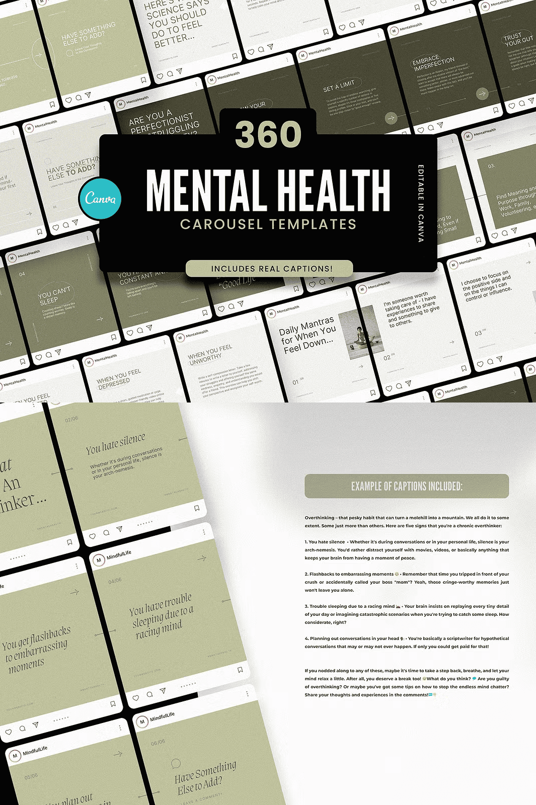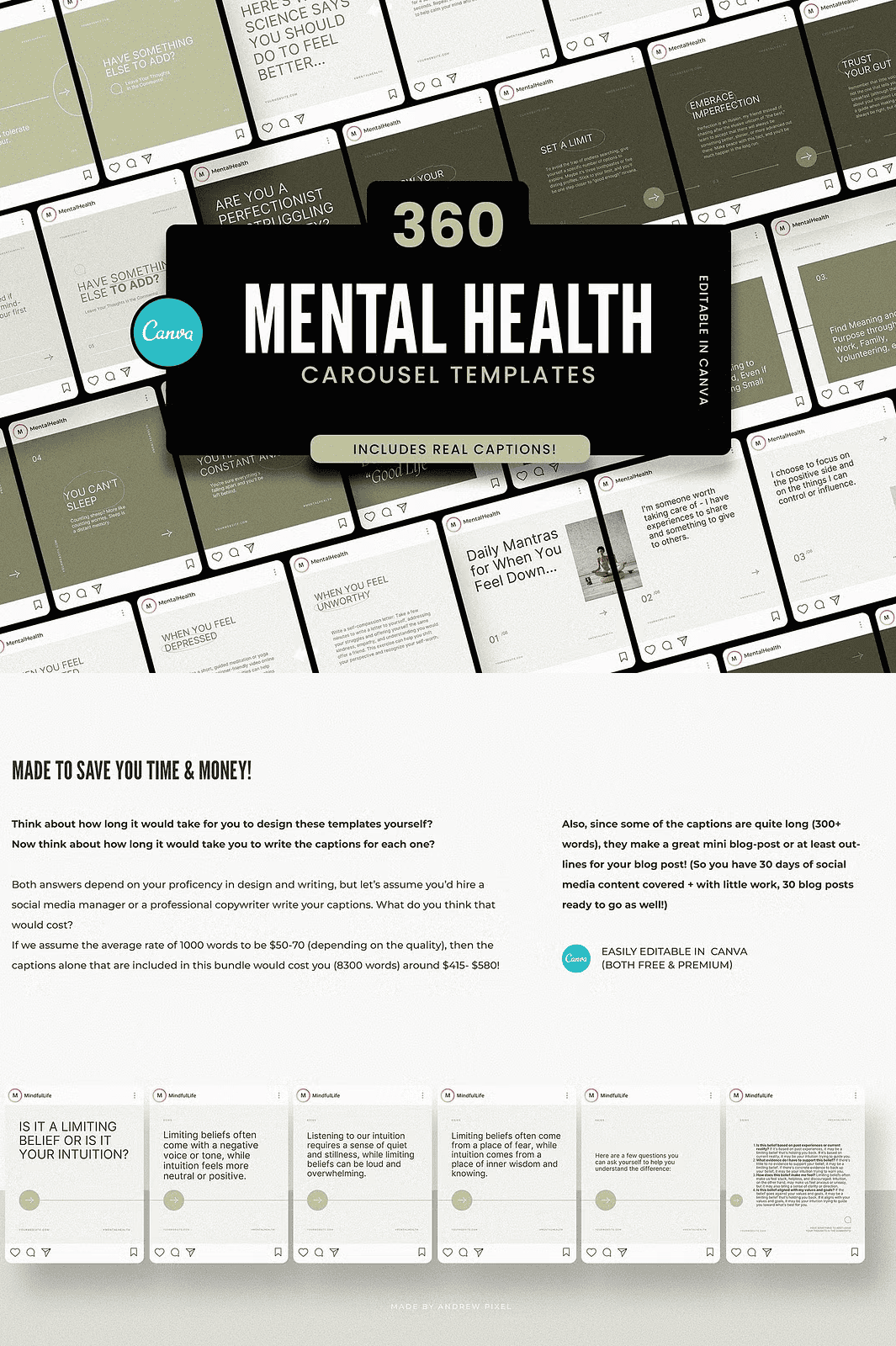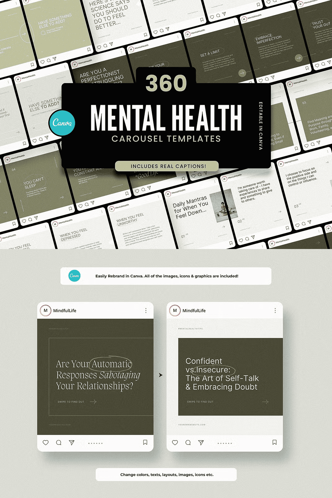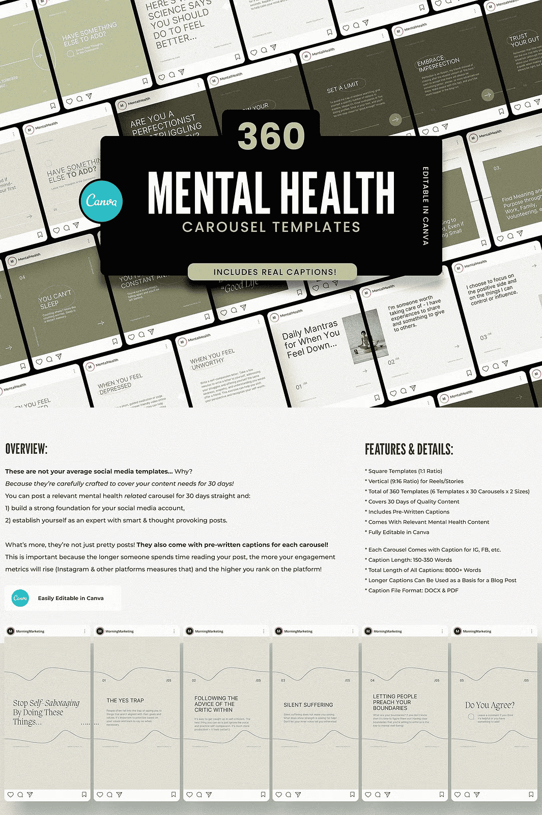 These are not your average social media templates. They are precision-engineered content assets designed to transform your Instagram from a passive feed into a powerful platform for influence, education, and connection. This bundle is the ultimate solution for mental health practitioners, coaches, advocates, and brands ready to establish themselves as trusted authorities in a crucial and rapidly growing niche. With 360+ meticulously crafted templates and over 8000 words of pre-written, expert-level captions, you can confidently post high-quality, insightful content for 30 days straight—setting a foundation for lasting growth and engagement.